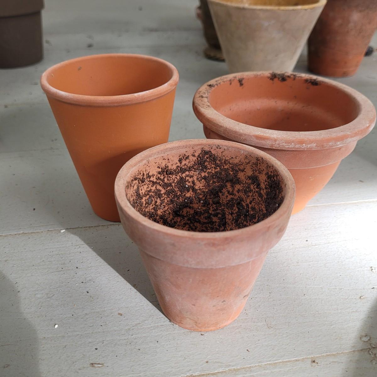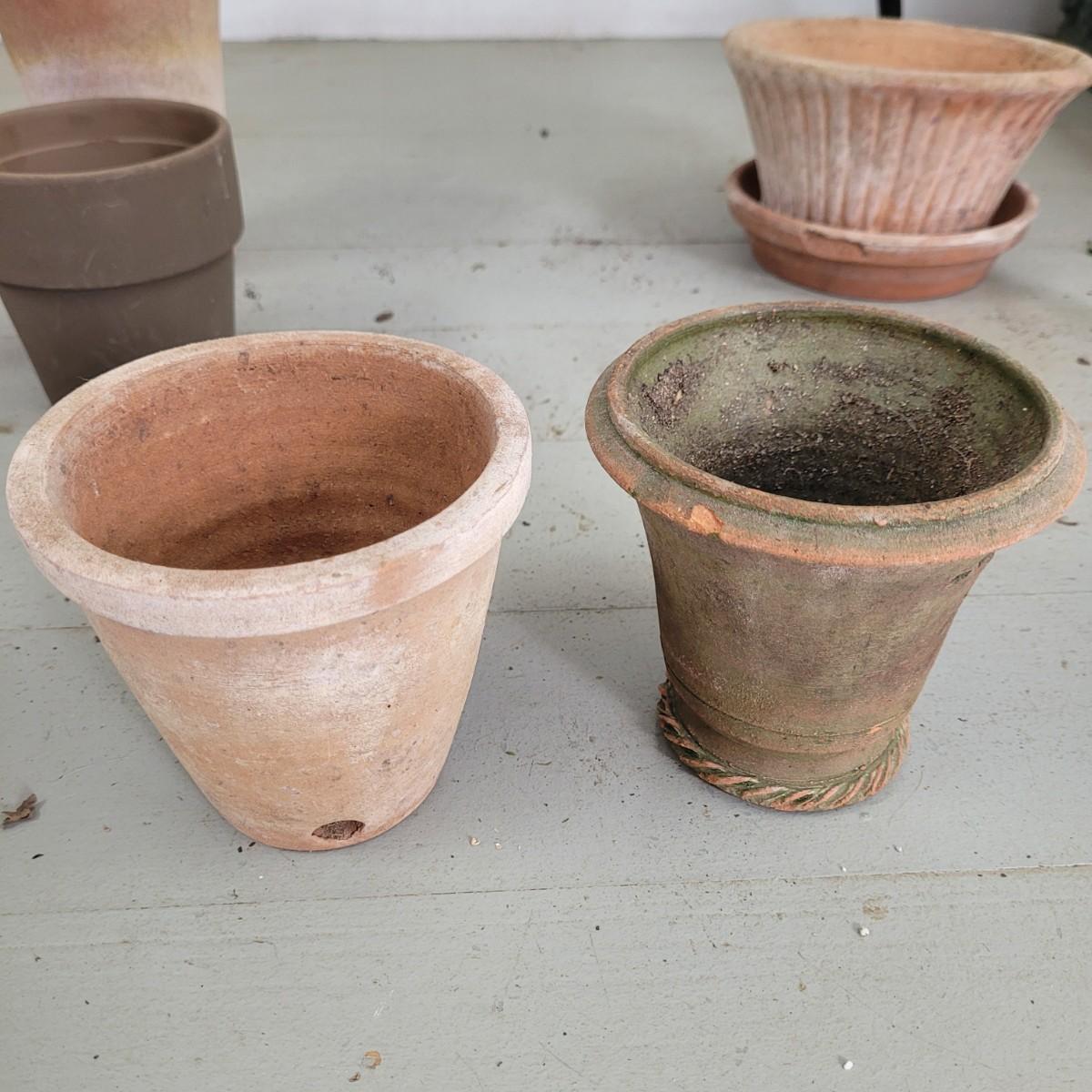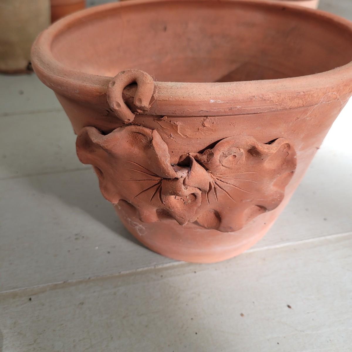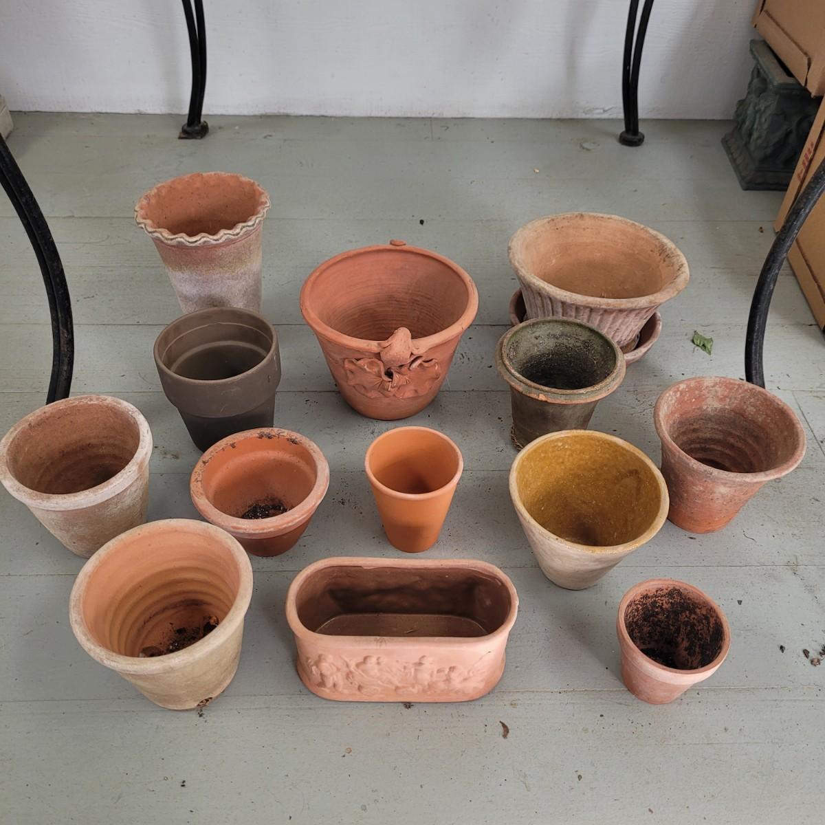 A large variety of terra cotta planters, including a signed pot with a sculpted frog motif. Signature reads "Kitty Bright NYC". Not all pots have drainage holes (see photos). Frog pot measures approximately 7.5DIA” x 6”H. Local pickup only.