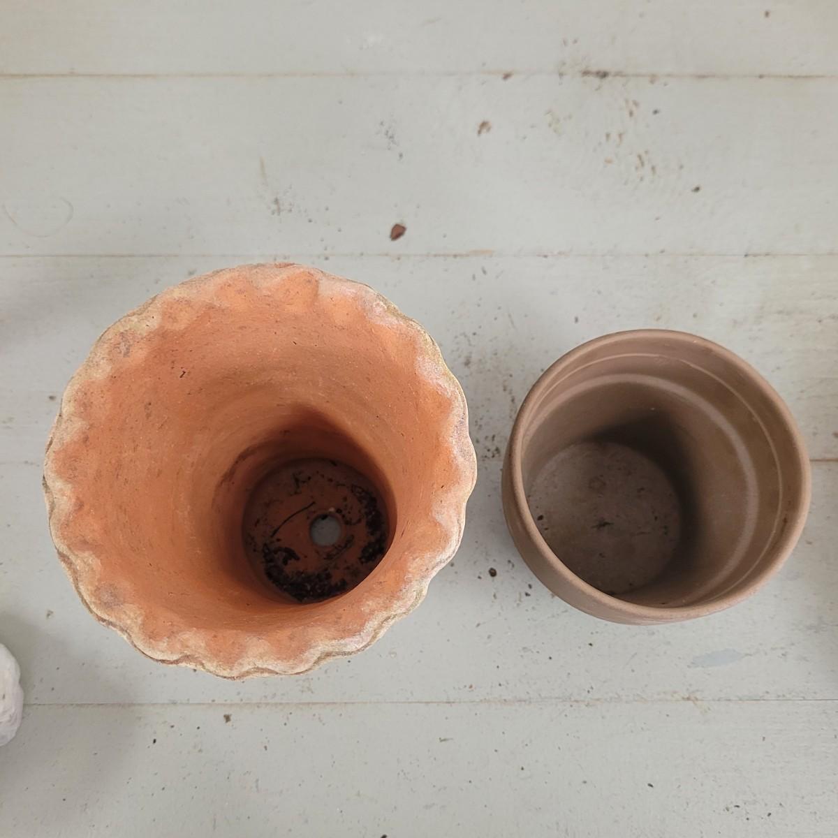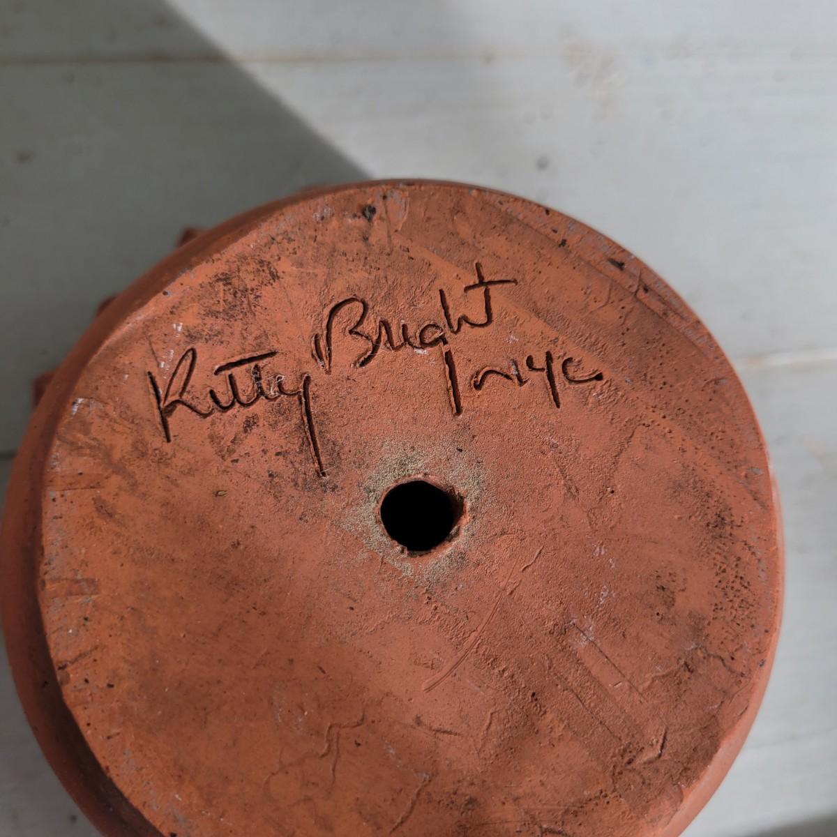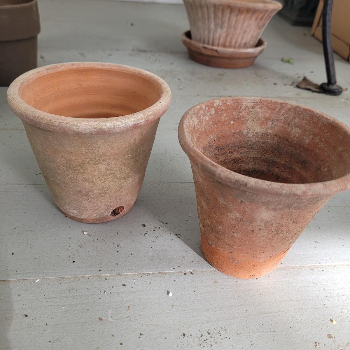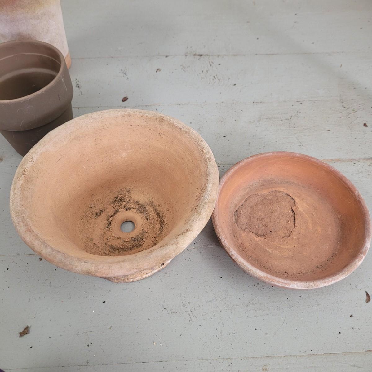 A large variety of terra cotta planters, including a signed pot with a sculpted frog motif. Signature reads "Kitty Bright NYC". Not all pots have drainage holes (see photos). Frog pot measures approximately 7.5DIA” x 6”H. Local pickup only.