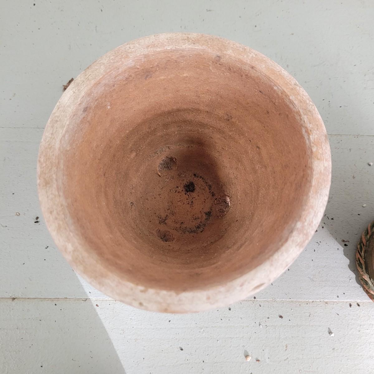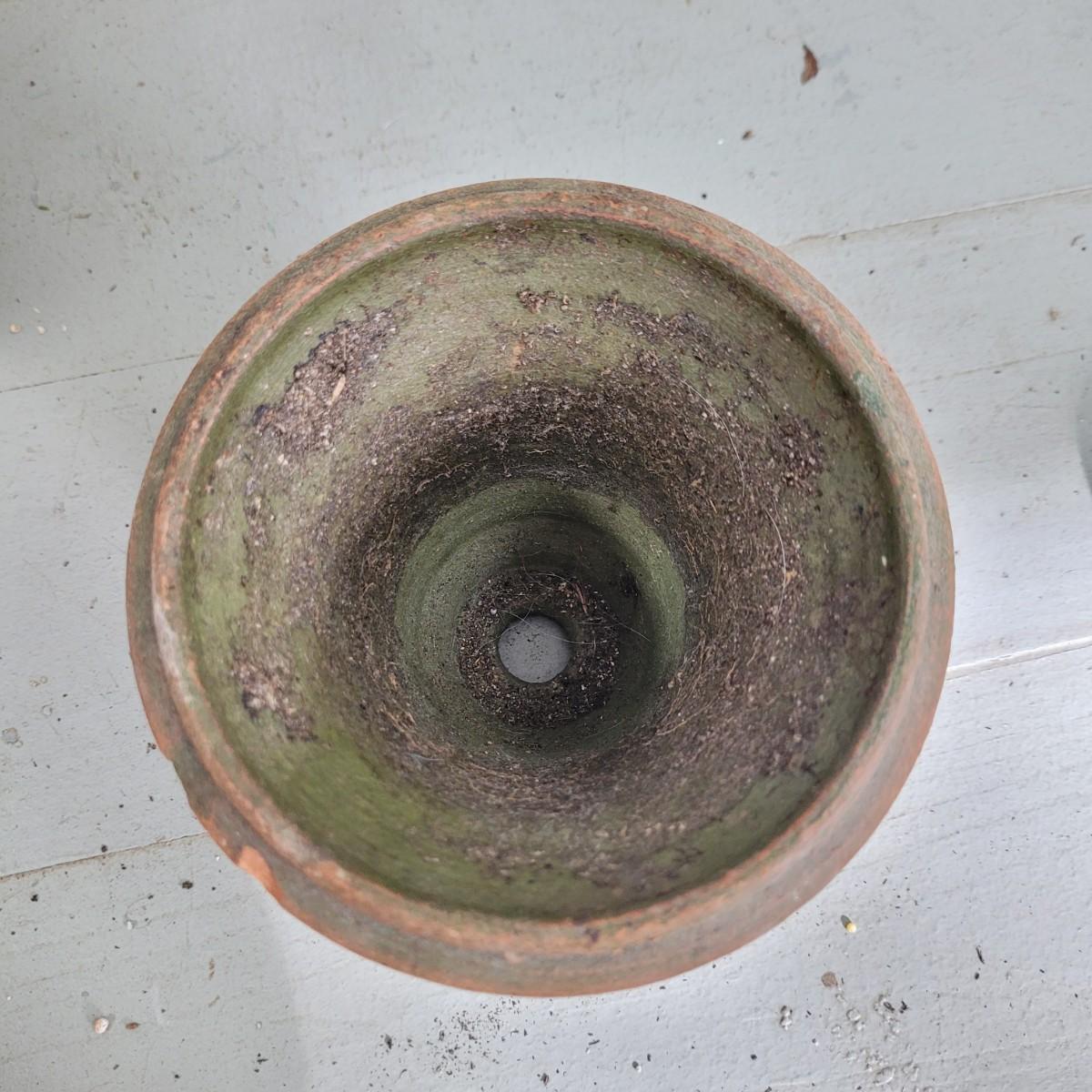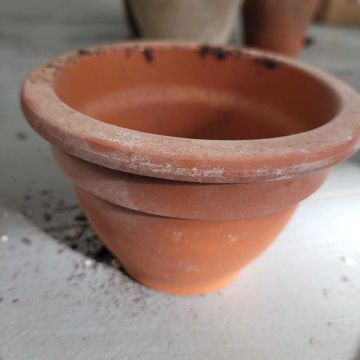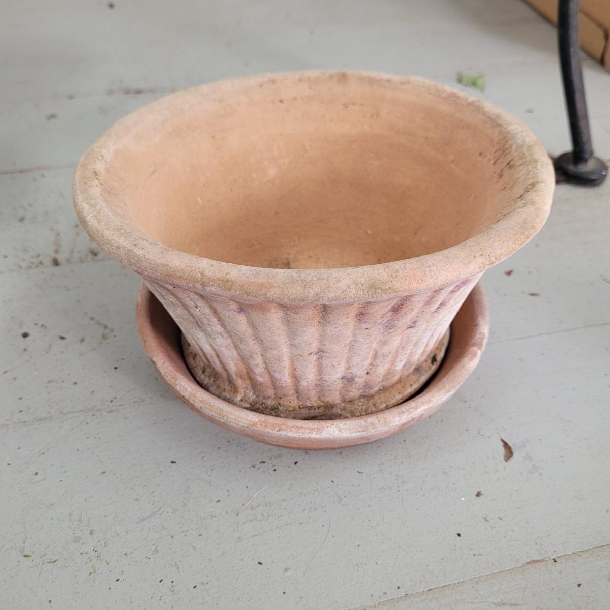 A large variety of terra cotta planters, including a signed pot with a sculpted frog motif. Signature reads "Kitty Bright NYC". Not all pots have drainage holes (see photos). Frog pot measures approximately 7.5DIA” x 6”H. Local pickup only.