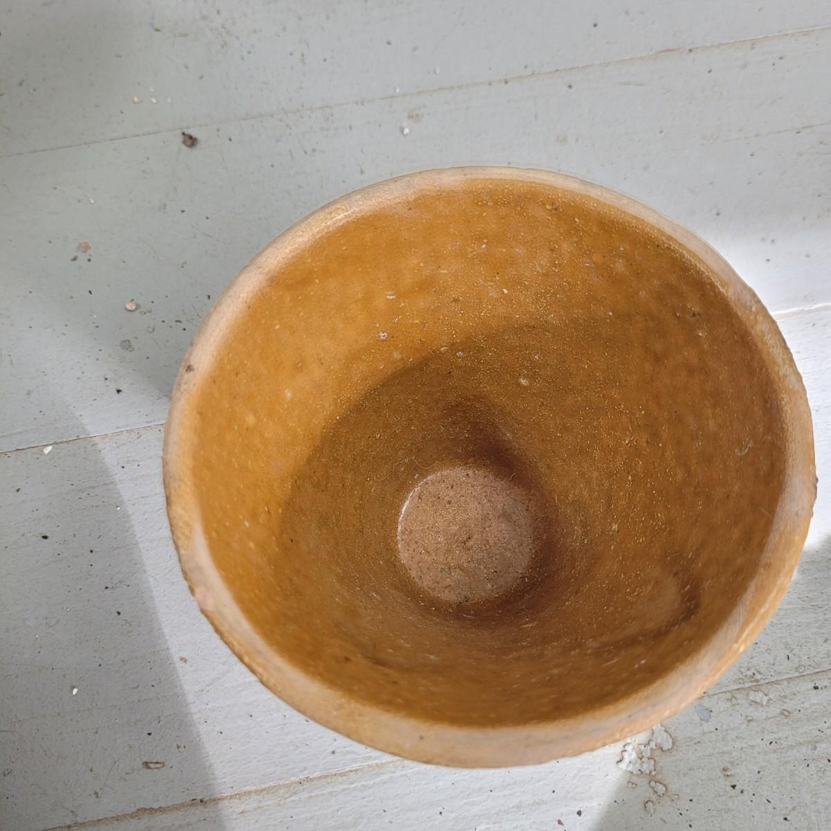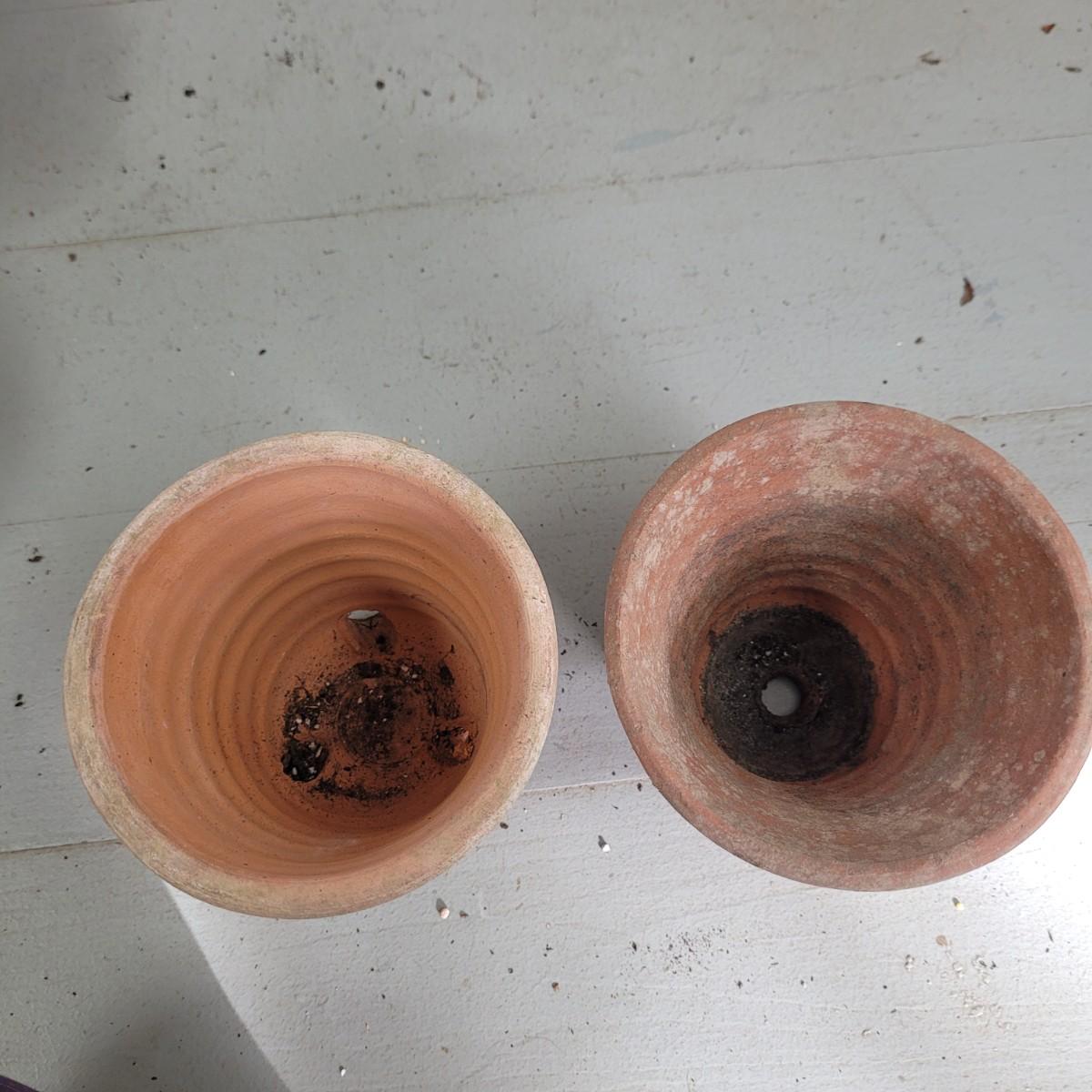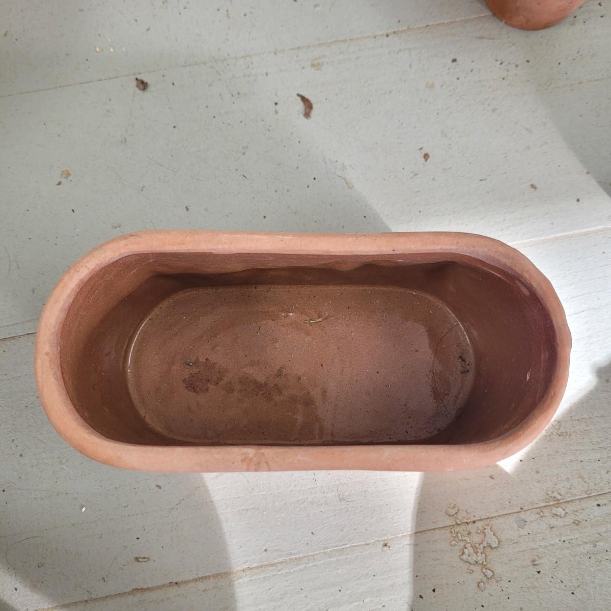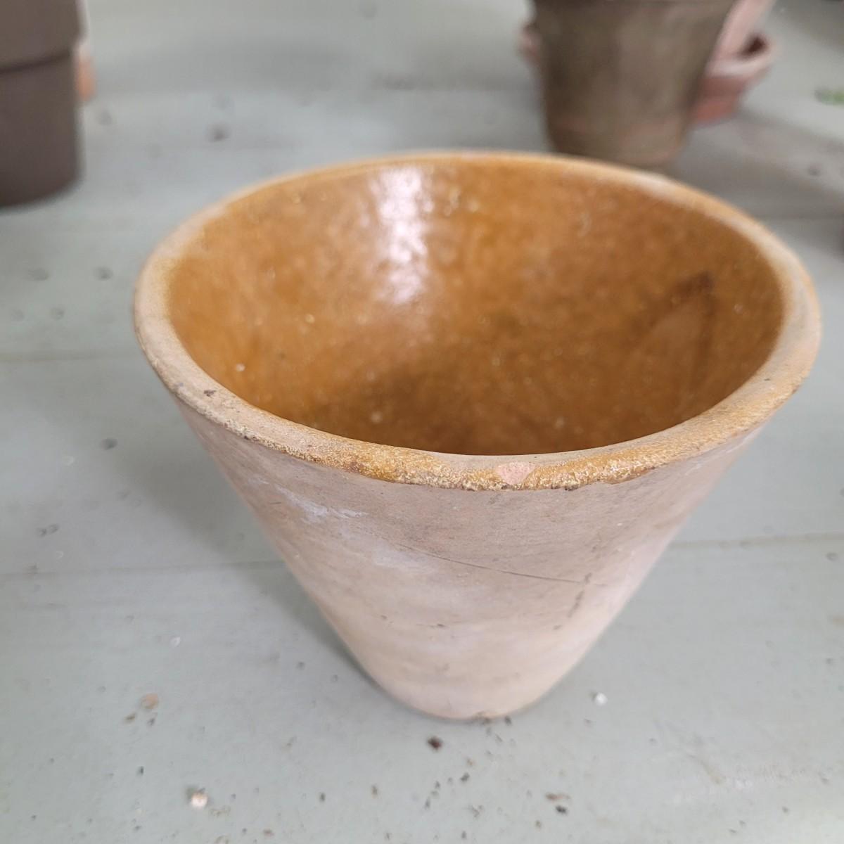 A large variety of terra cotta planters, including a signed pot with a sculpted frog motif. Signature reads "Kitty Bright NYC". Not all pots have drainage holes (see photos). Frog pot measures approximately 7.5DIA” x 6”H. Local pickup only.