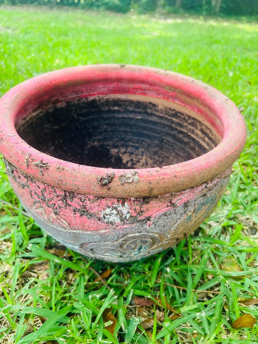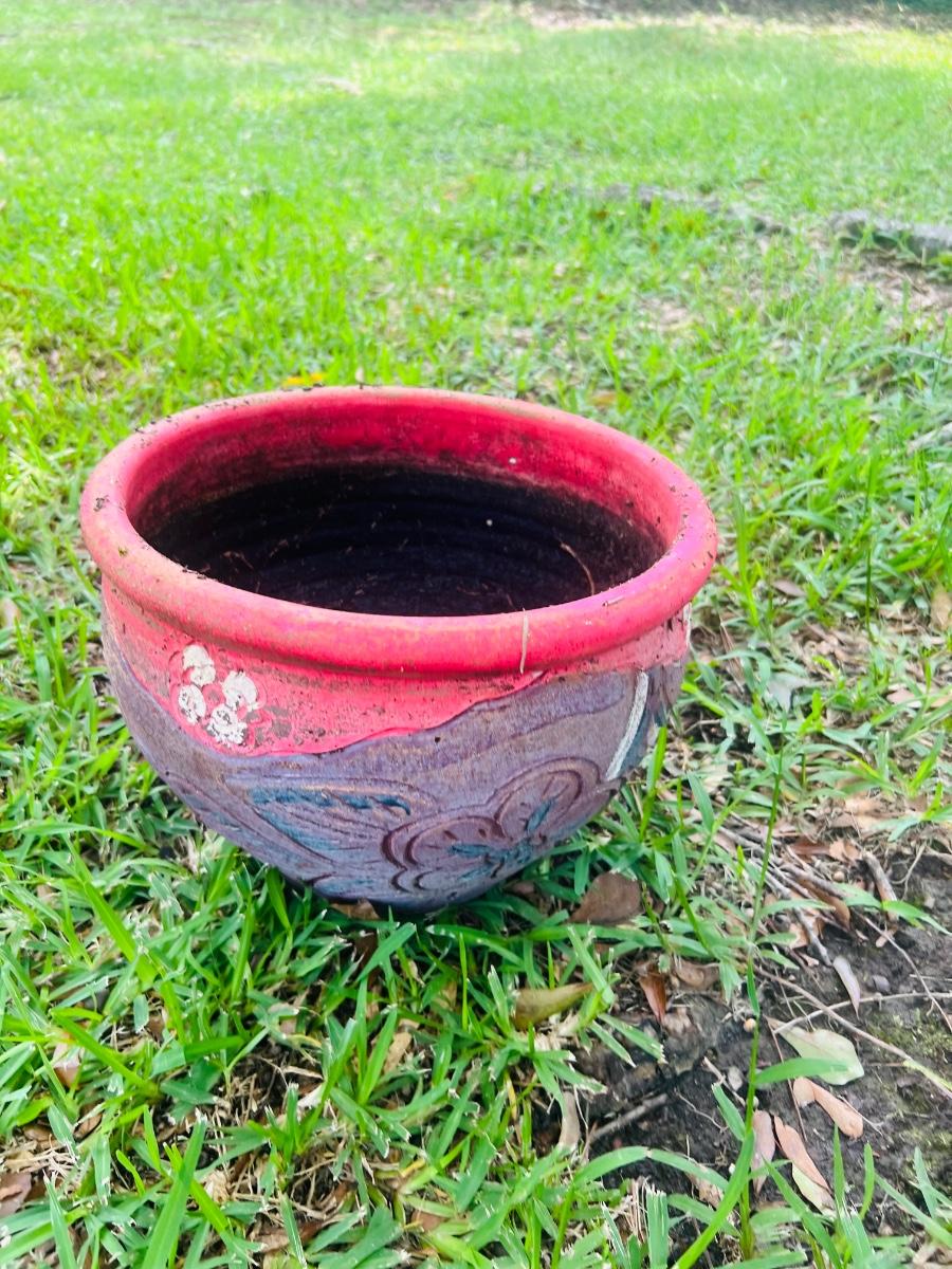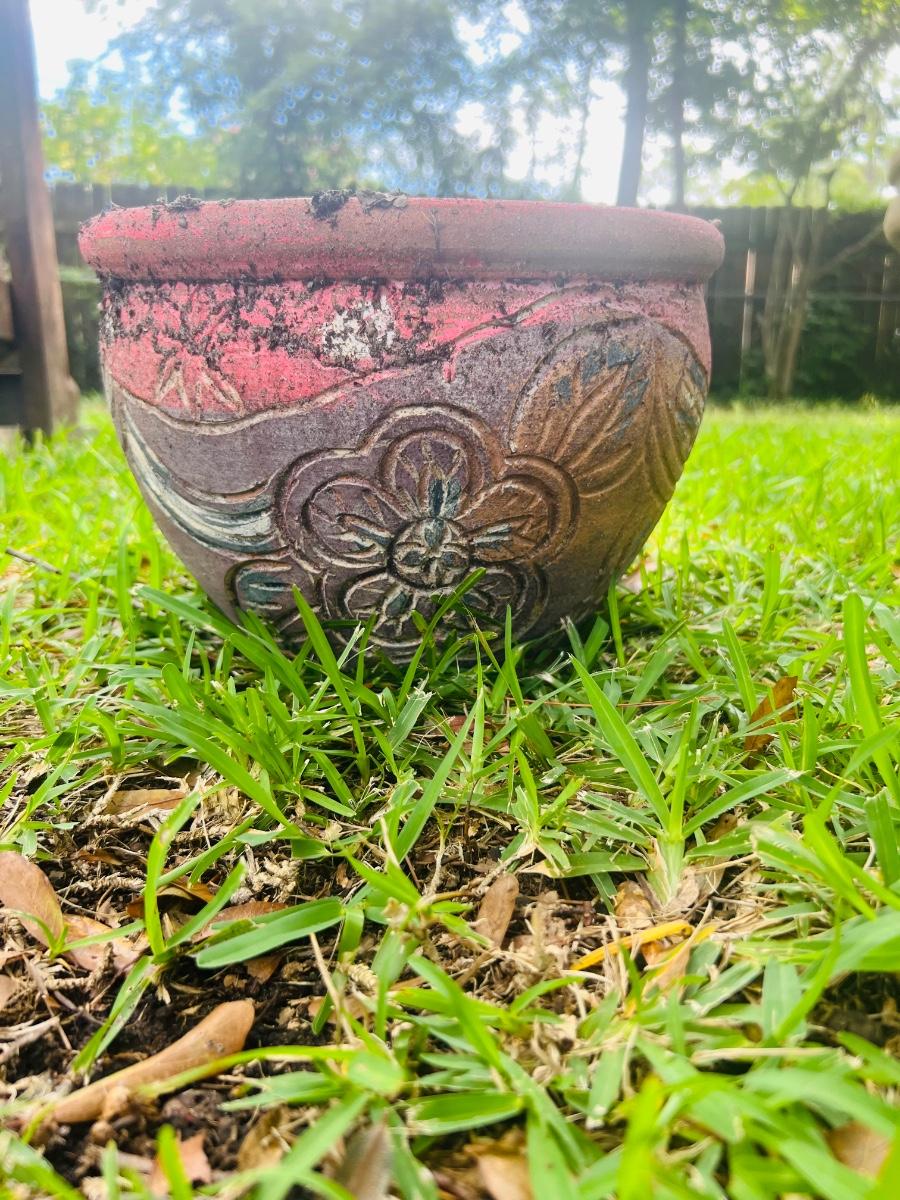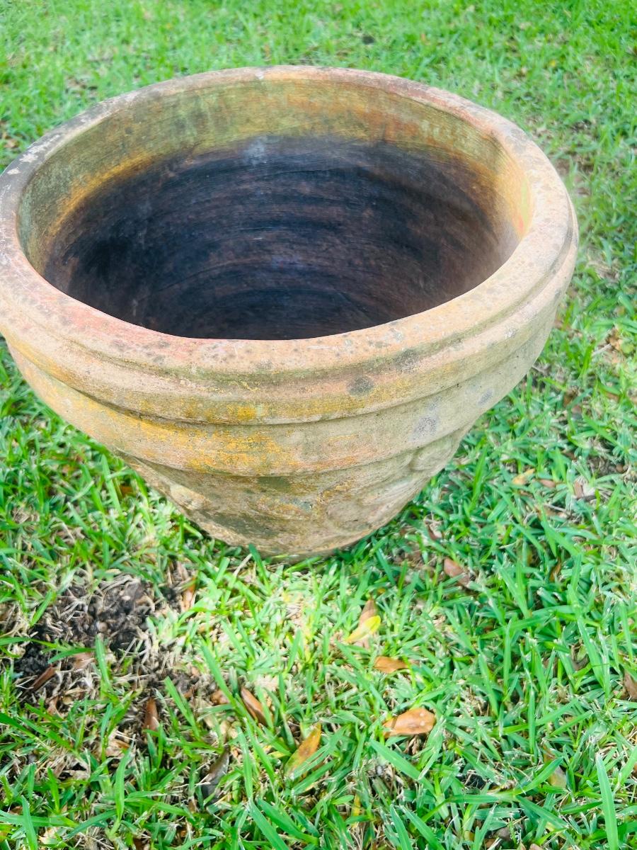 Three terra-cotta planters with flower designs. Largest measures 14 1/2 inches tall and 15 1/2 round. Two matching terra-cotta planters measure 9 inches tall and 12 inches round.