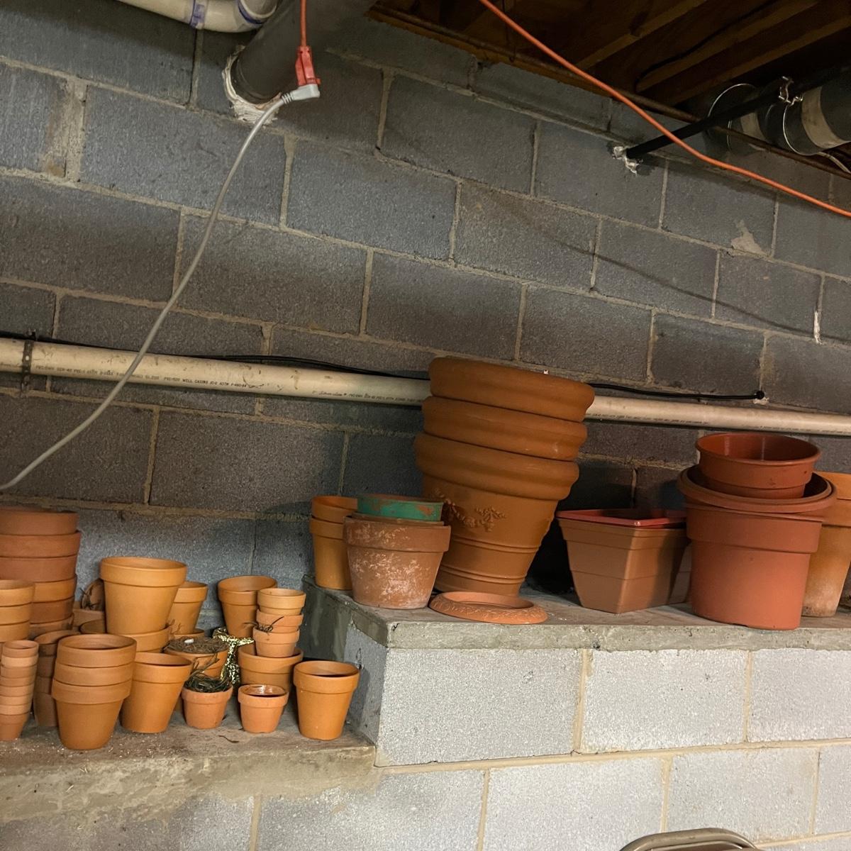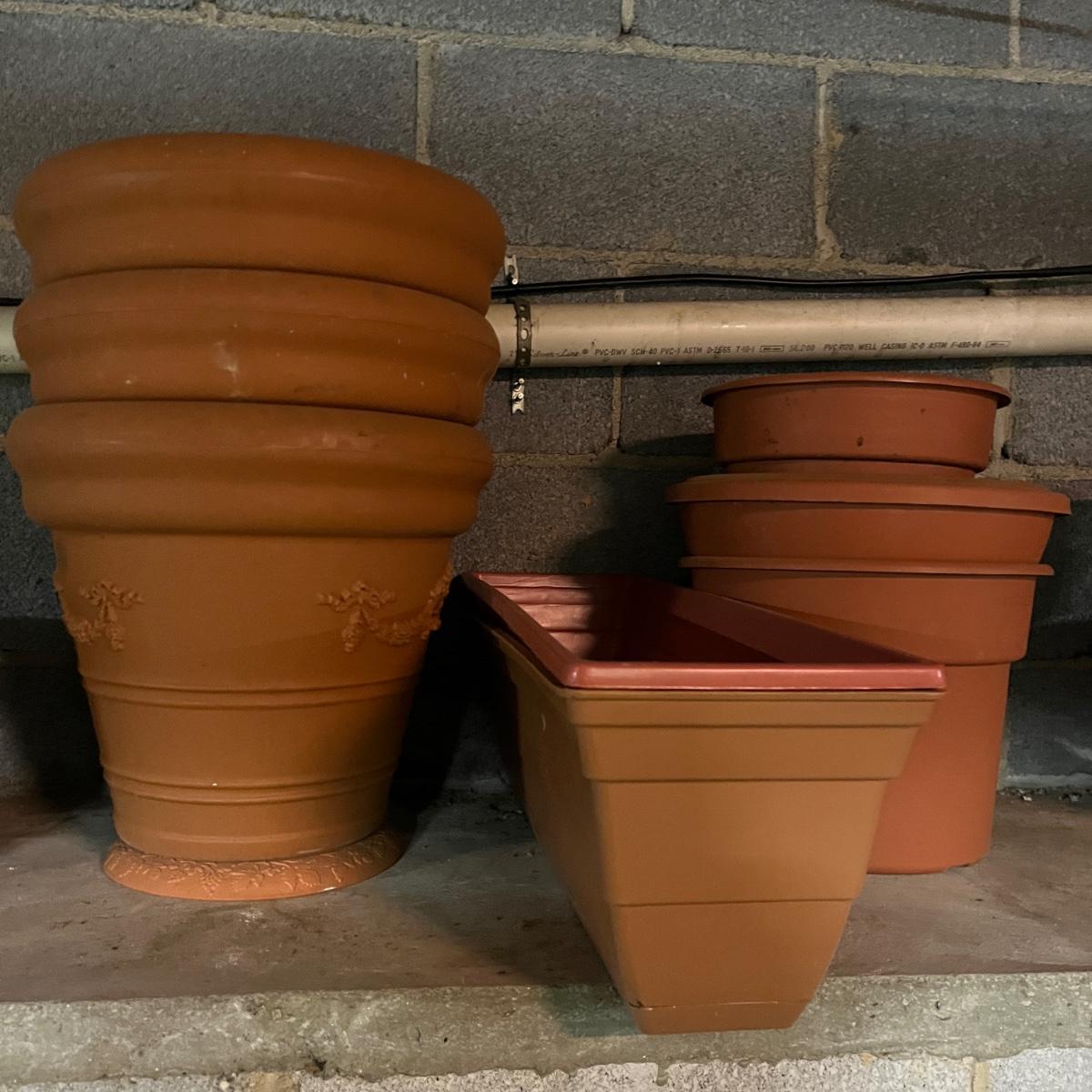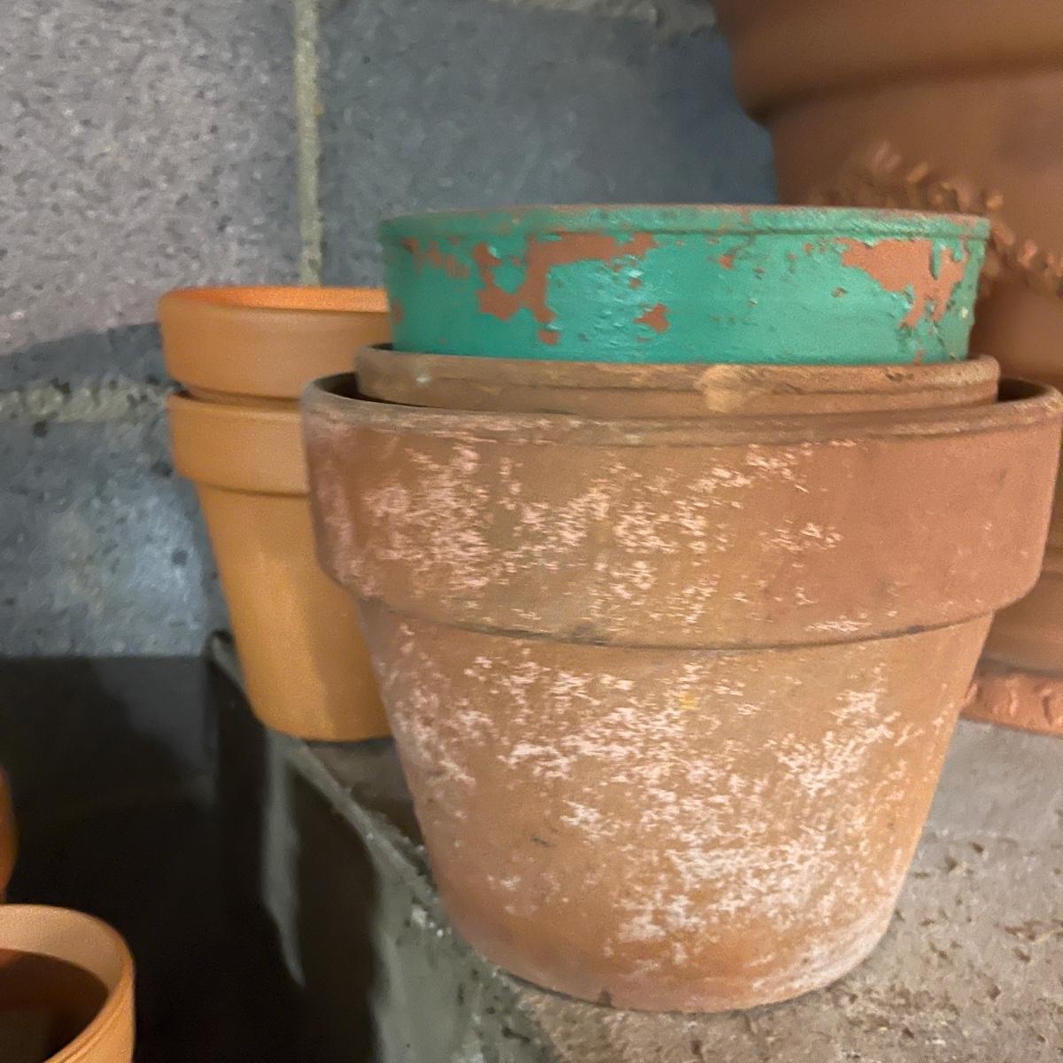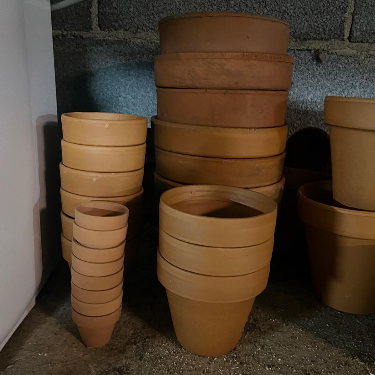 Lot includes over 25 terra cotta pots in a variety of sizes and eight plastic pots that look like terra cotta. Largest terra cotta pot measures 12”D x 11.5”H. The fourth picture is of the plastic pots.