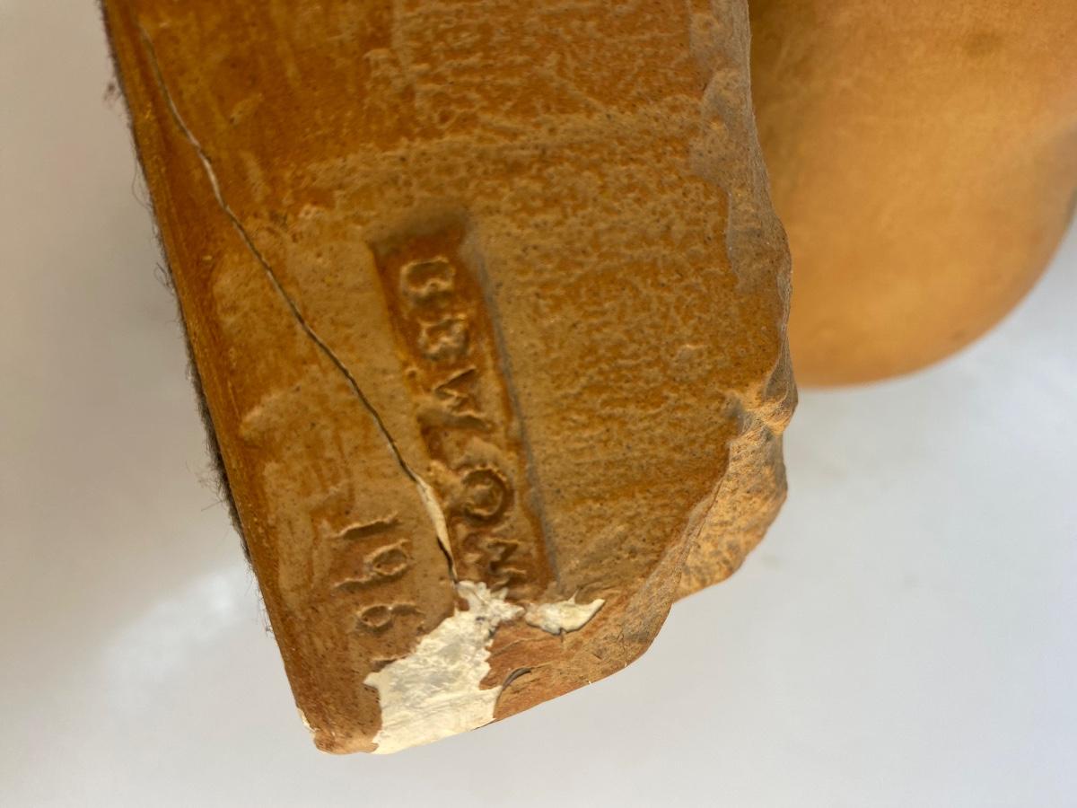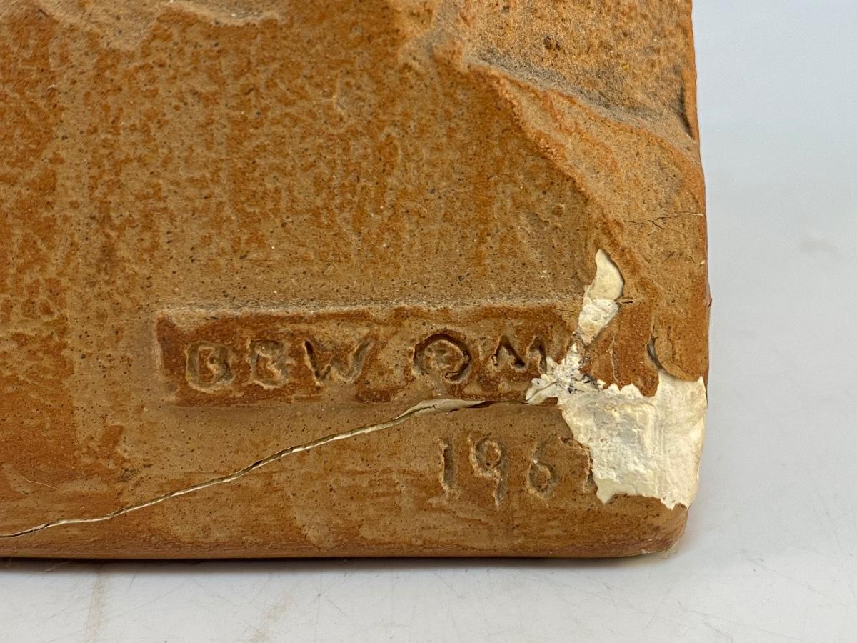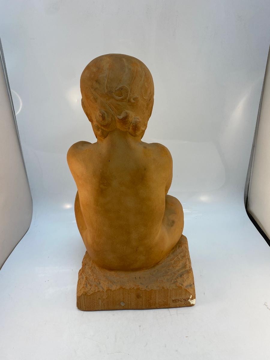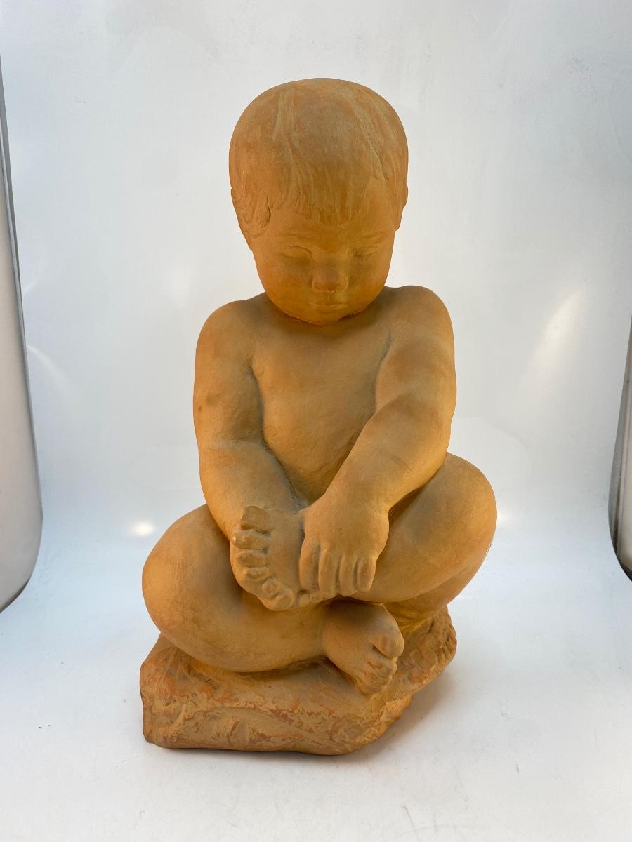 Terra Cotta Pottery Plaster Sitting Child Garden Yard Art Statue. In good vintage condition, small corner damage does not affect display. Felted bottom as it was displayed inside by previous owner. About 17" size. It does have a maker stamp near corner damage with a date of 1967.