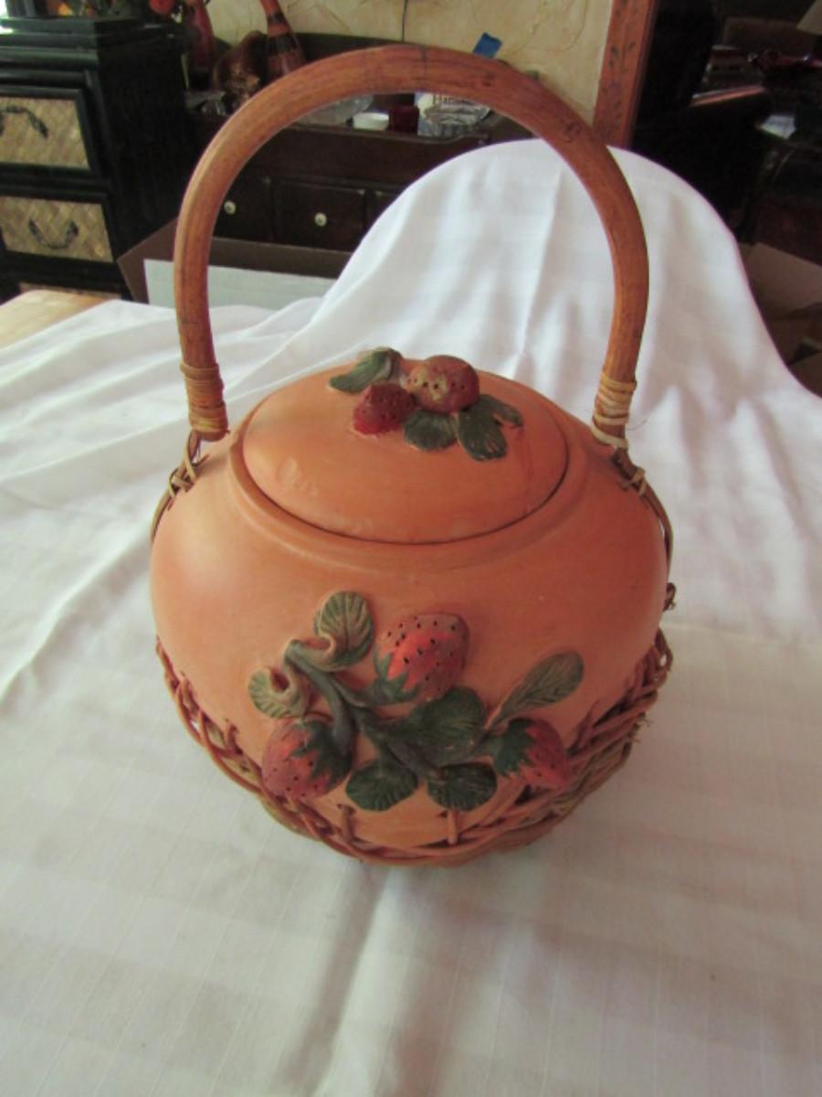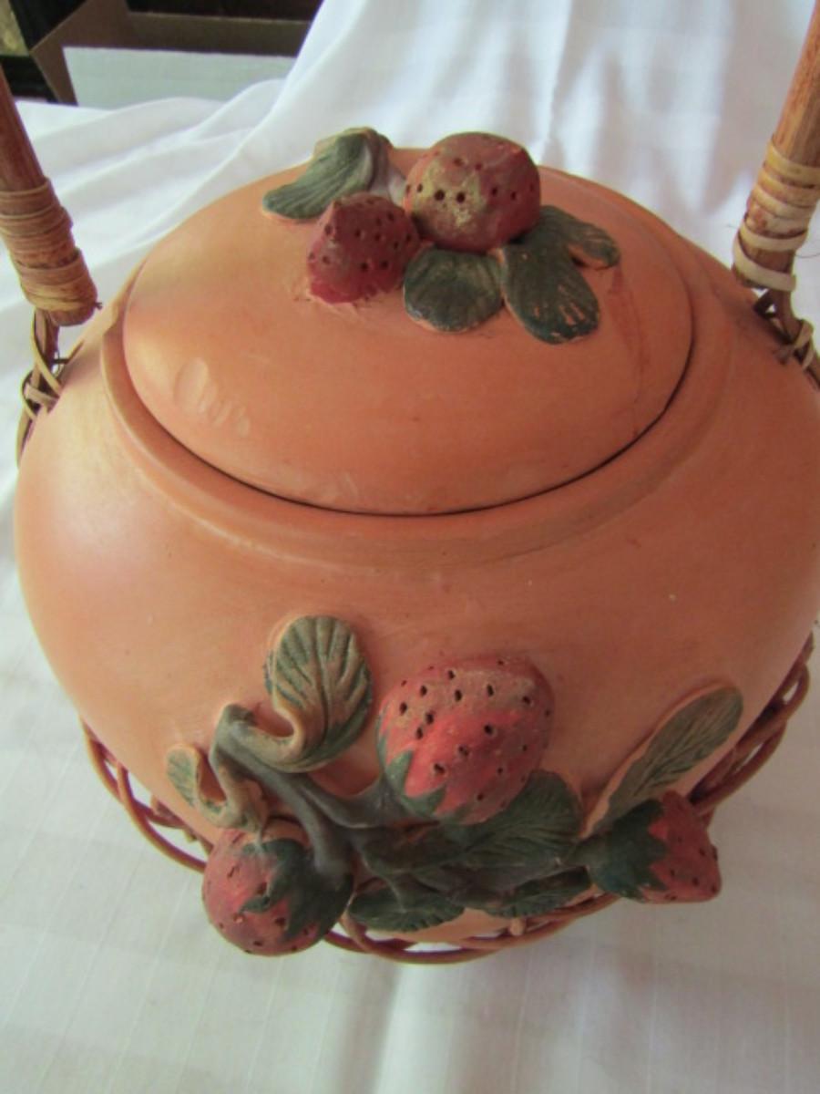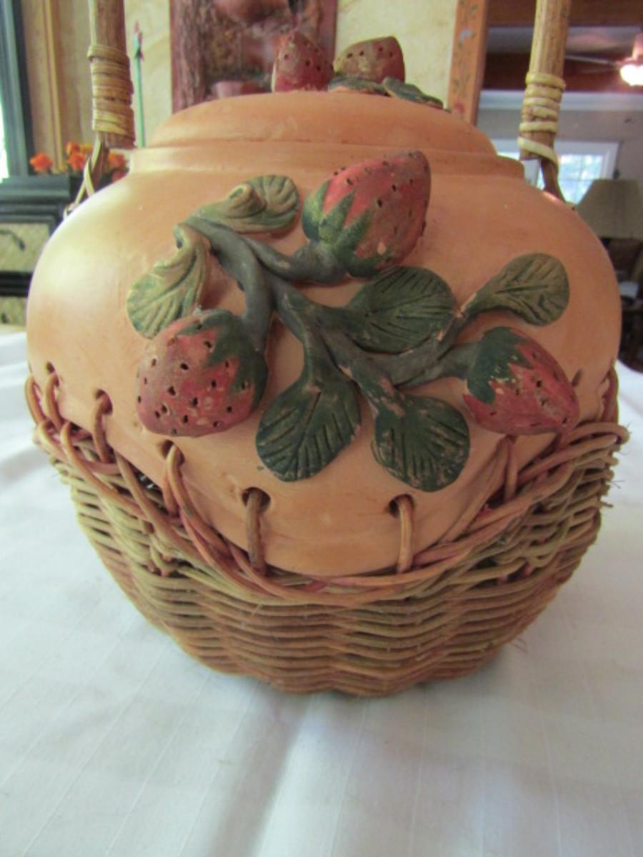 Terra Cotta Topped Basket- Strawberry Theme. Please see all pictures- Lid has been repaired.