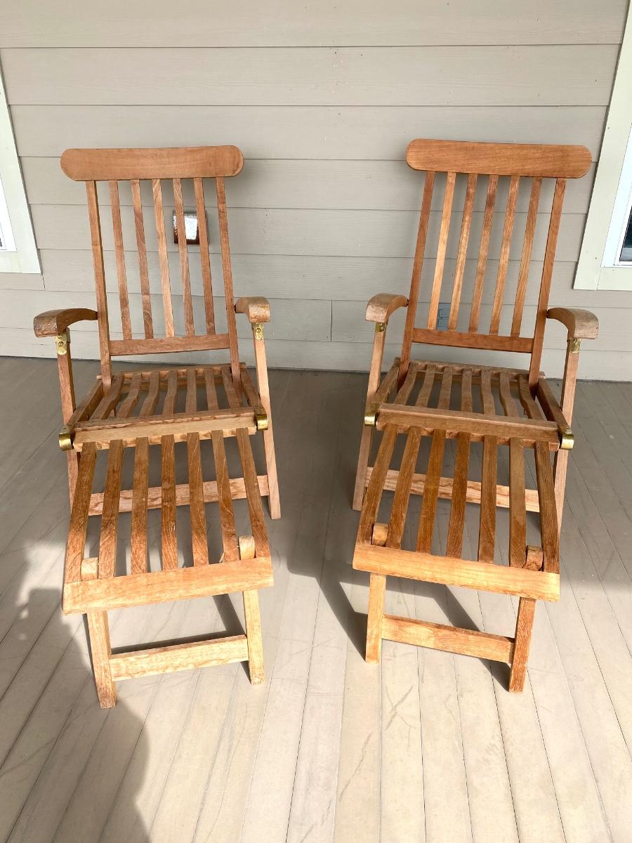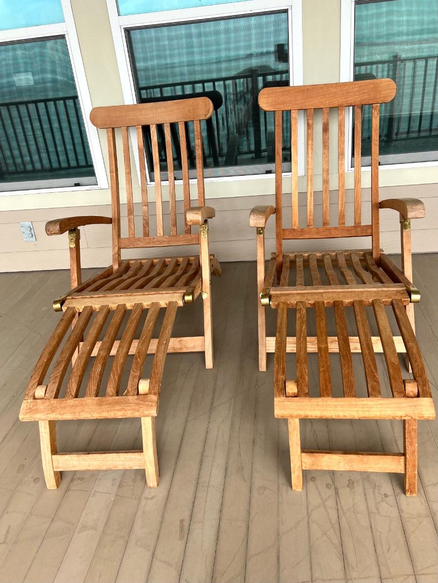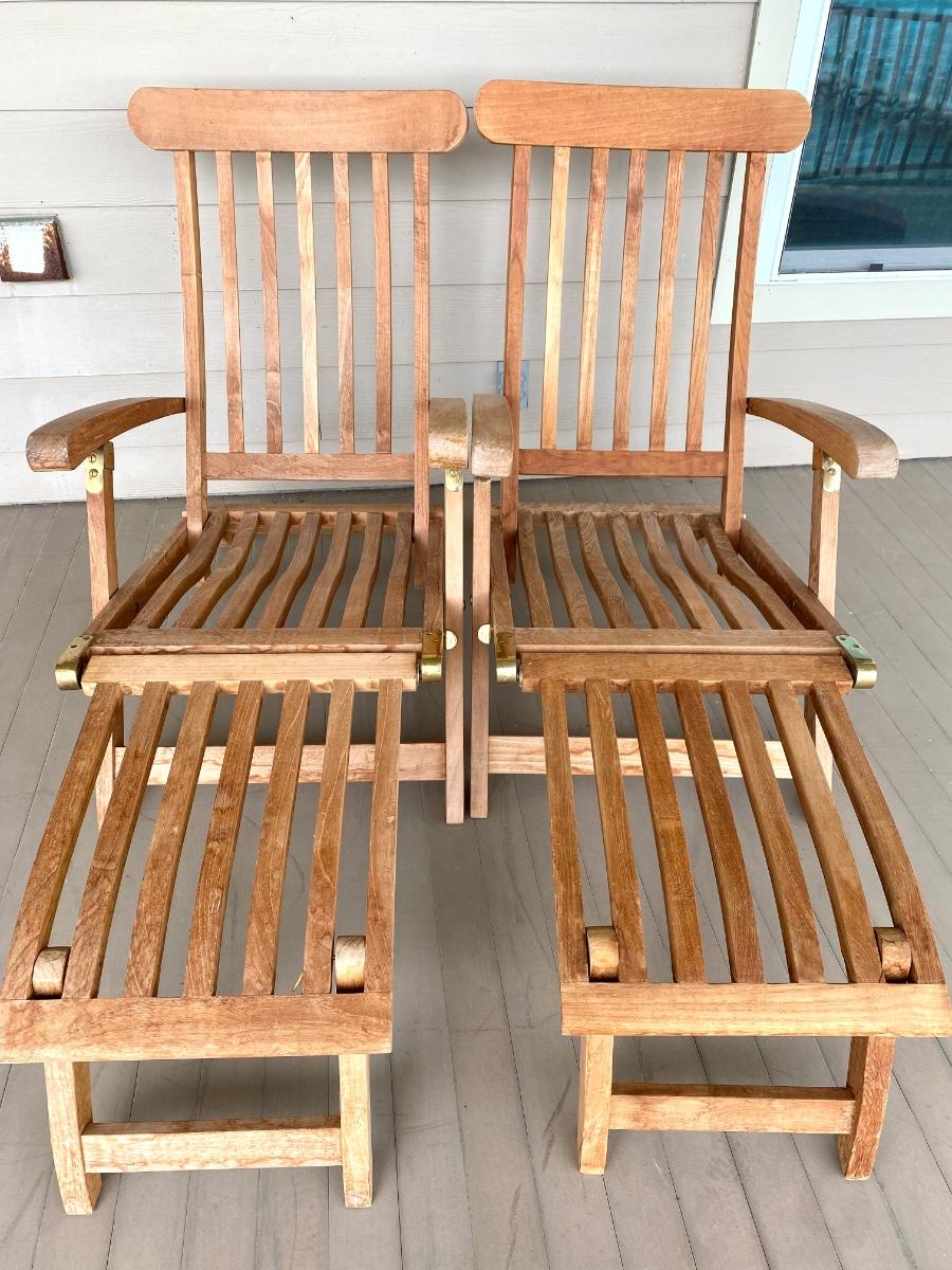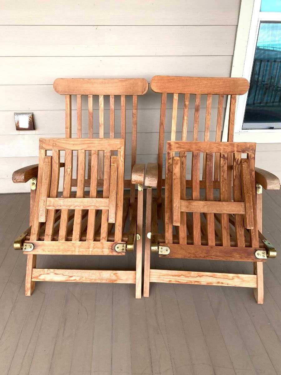 Pair of adjustable outdoor chairs. 37”H X 48”L X 23”W.