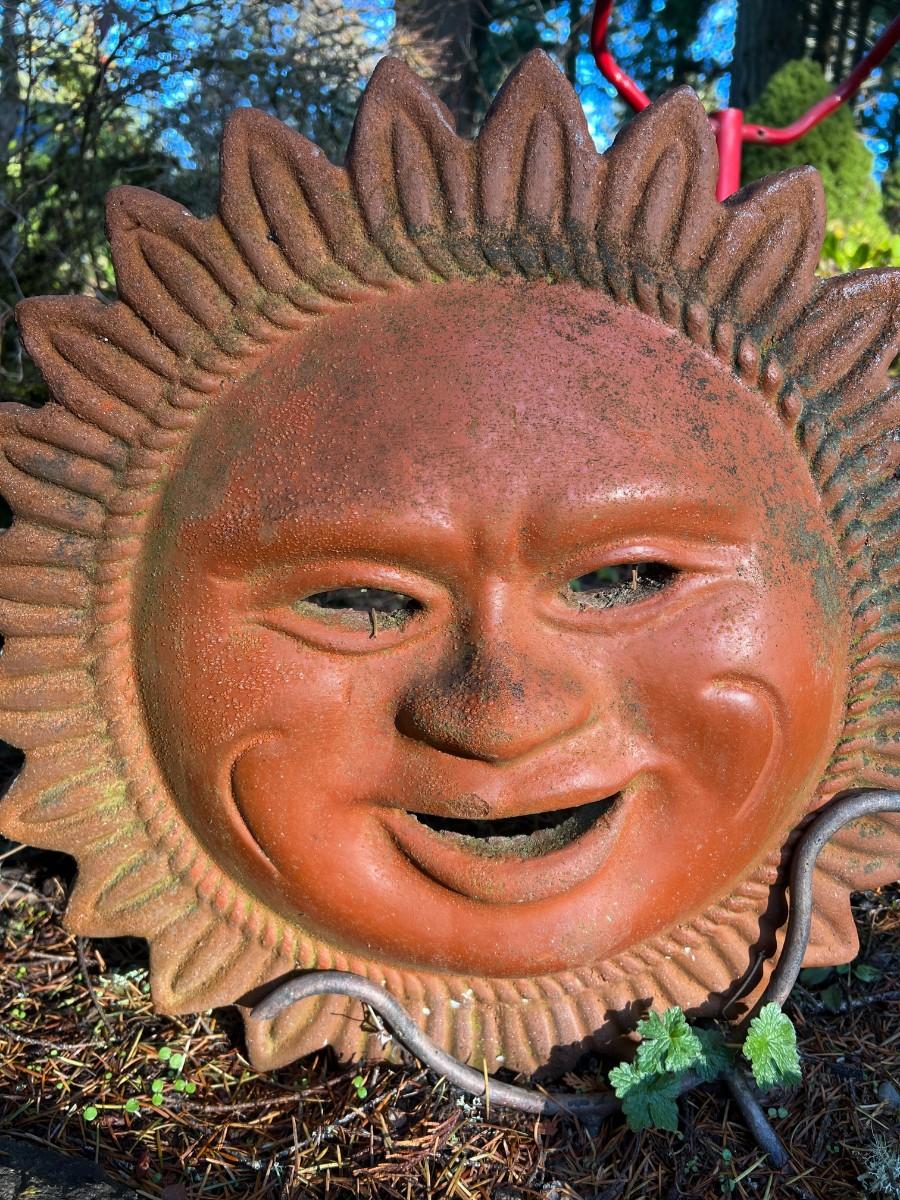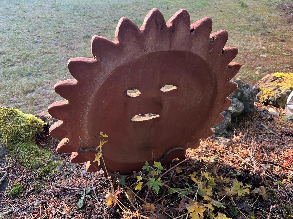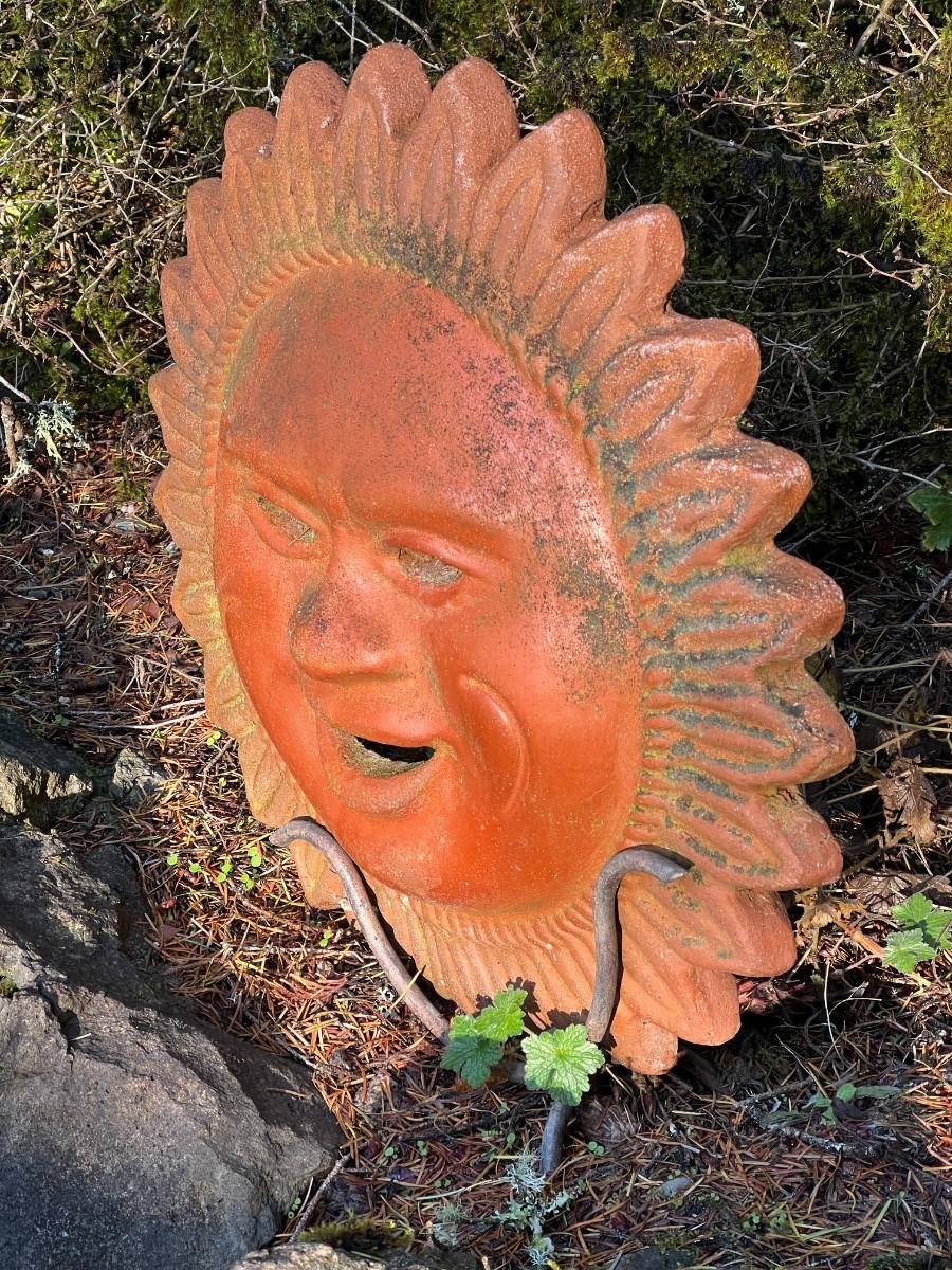 Terracotta Clay Smiling Sun Disk Art with Outdoor Garden Stand. In good condition, with some weathering (as shown).