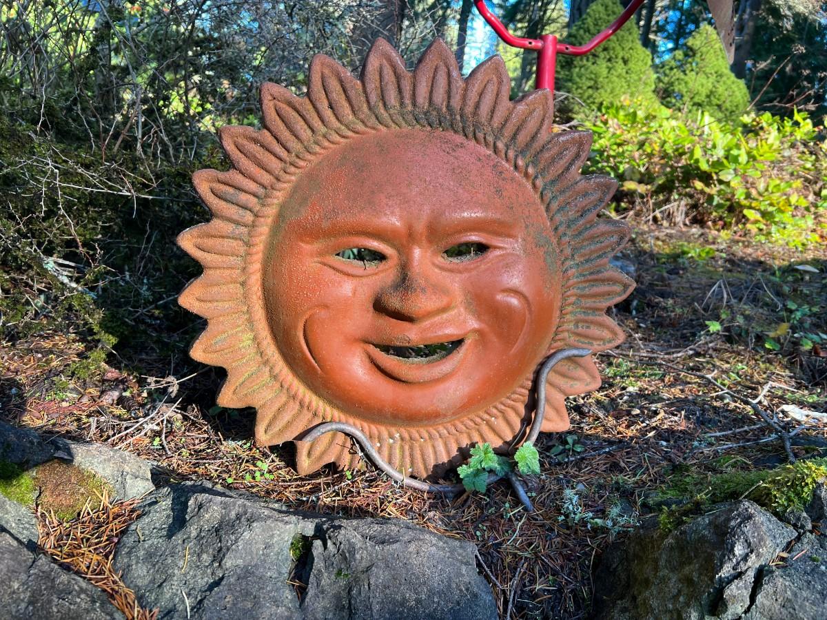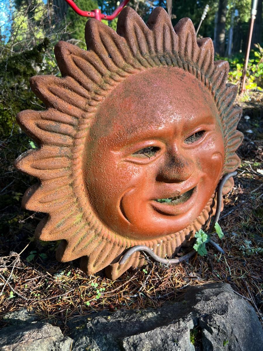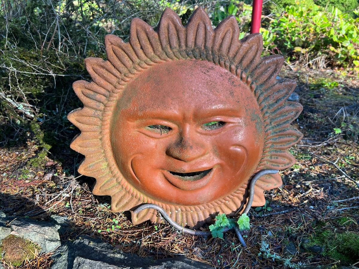 Terracotta Clay Smiling Sun Disk Art with Outdoor Garden Stand. In good condition, with some weathering (as shown).