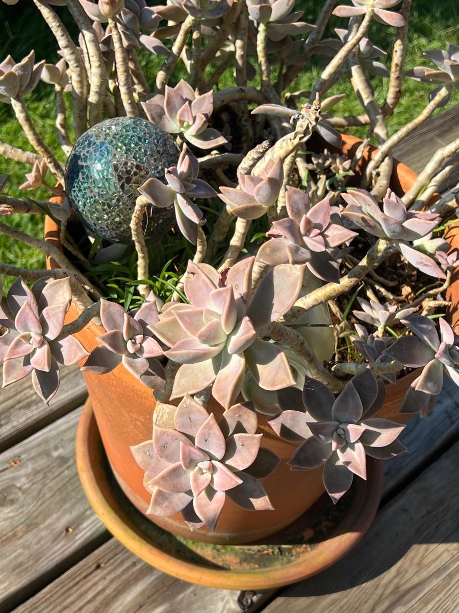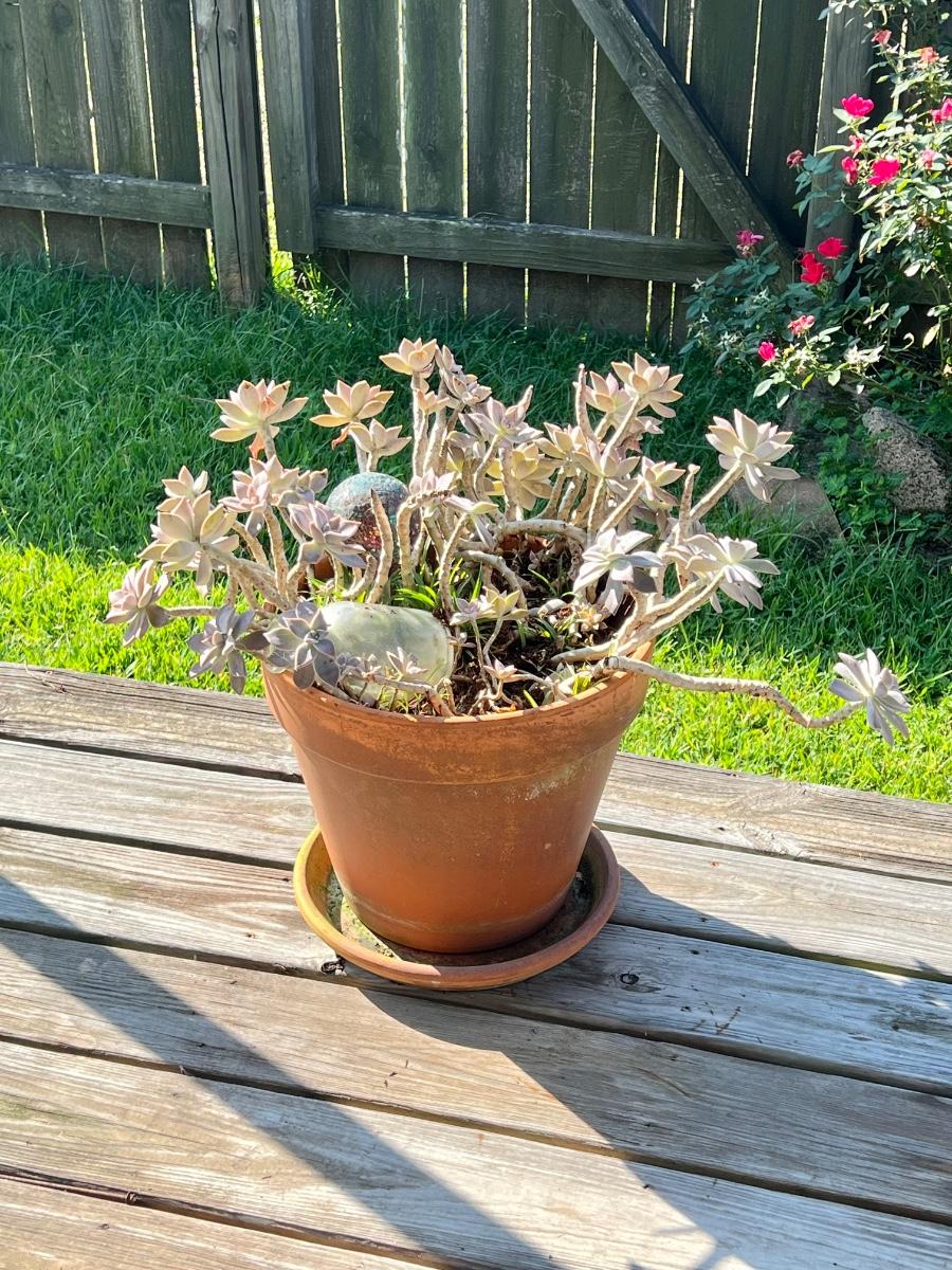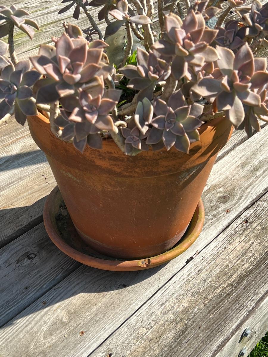 Planter does have chip on plate, see photos ~ Pot with plant ~ 21” H x 27” Round ~ Just the pot = 12.5” H x 14” Round