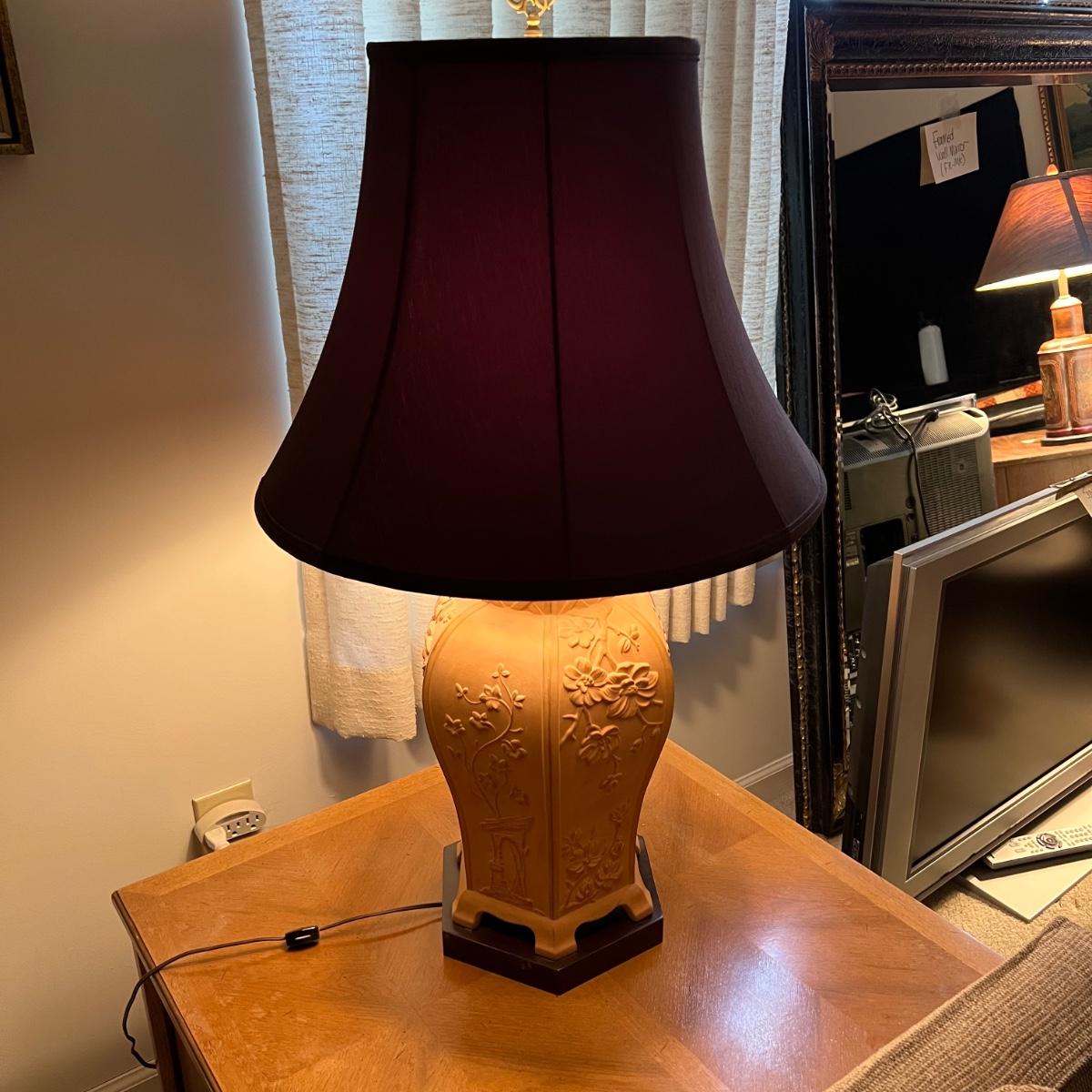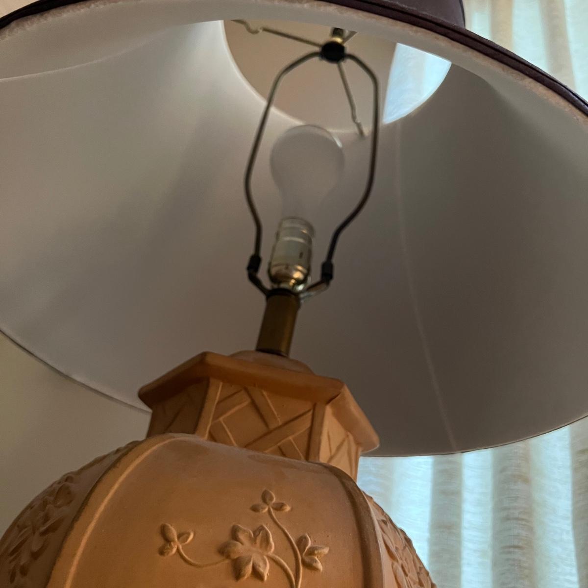 Lamp appears to be terracotta and is not polished, appears to have no glaze. The shade is a dark brown linen-like fabric. It measures 12” x 12” X 35”H. The on off switch is on the electric cord.