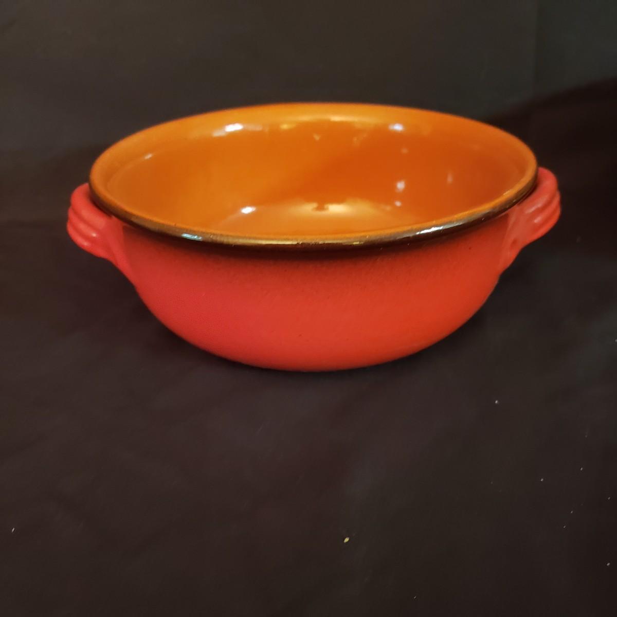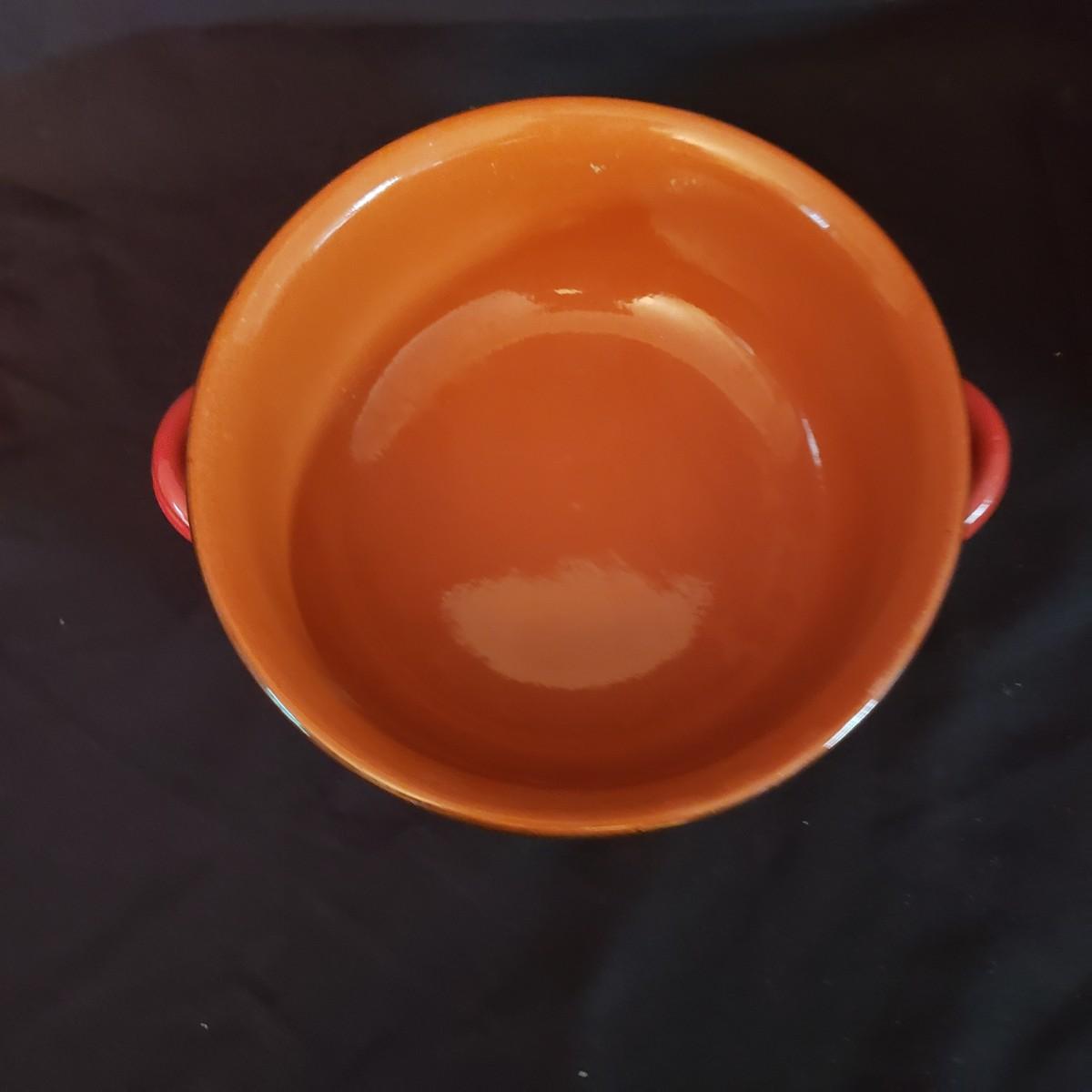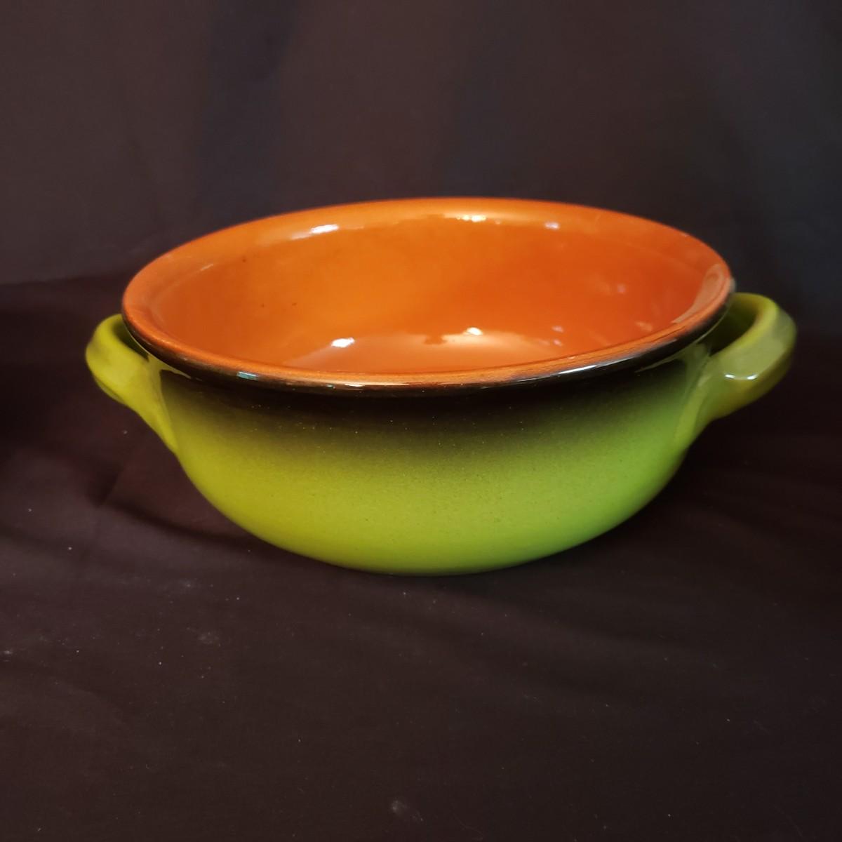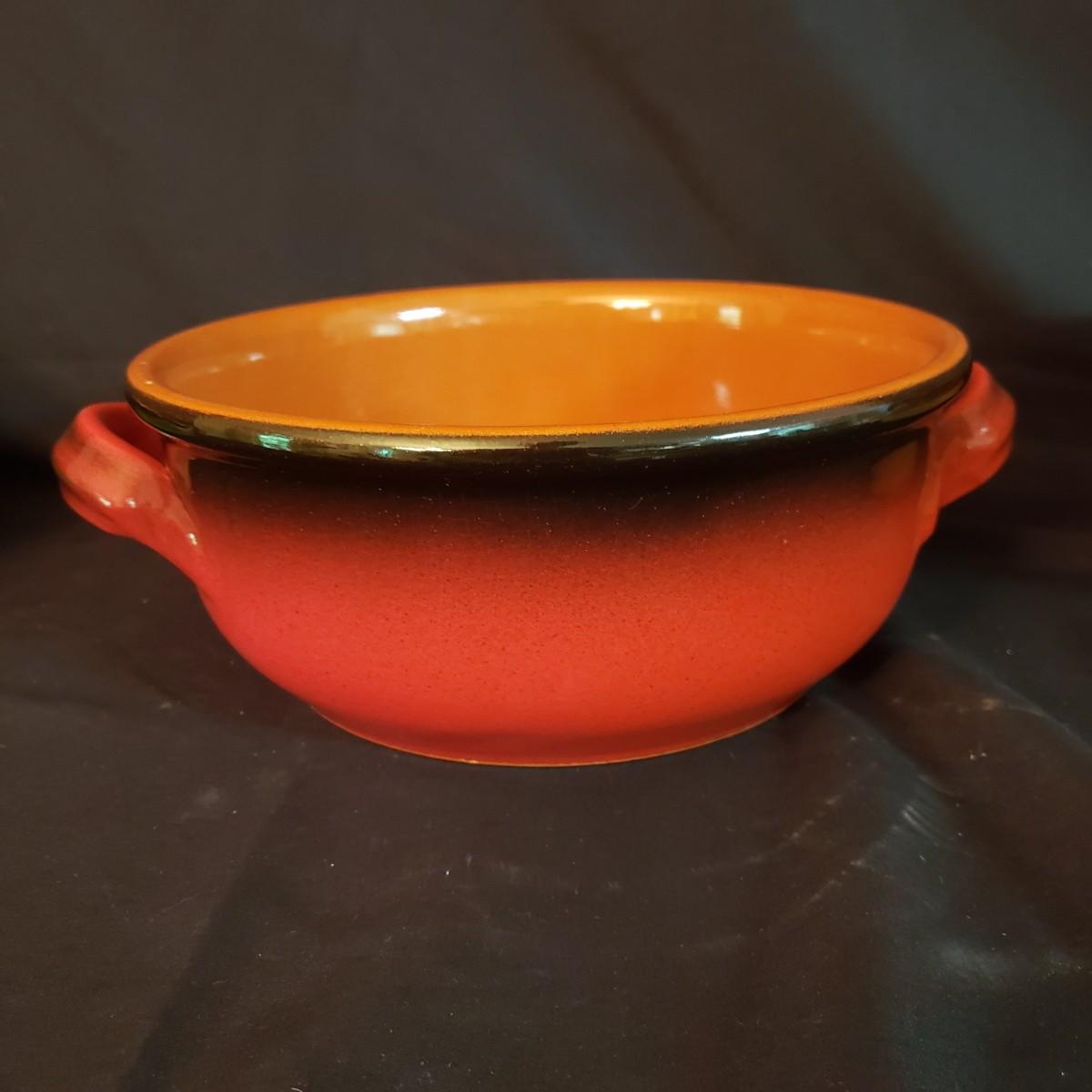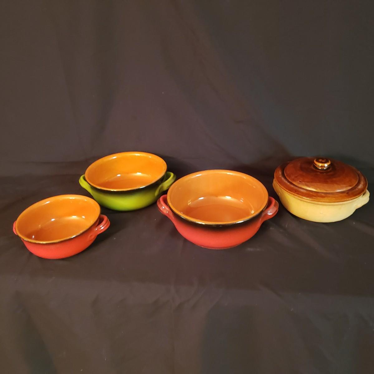 This lot has a Terrecotte Lotti brand set of three, two-handled bowls. The set is three different sizes with a large red and black bowl (11" x 4"H), a medium green and black bowl (10" x 3.5"H) and a small red and black bowl (9" x 3"H). All three bowls have a terracotta orange color inside the bowl. The fourth bowl in this lot is a 9" x 3"H brown glazed bowl with two handles and a lid. The lid has a small chip on the rim, see pictures.