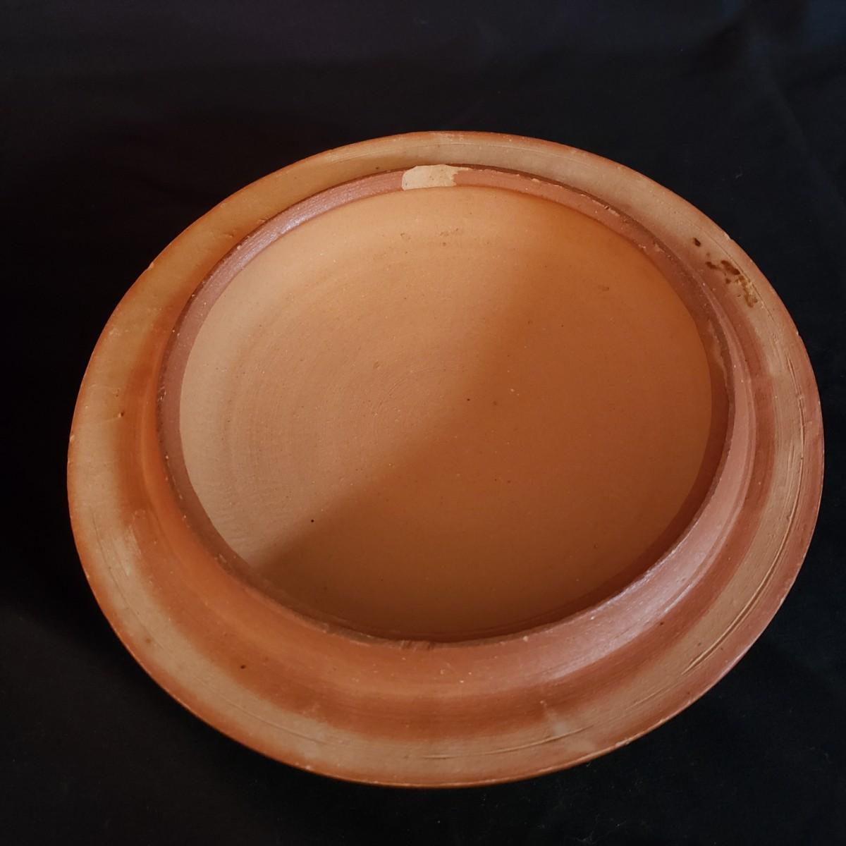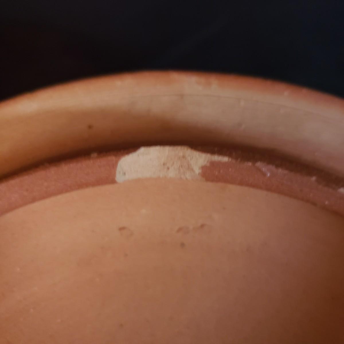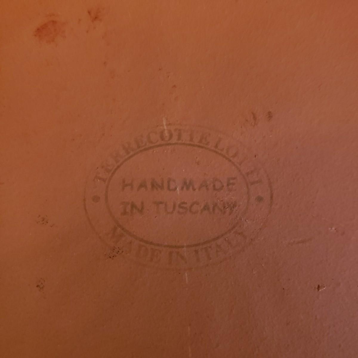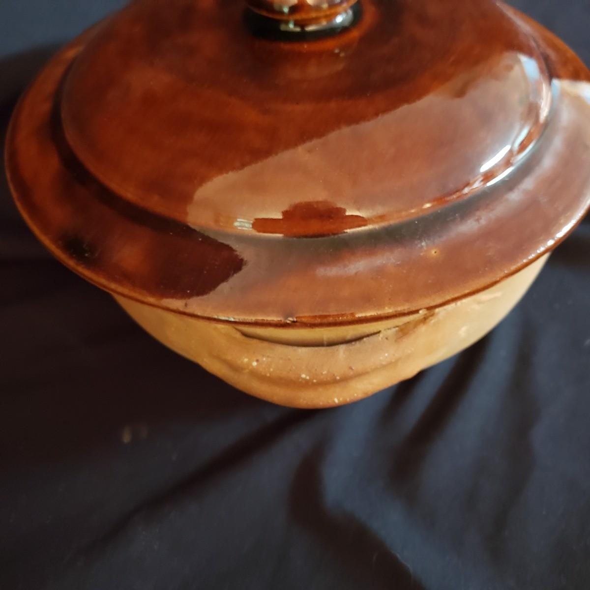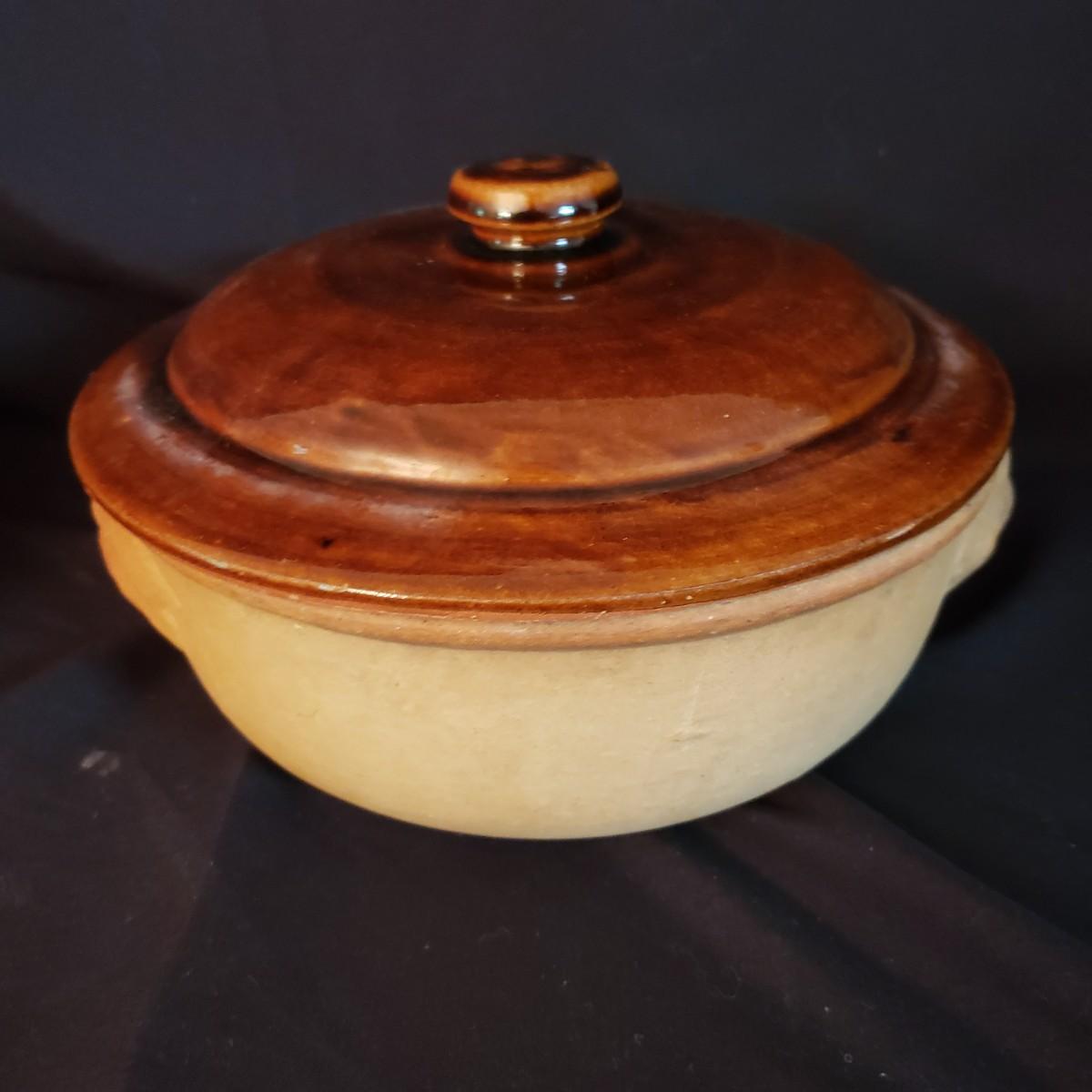 This lot has a Terrecotte Lotti brand set of three, two-handled bowls. The set is three different sizes with a large red and black bowl (11" x 4"H), a medium green and black bowl (10" x 3.5"H) and a small red and black bowl (9" x 3"H). All three bowls have a terracotta orange color inside the bowl. The fourth bowl in this lot is a 9" x 3"H brown glazed bowl with two handles and a lid. The lid has a small chip on the rim, see pictures.