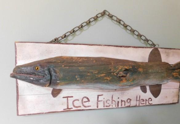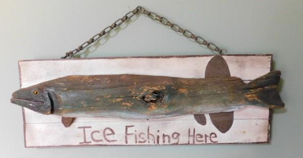 Terrific Folk Art Muskie Ice Fishing Sign 34"x10"