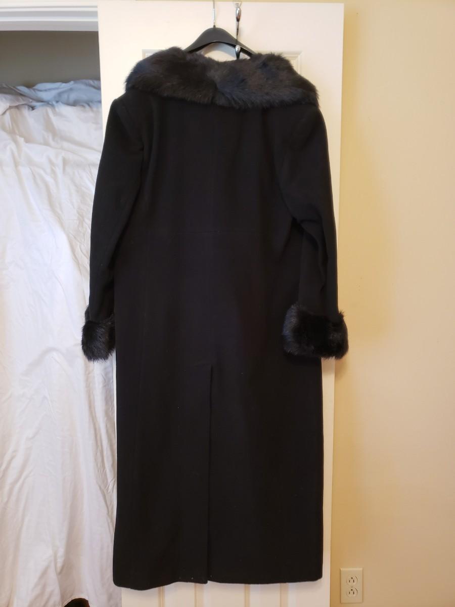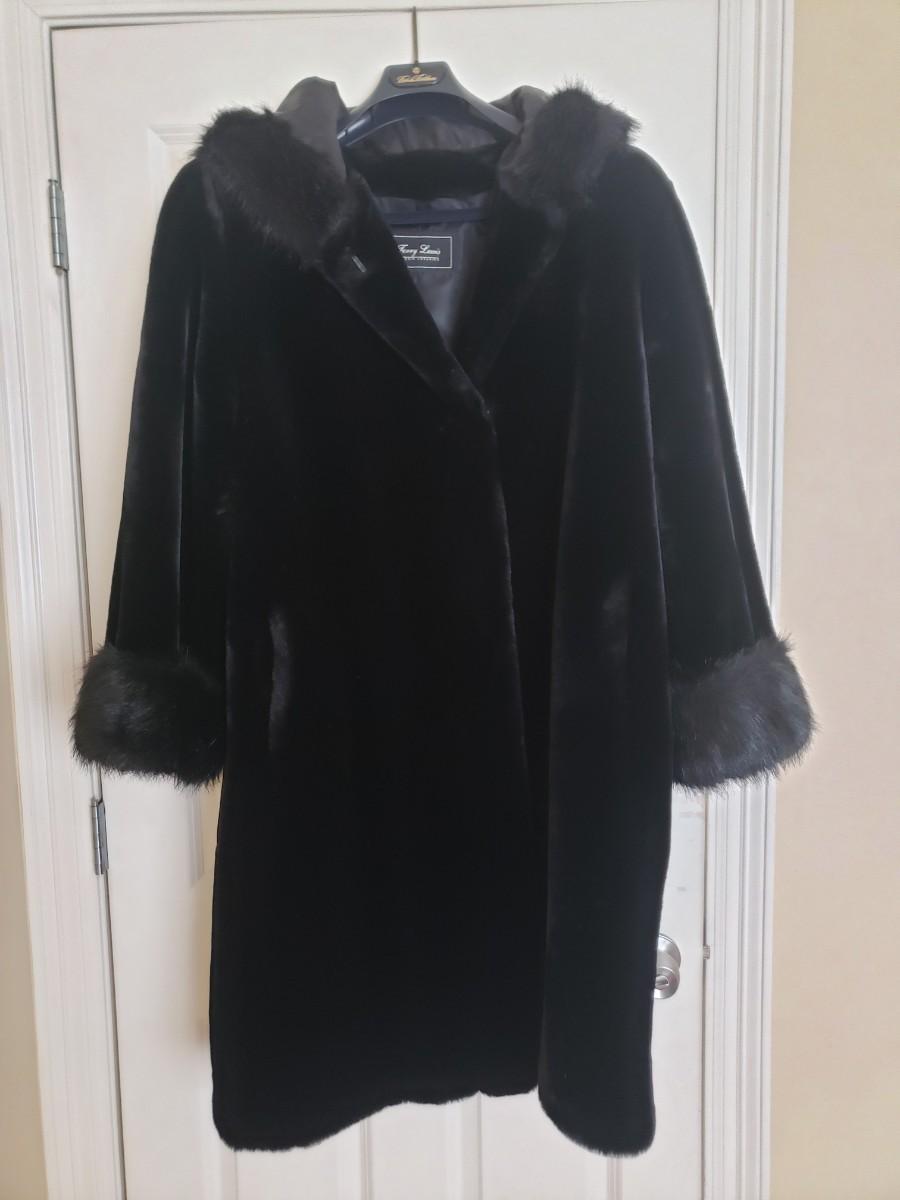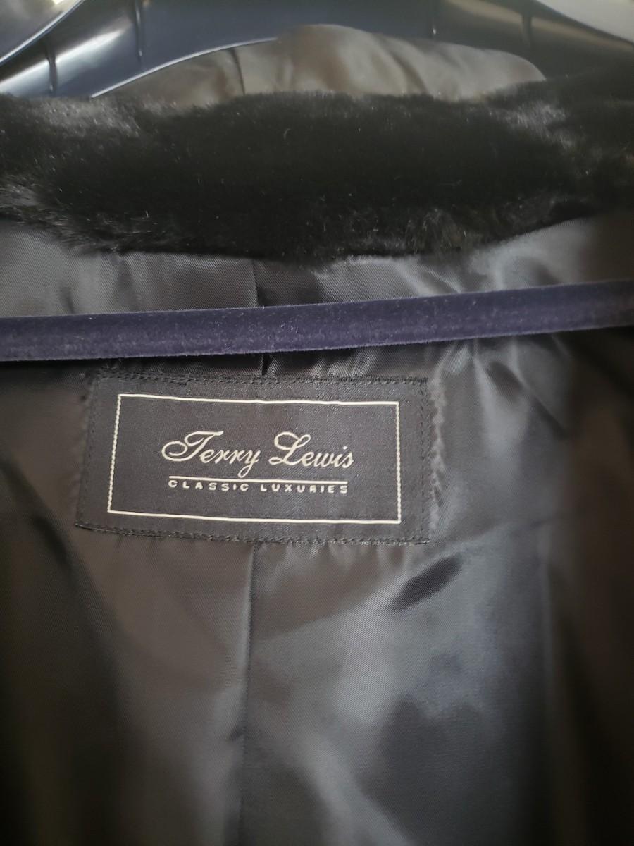 Terry Lewis Classic Luxury women's black acrylic coat with faux fur cuffs & collar Size Large.