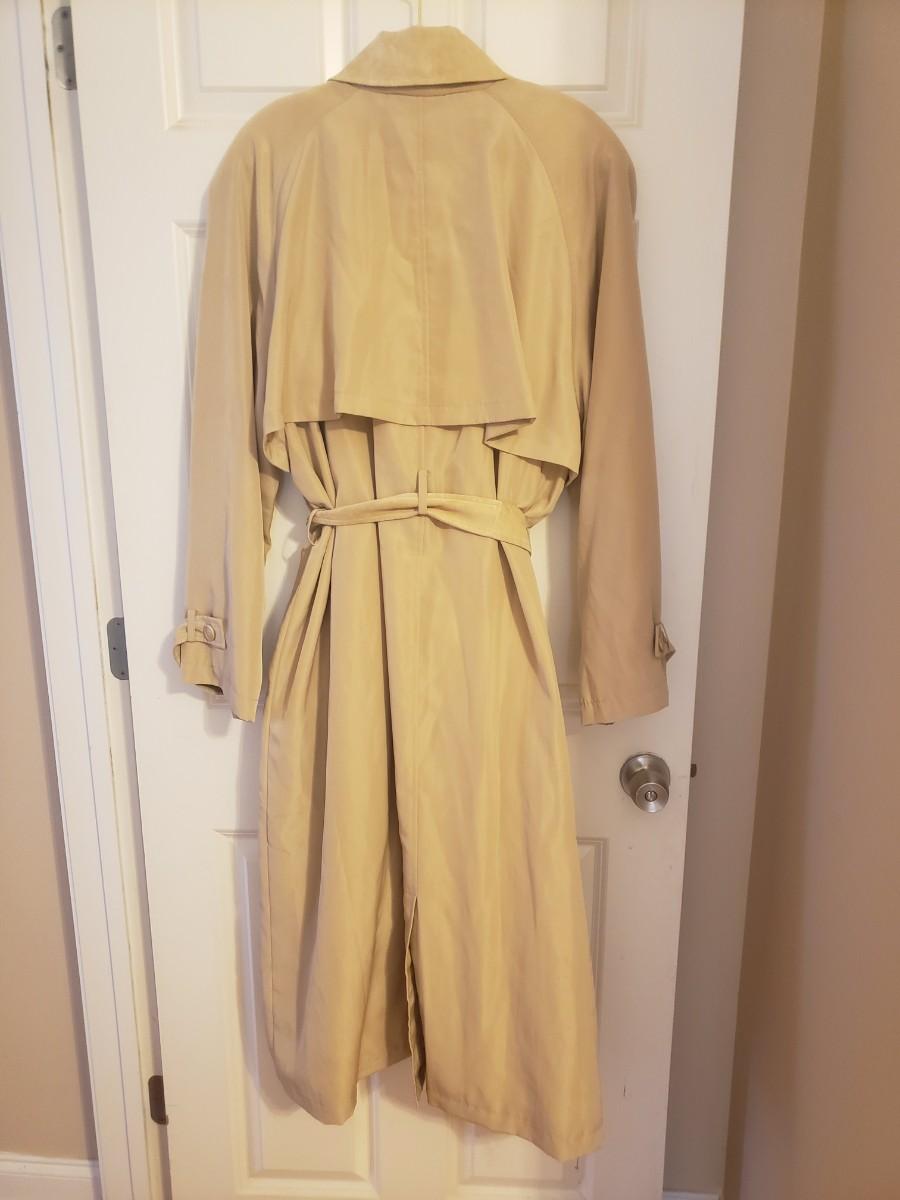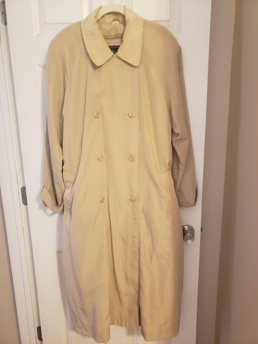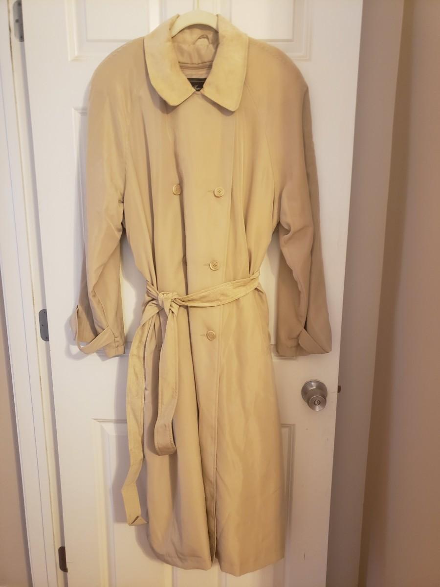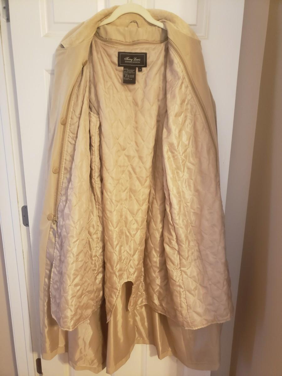 Terry Lewis women's full length trench coat. Beige/tan with leather belt & collar. Water resistant with removable liner. Size 1X.