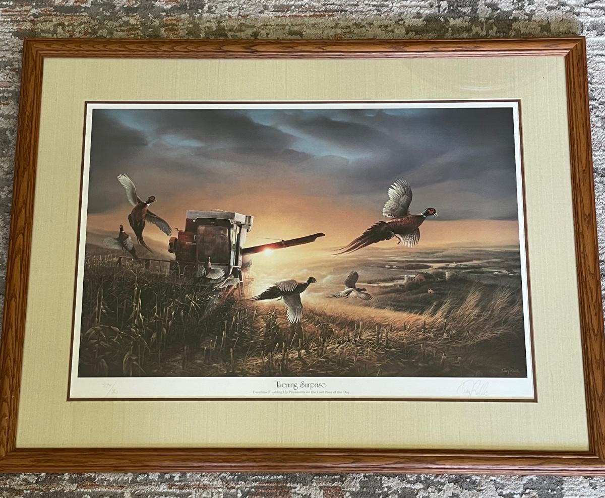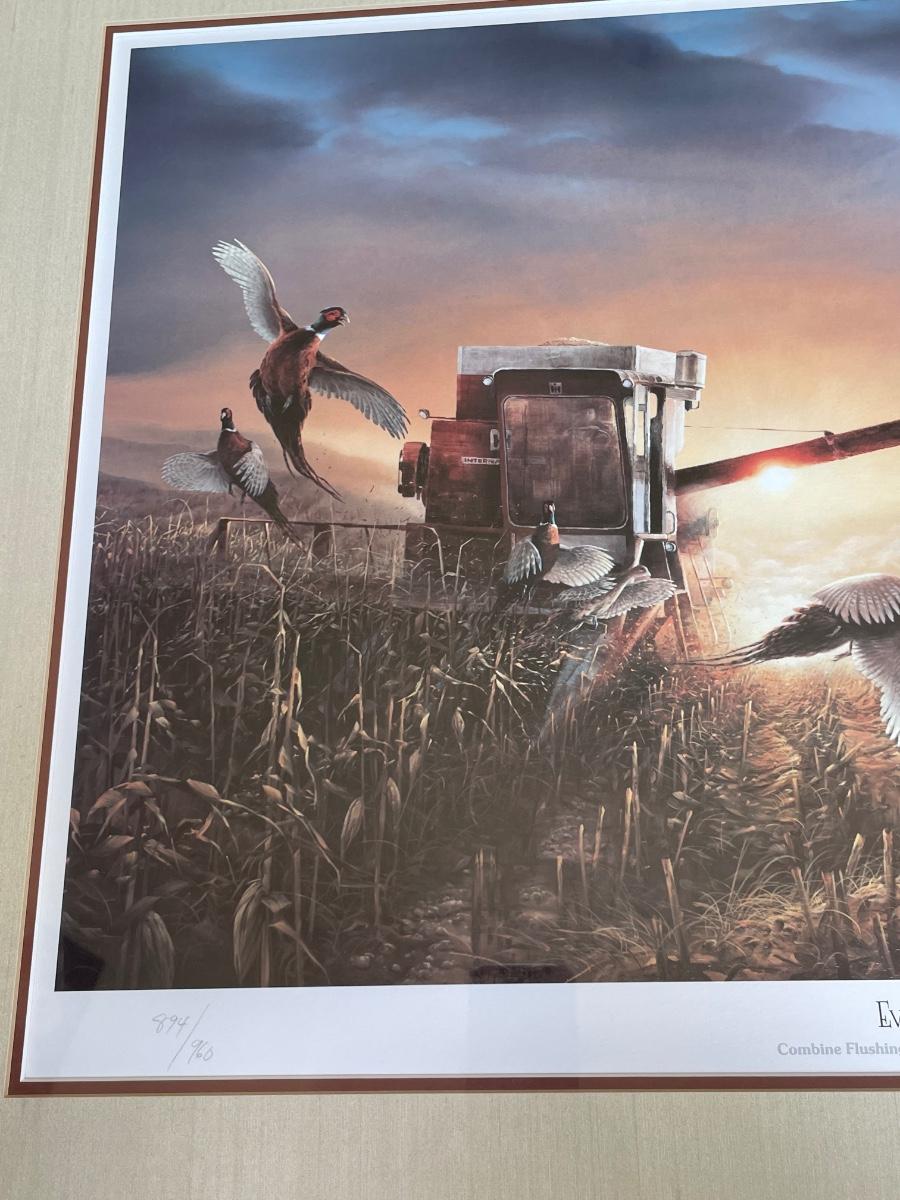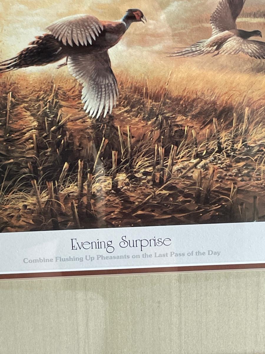 “Combine Flushing Up Pheasants on the Last Pass of the Day”. Professionally matted and framed. 26” high by 34” wide.