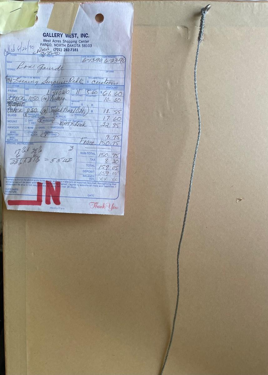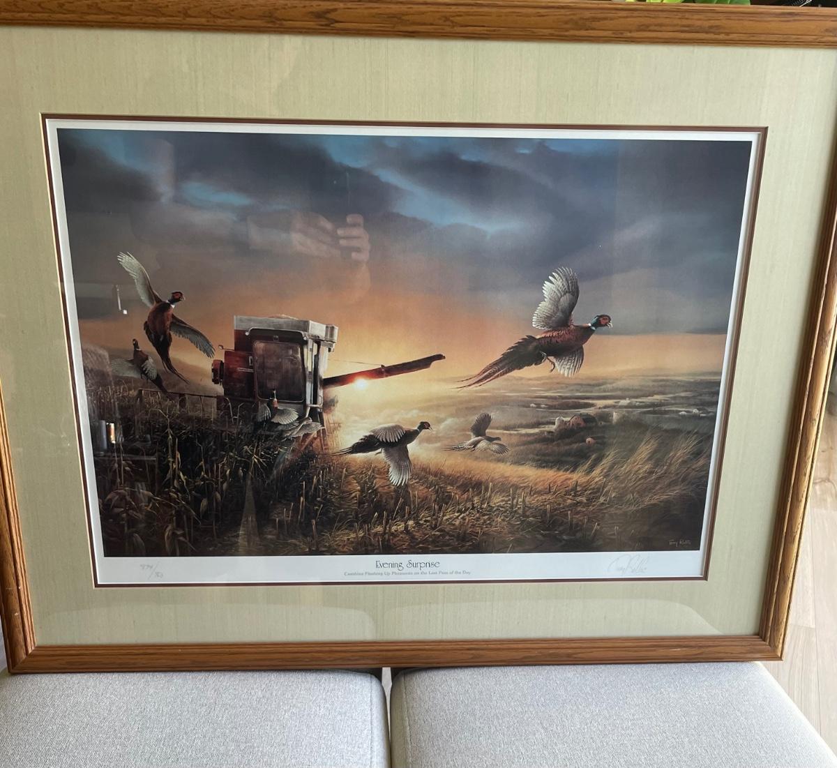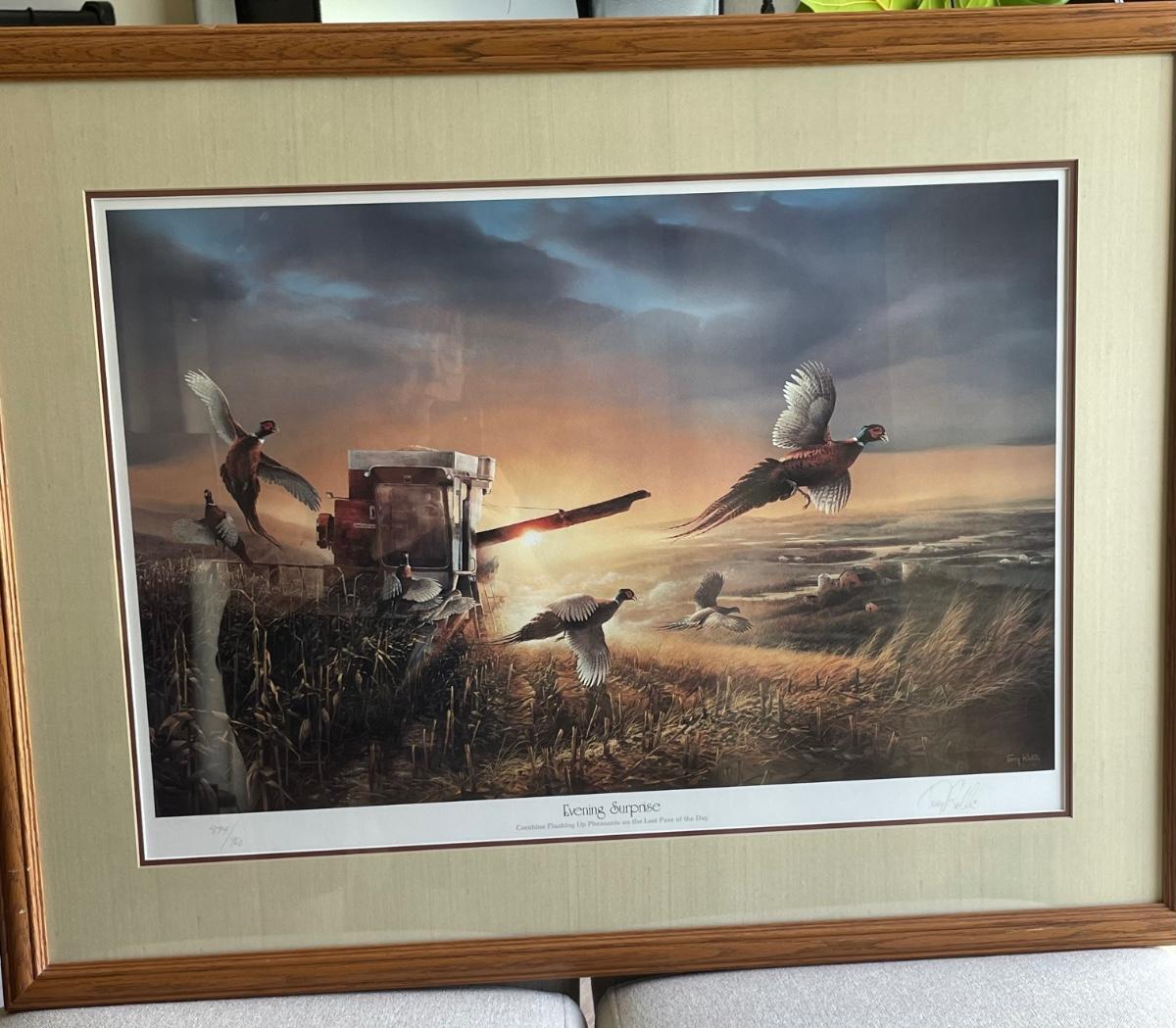 “Combine Flushing Up Pheasants on the Last Pass of the Day”. Professionally matted and framed. 26” high by 34” wide.