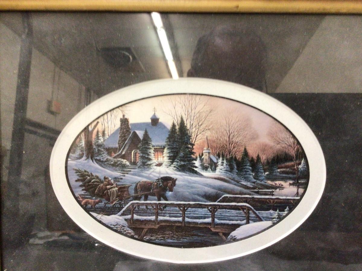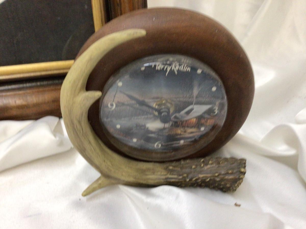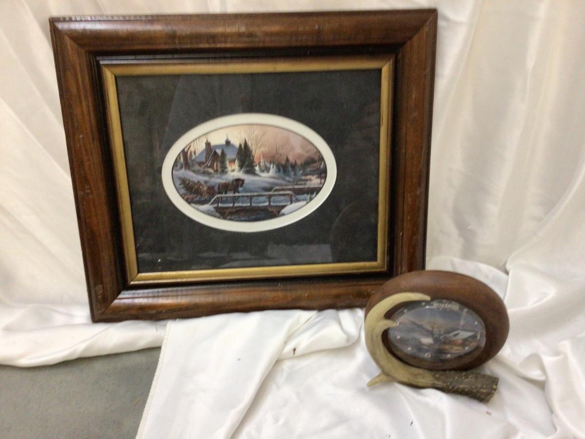 You get a nice framed Terry Redlin winter scene picture and a horn battery operated clock.