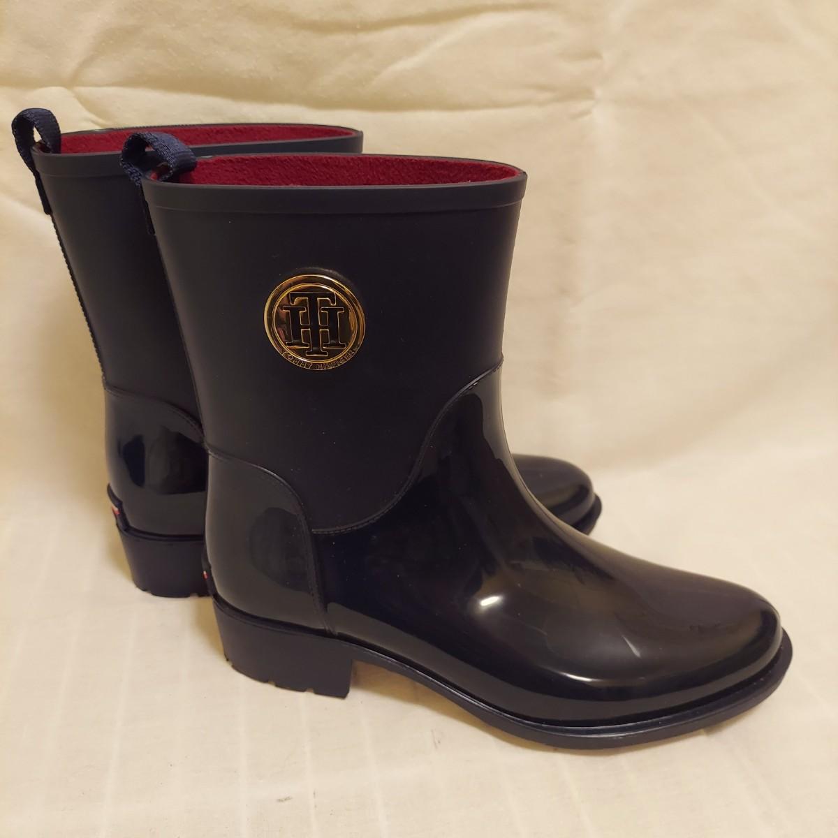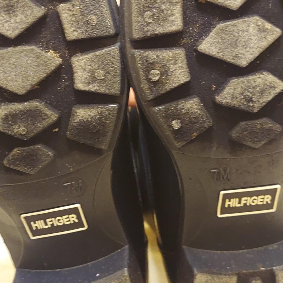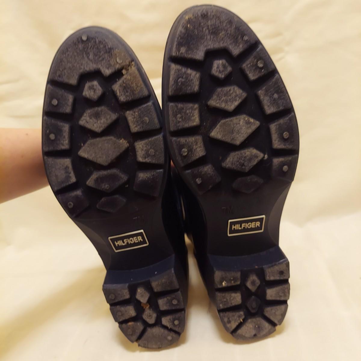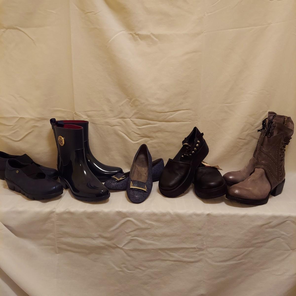 Lot includes five pairs of womens shoes and boots averaging size 7. A.S. 98 grey leather boots with studs. A.S. 98 black leather flatform Mary Jane's with studs. Navy blue Tommy Hilfiger rain boots. Silver and navy Aerosoles flats. Plus Black Wolky slip-ons. Shipping available