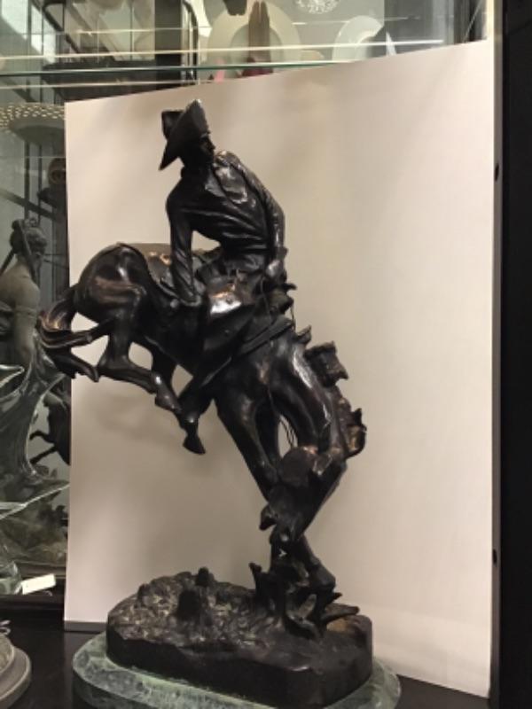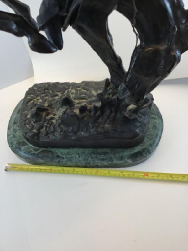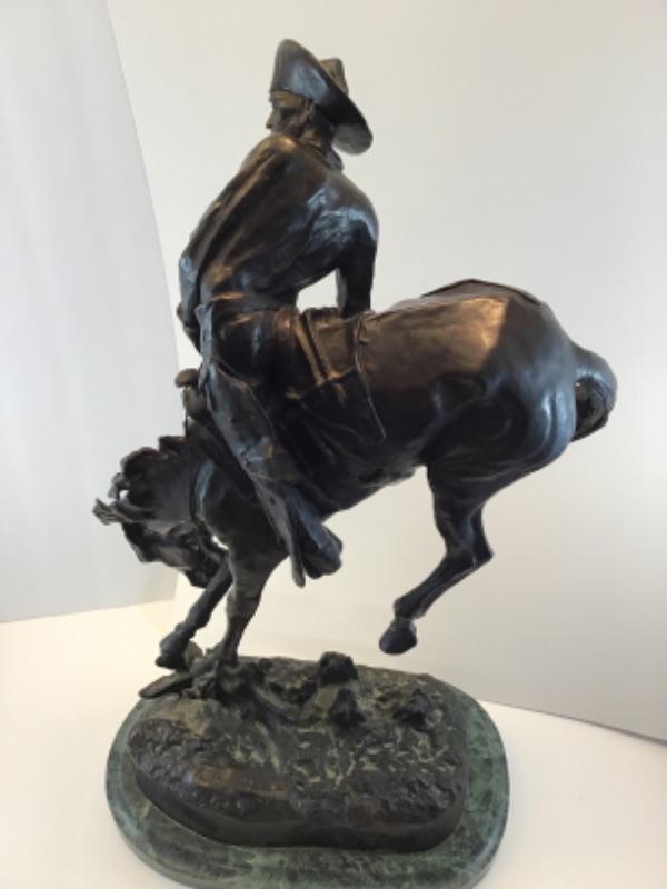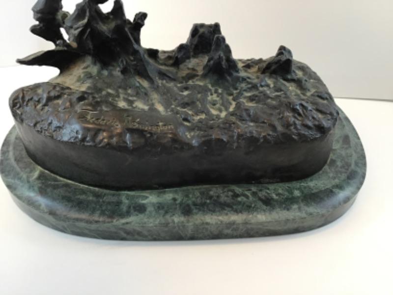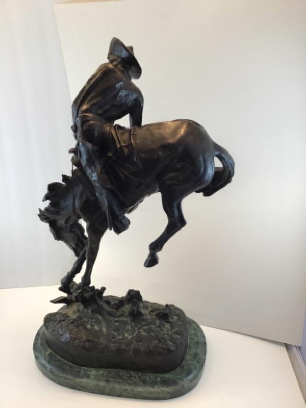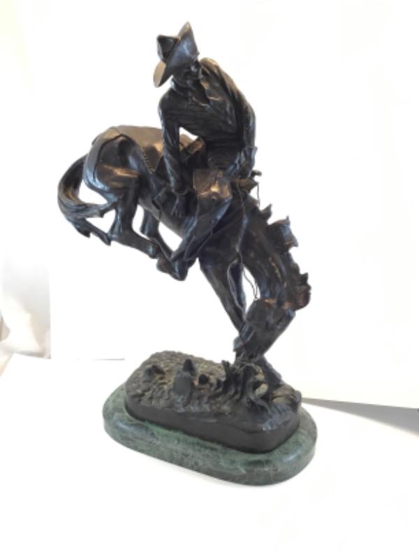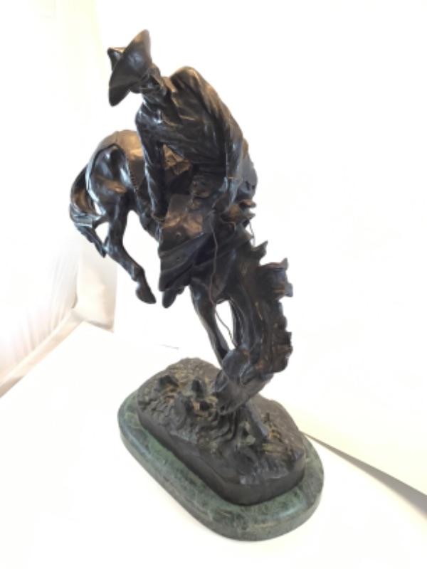 Famed sculptor, Frederic Remington, bronze replica of The Outlaw. Measures 23 inches in height and 14 inches across the base. Base is green marble. This piece is signed and in excellent condition.