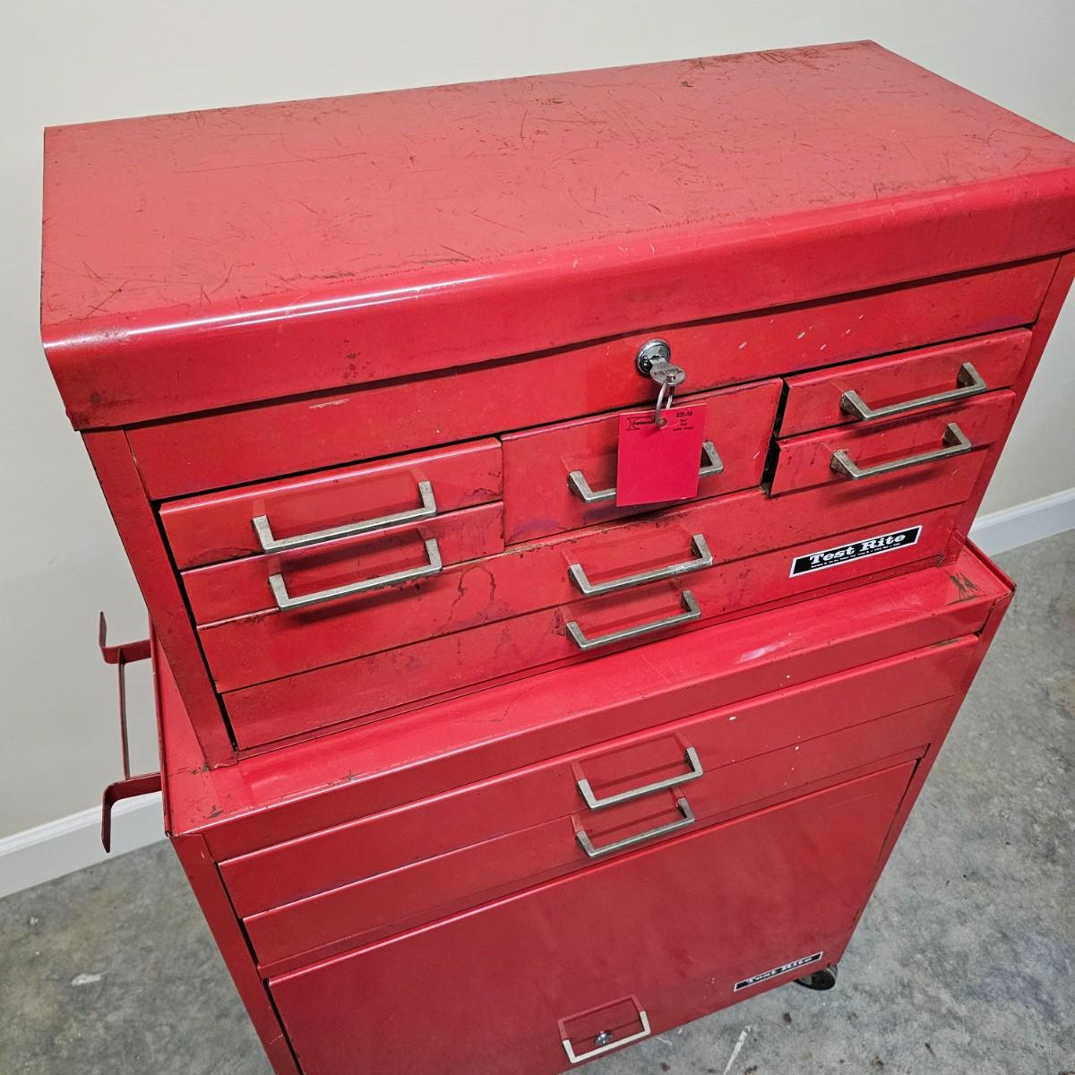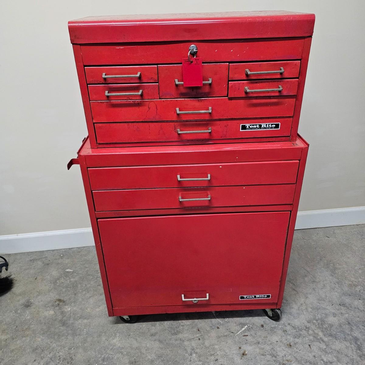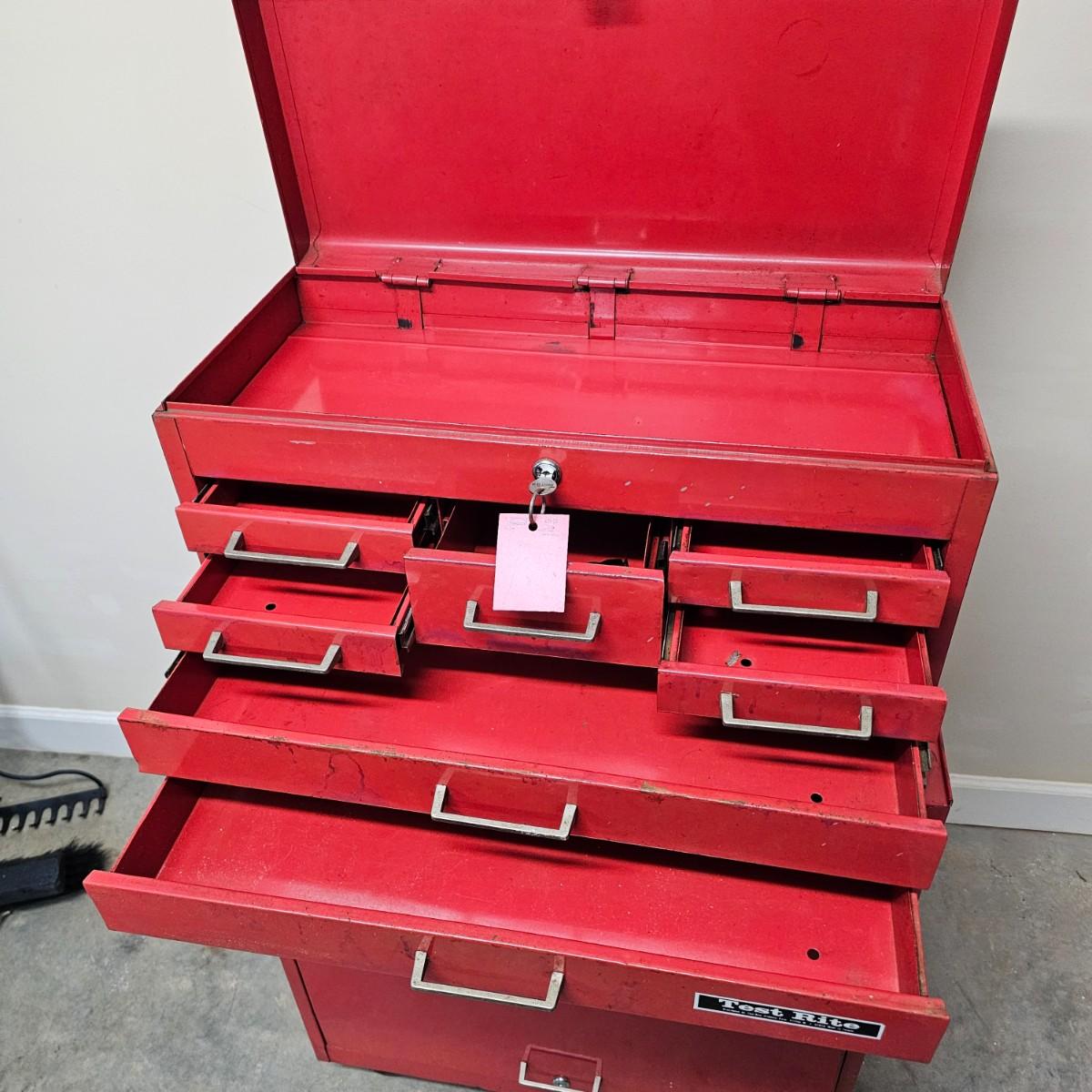 Two stack rolling tool box by Test Rite. Bottom base has two pull out drawers and a lift open storage compartment for bigger items. Top chest has lift open top which releases access to drawers, is also lockable with provided key. Seven assorted size drawers on top plus open space is lid area. Top chest is removable if desired. Toolbox measures 28" x 14" x 42.5"H. All drawers have roller slides. Four small drawers at top don't close all the way but are locked with lid. Various scratches overall and on bent edge on back. See photos for details. Local pickup only.