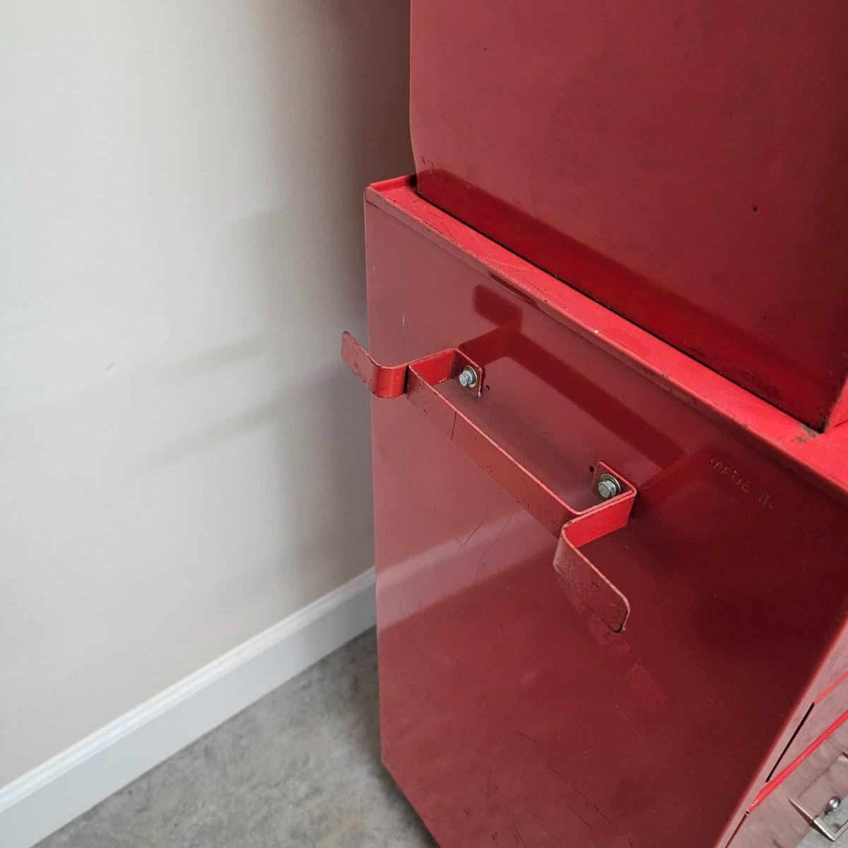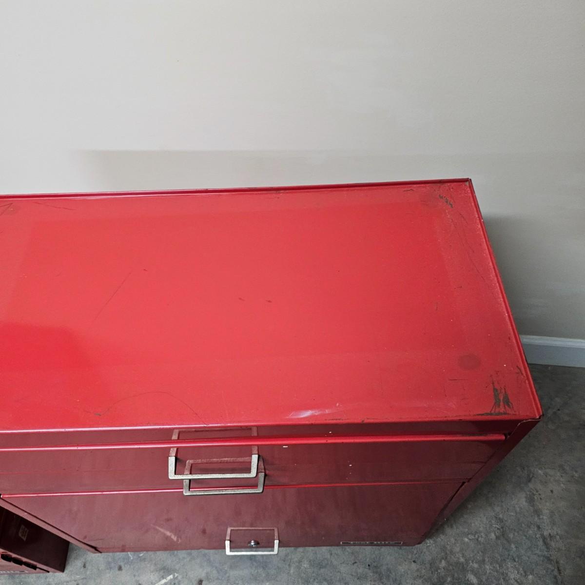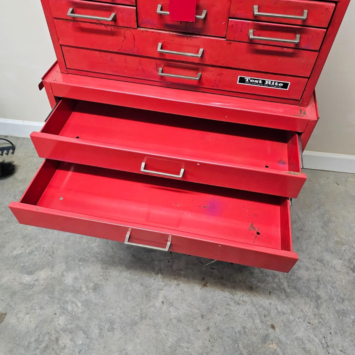 Two stack rolling tool box by Test Rite. Bottom base has two pull out drawers and a lift open storage compartment for bigger items. Top chest has lift open top which releases access to drawers, is also lockable with provided key. Seven assorted size drawers on top plus open space is lid area. Top chest is removable if desired. Toolbox measures 28" x 14" x 42.5"H. All drawers have roller slides. Four small drawers at top don't close all the way but are locked with lid. Various scratches overall and on bent edge on back. See photos for details. Local pickup only.