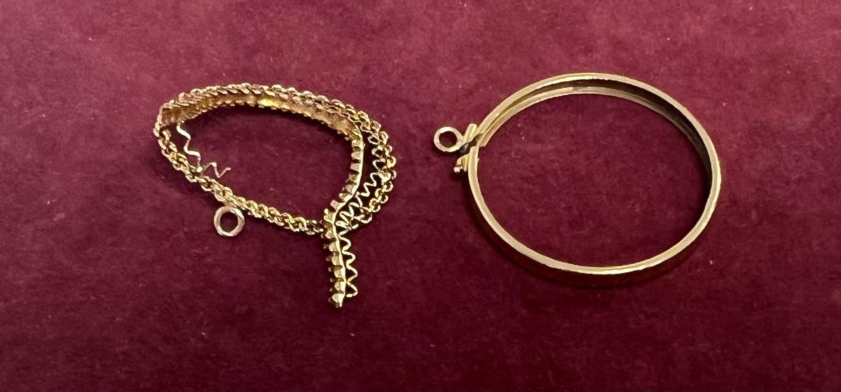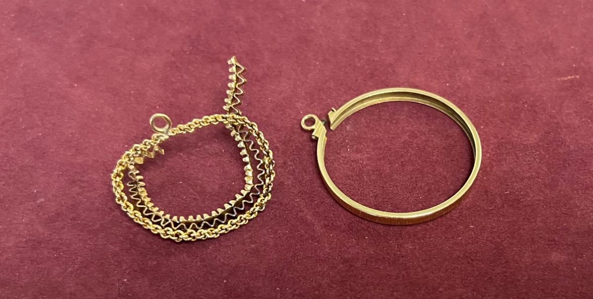 **WIRE TRANSFER IS REQUIRED IF SHIPPED.** [5.58g] Two old coin bezels. Gold content confirmed using Niton XRF precious metals analyzer. **ALL SALES ARE FINAL ON PRECIOUS METALS. NO REFUNDS GIVEN FOR ANY REASON.** [LA]