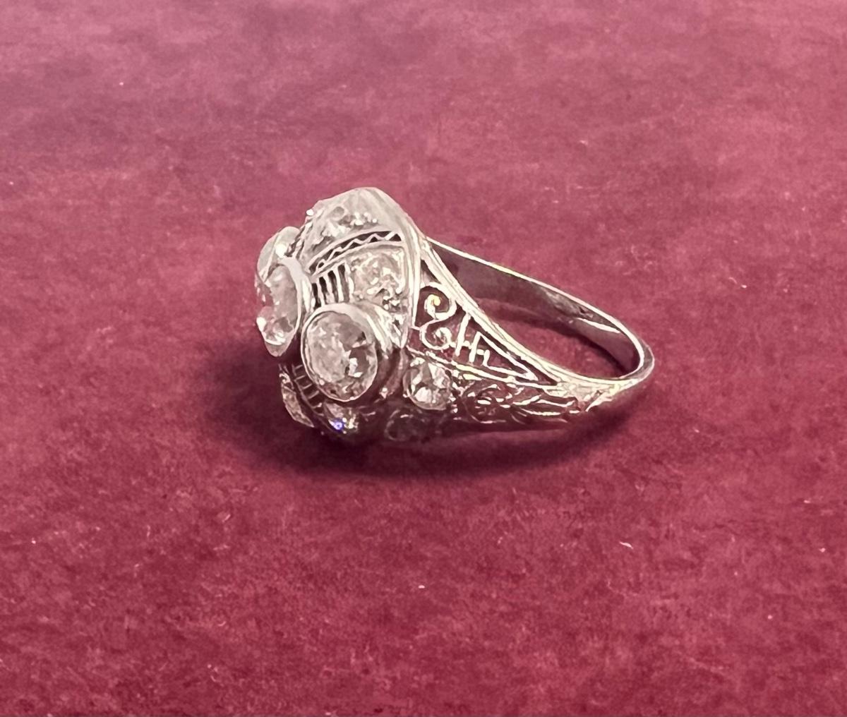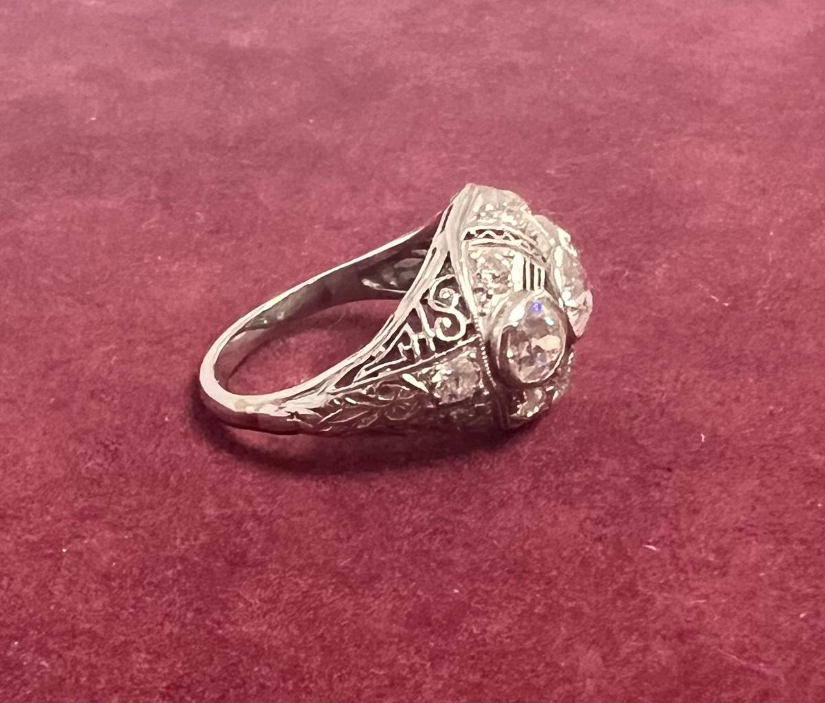 **WIRE TRANSFER IS REQUIRED IF SHIPPED.** [5.68g] Has a total of 11 miner cut diamonds, ranging in size from approximately .1 to .5 carats. Ring size is 6. Metal content confirmed using Niton XRF precious metals analyzer. Stones confirmed using Gemoro Ultra Tester. **ALL SALES ARE FINAL ON PRECIOUS METALS. NO REFUNDS GIVEN FOR ANY REASON.** [LA]