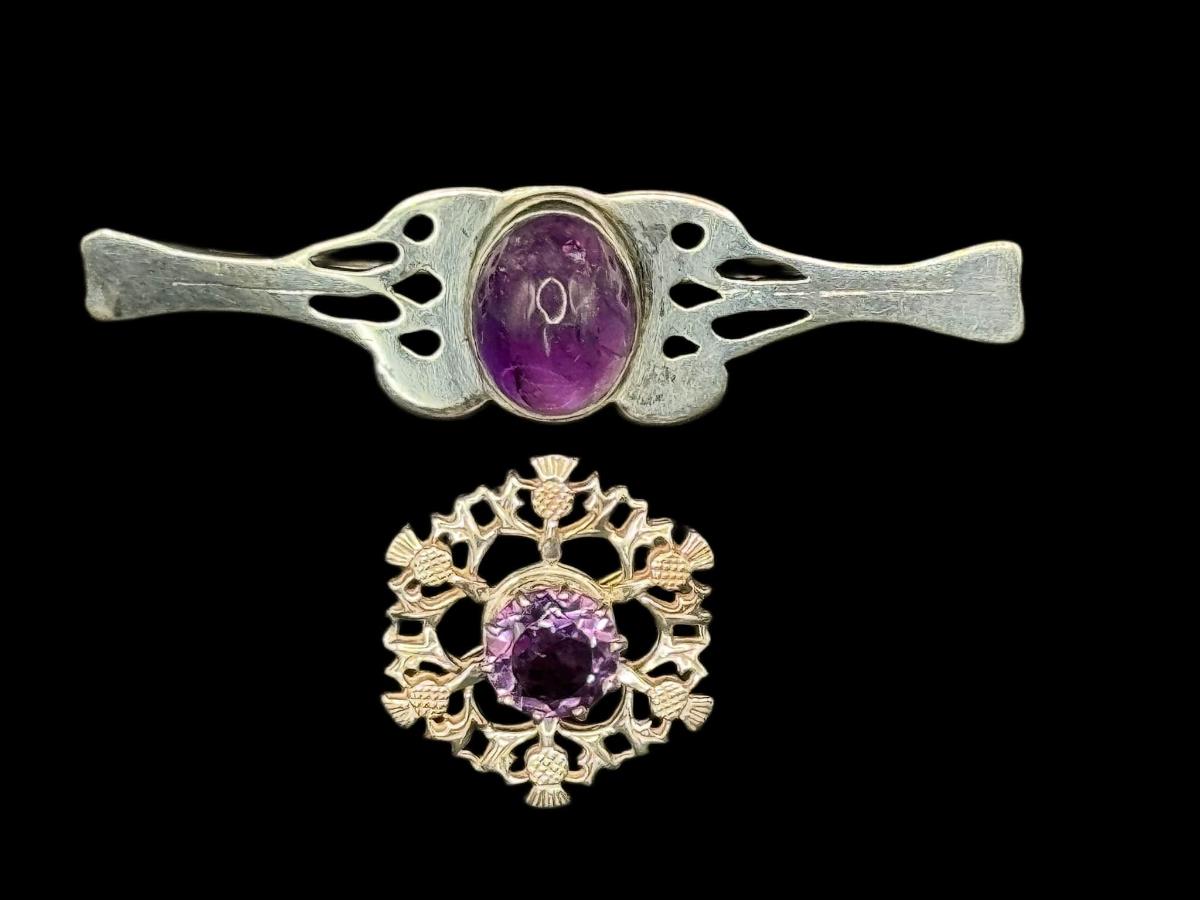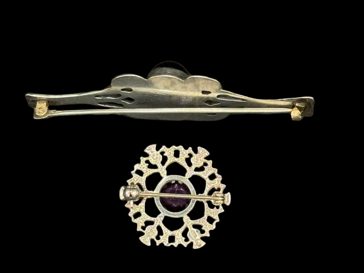 **WIRE TRANSFER IS REQUIRED IF SHIPPED.** [14.62g] Includes a faceted amethyst pin, and a bezel set amethyst cabochon pin. Measurement of largest: 2.75”. Silver content confirmed using Niton XRF precious metals analyzer. **ALL PRECIOUS METALS SALES ARE FINAL. NO REFUNDS WILL BE GIVEN FOR ANY REASON.** [RM]