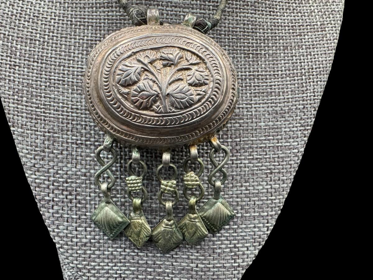 [28.50g] This is believed to be a prayer box. It is on the original cord. There is age related wear. The weight is approximate, and does not include the cord. Measurement: 1.75”W x 3”H. Silver content confirmed using Niton XRF precious metals analyzer. [JP]