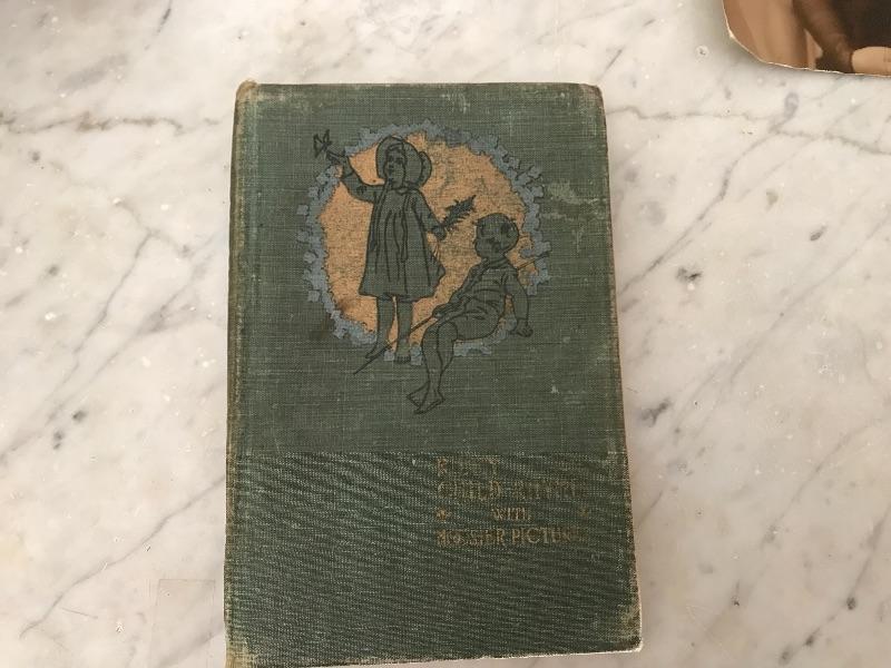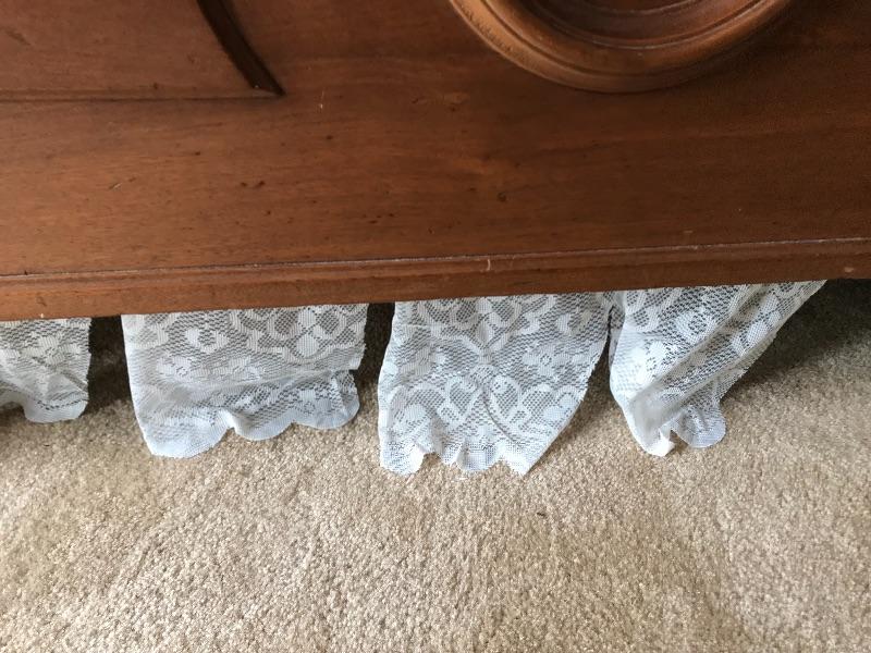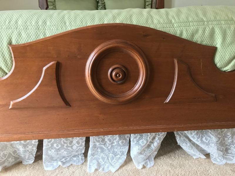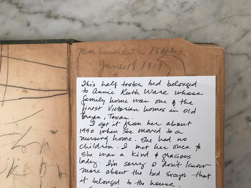 Walnut Victorian Half - Tester Bed. - all decked out for a girl. Drapery behind the head board and lace on half tester are included. This is a wonderful bed in fabulous condition. One item the homeowner wants to include with the bed is a book that she discovered when she purchased the bed. (See Picture). The book was given to the original owner of the bed given to her by her father in 1919.