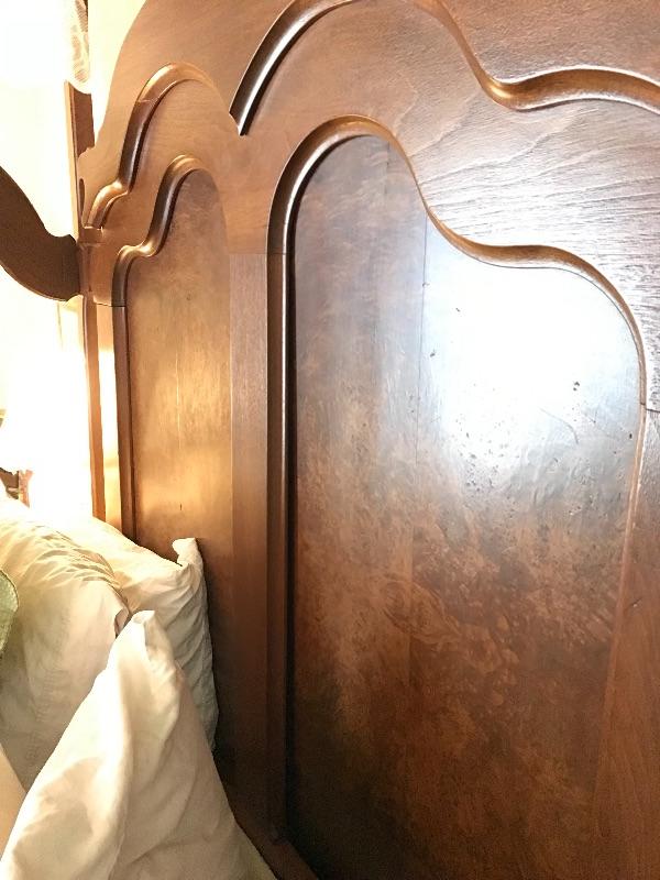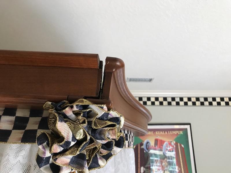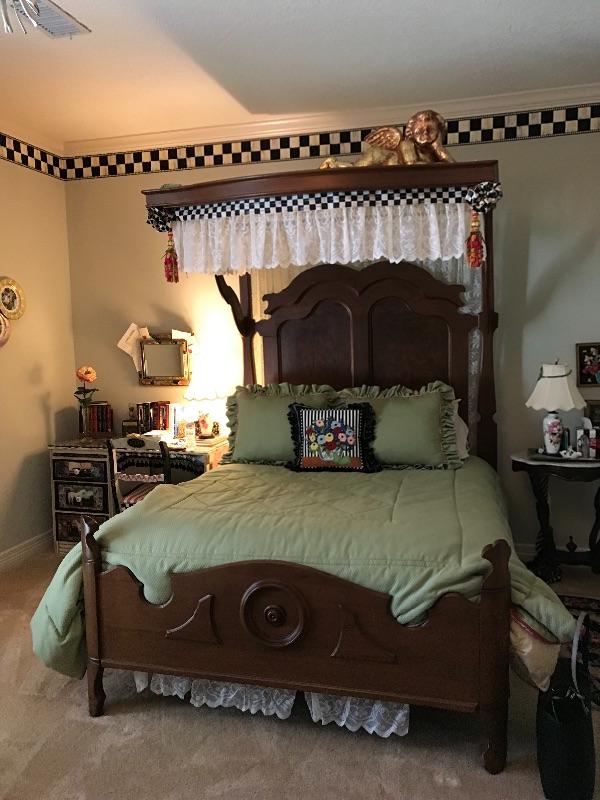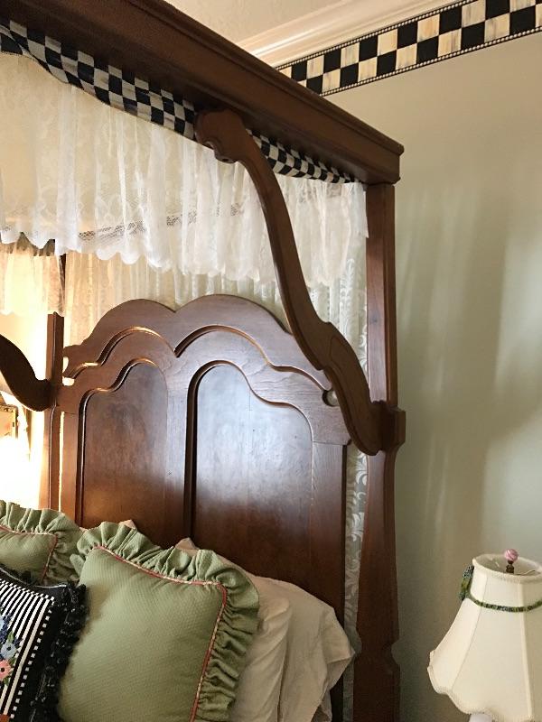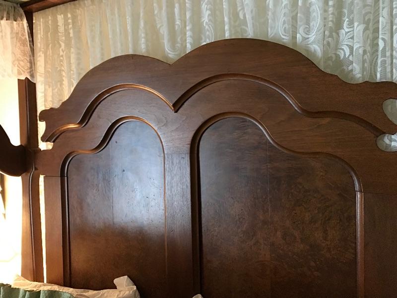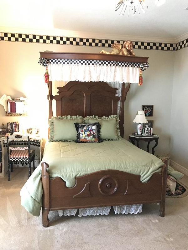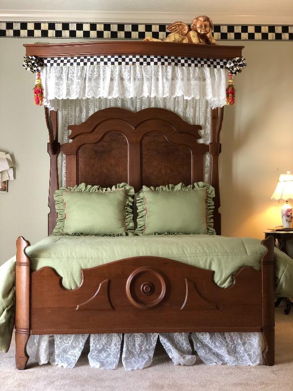 The bed measures 62.5 inches wide at the widest X 78 inches long X 7 feet tall. The tester comes out from the head board 50 inches at the widest and the head board is 52 inches tall. The bed has one small area that may need attention please see picture. The tassels and angel are not included. Bedding and drapes maybe purchased in separate lot.