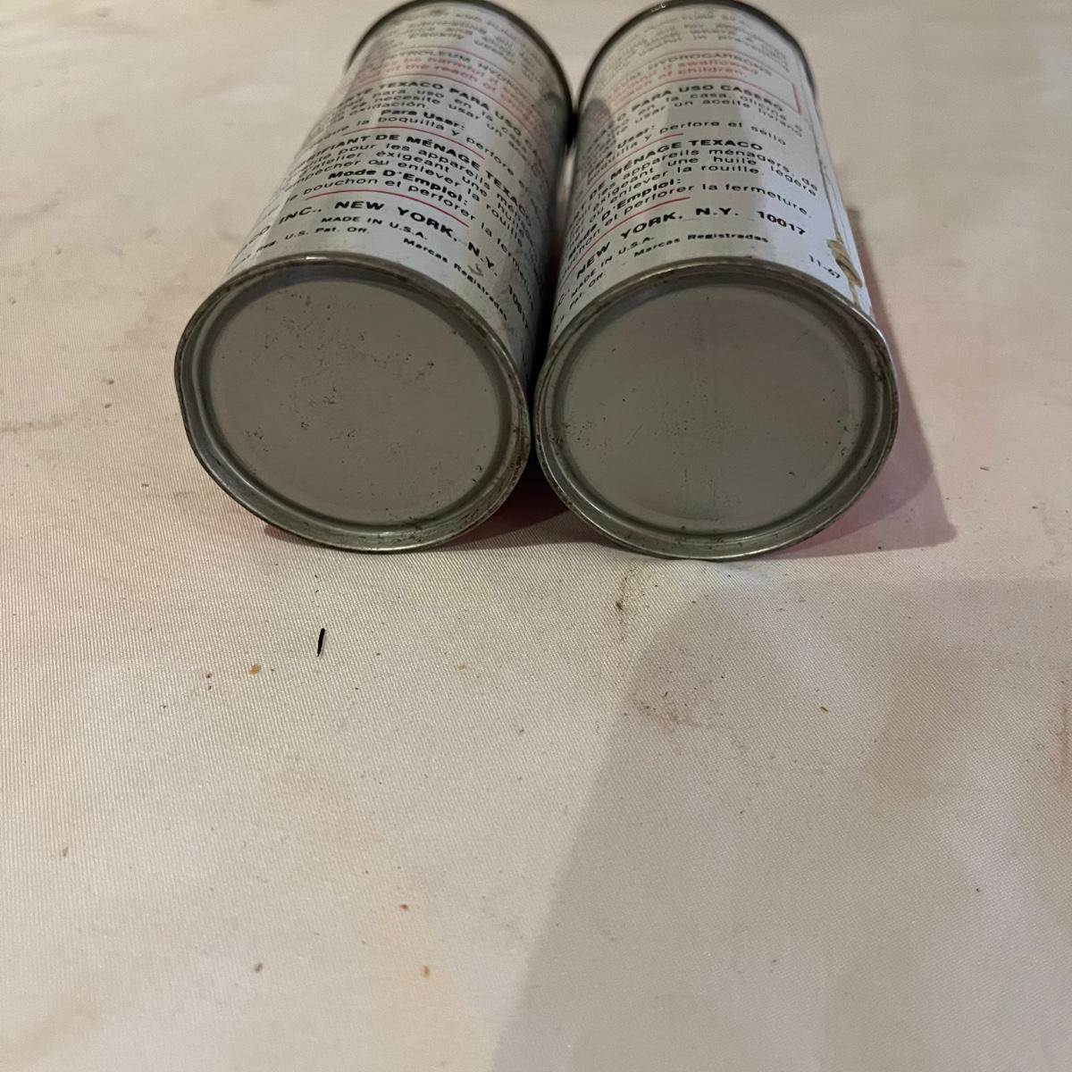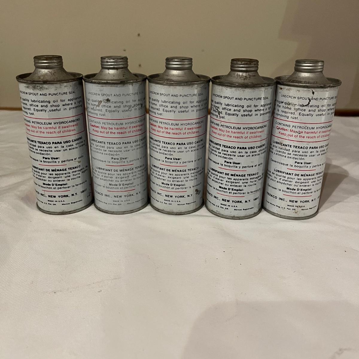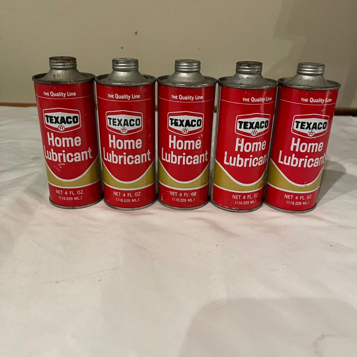 Lot includes seven metal Texaco Home lubricant 4 Fluid oz. cans. All seven have contents and appear unopened. Cans measure 1.75”D x 4.5” tall.
