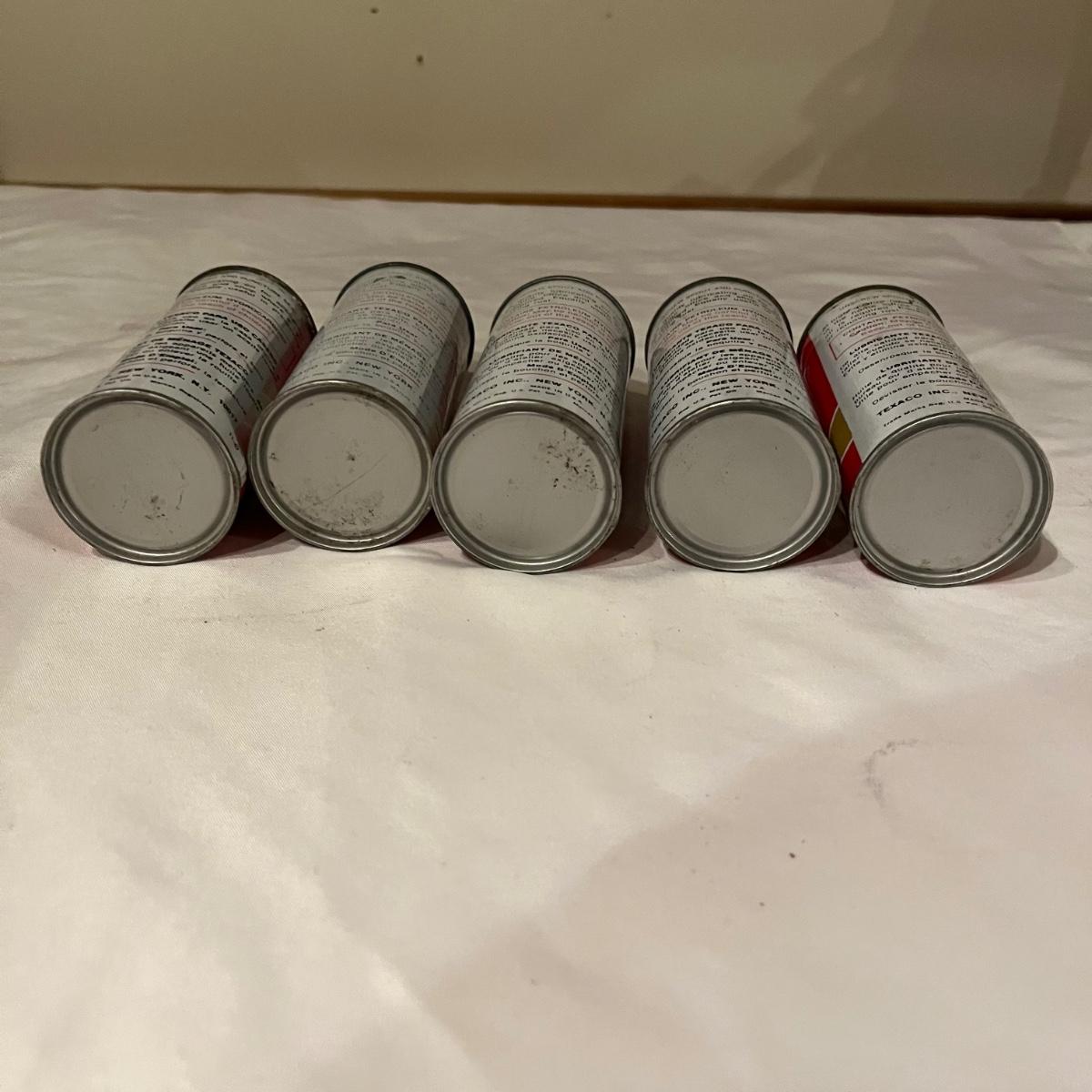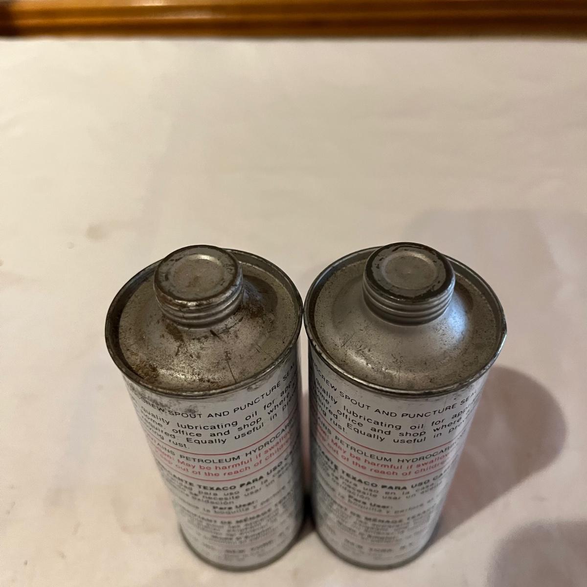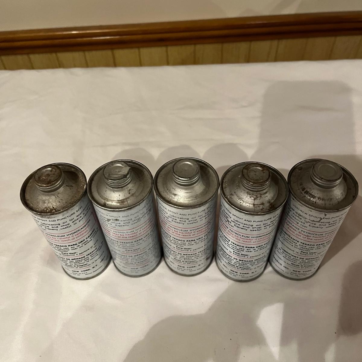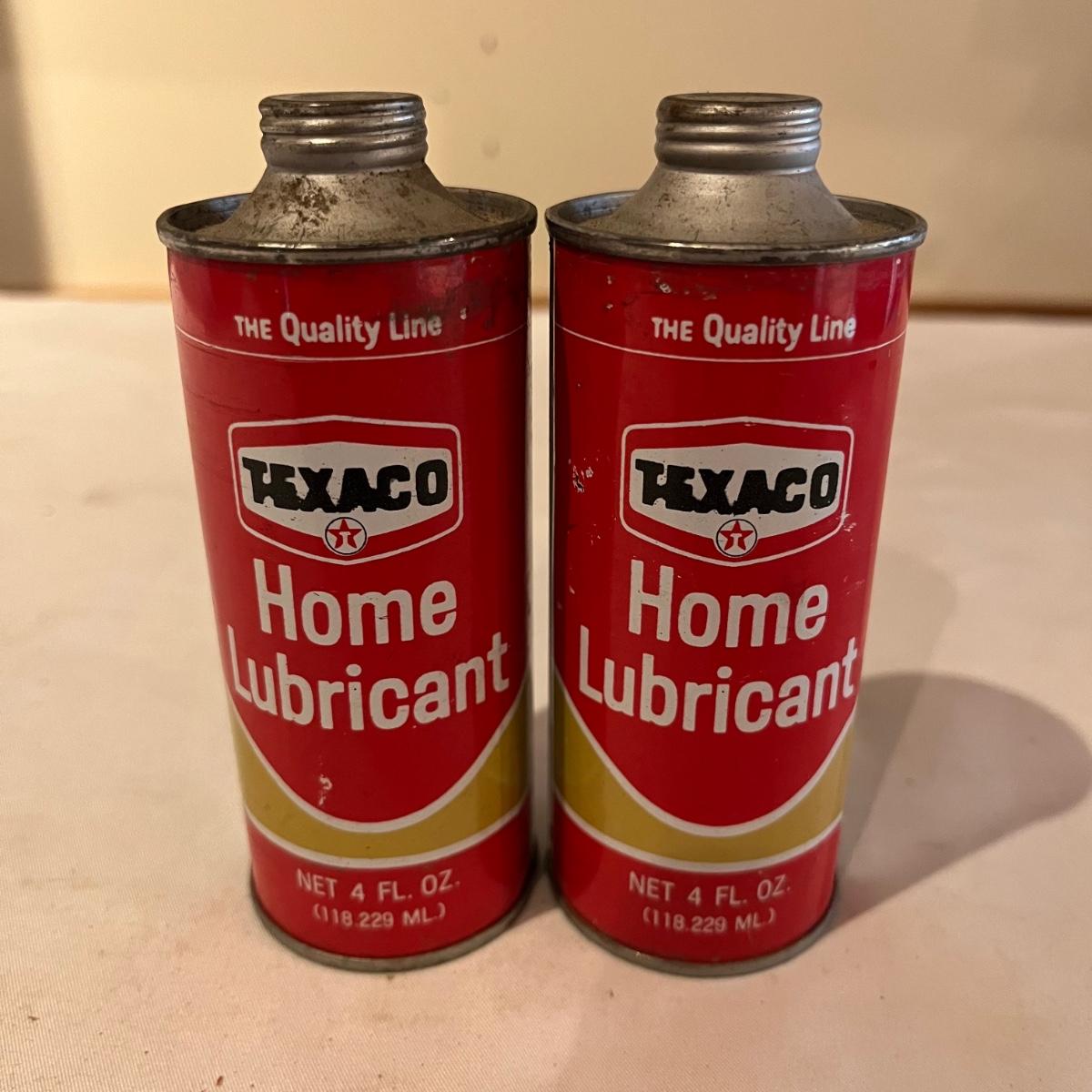 Lot includes seven metal Texaco Home lubricant 4 Fluid oz. cans. All seven have contents and appear unopened. Cans measure 1.75”D x 4.5” tall.