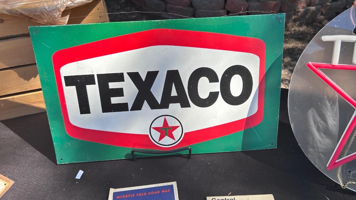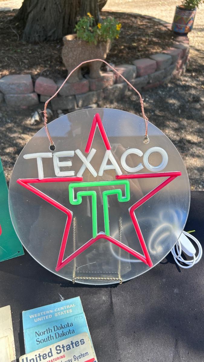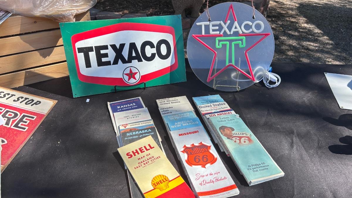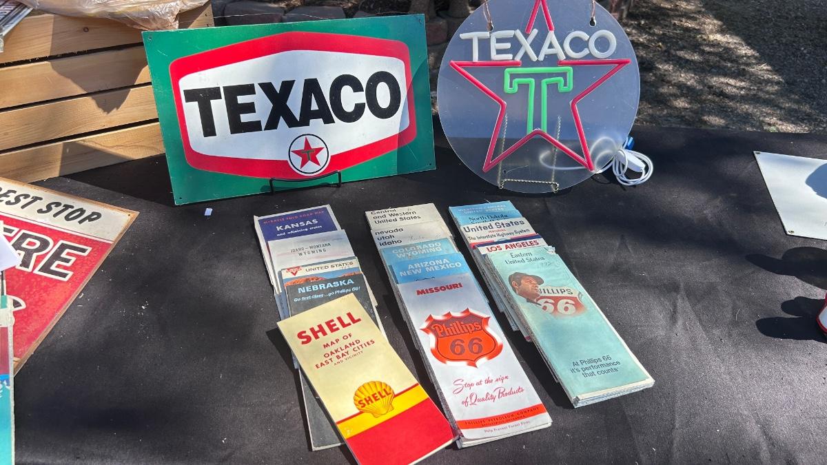 TEXACO SIGN, LED LIGHT AND VINTAGE ROAD MAPS