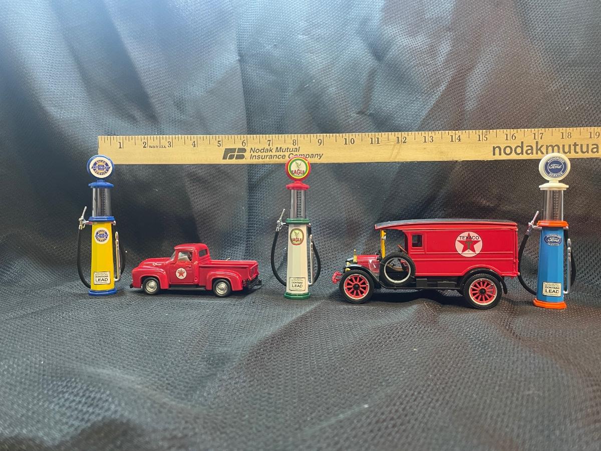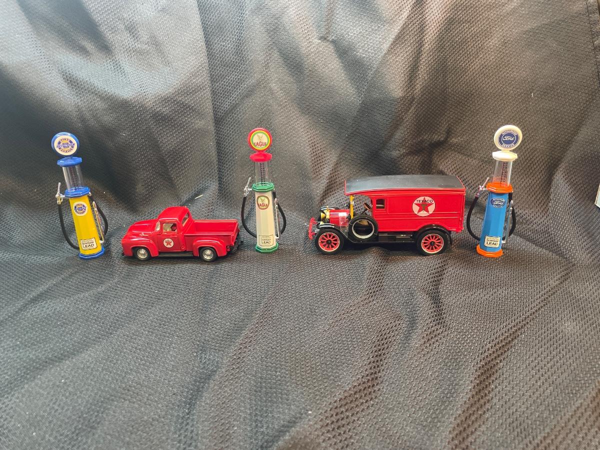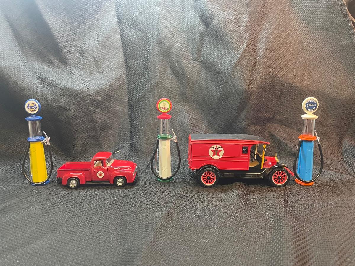 Texaco trucks and Chevrolet, Ford and Eagle gas pumps