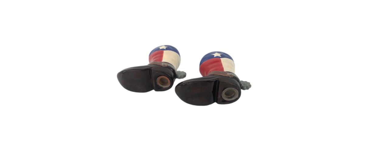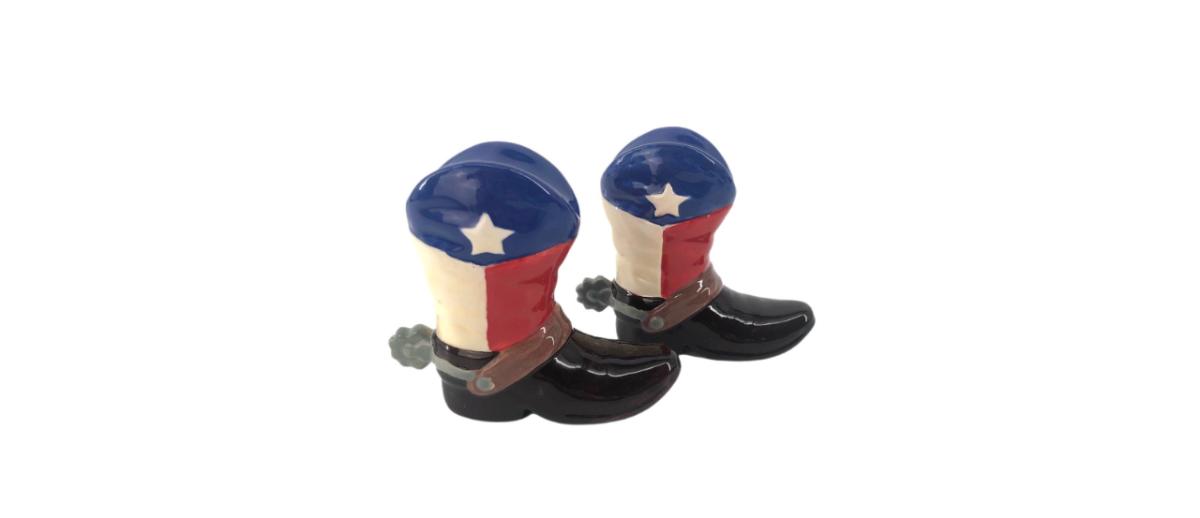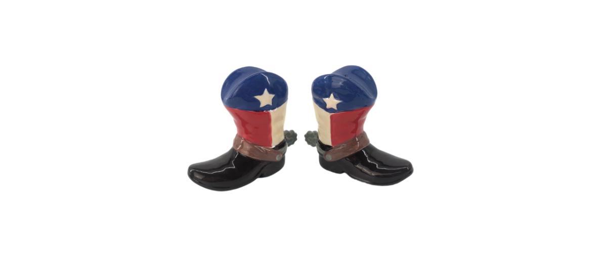 Pair of ceramic Texas flag cowboy boot salt and pepper shakers! Each measures 4” x 3.5”. In good condition!