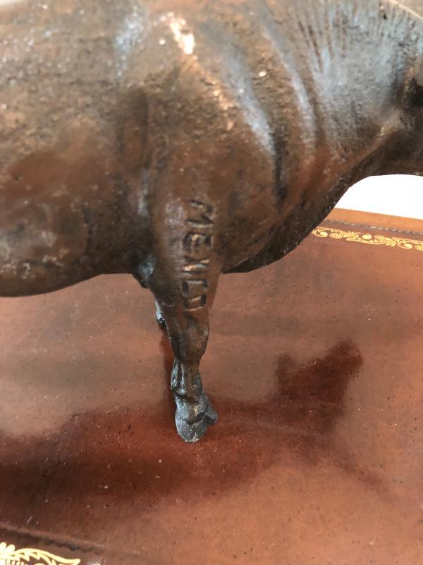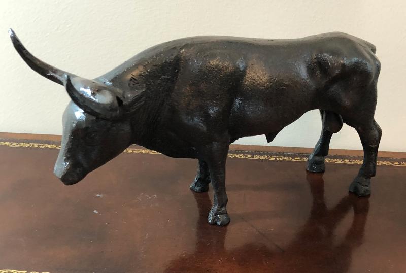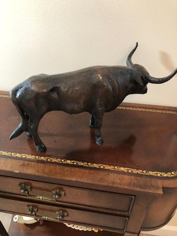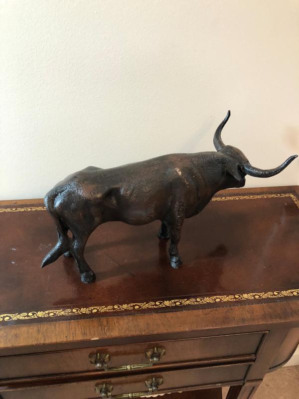 Cast metal bull made in Mexico, 12" long. If you require shipping please be aware that the cost of shipping may be more than what the item cost. All items ship from zip code 84109, you can go to USPS.com for estimates of cost.