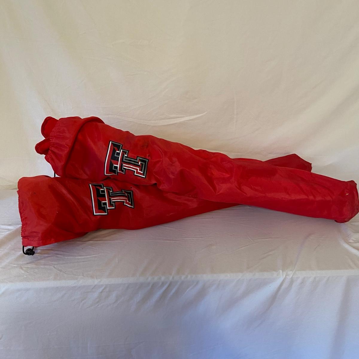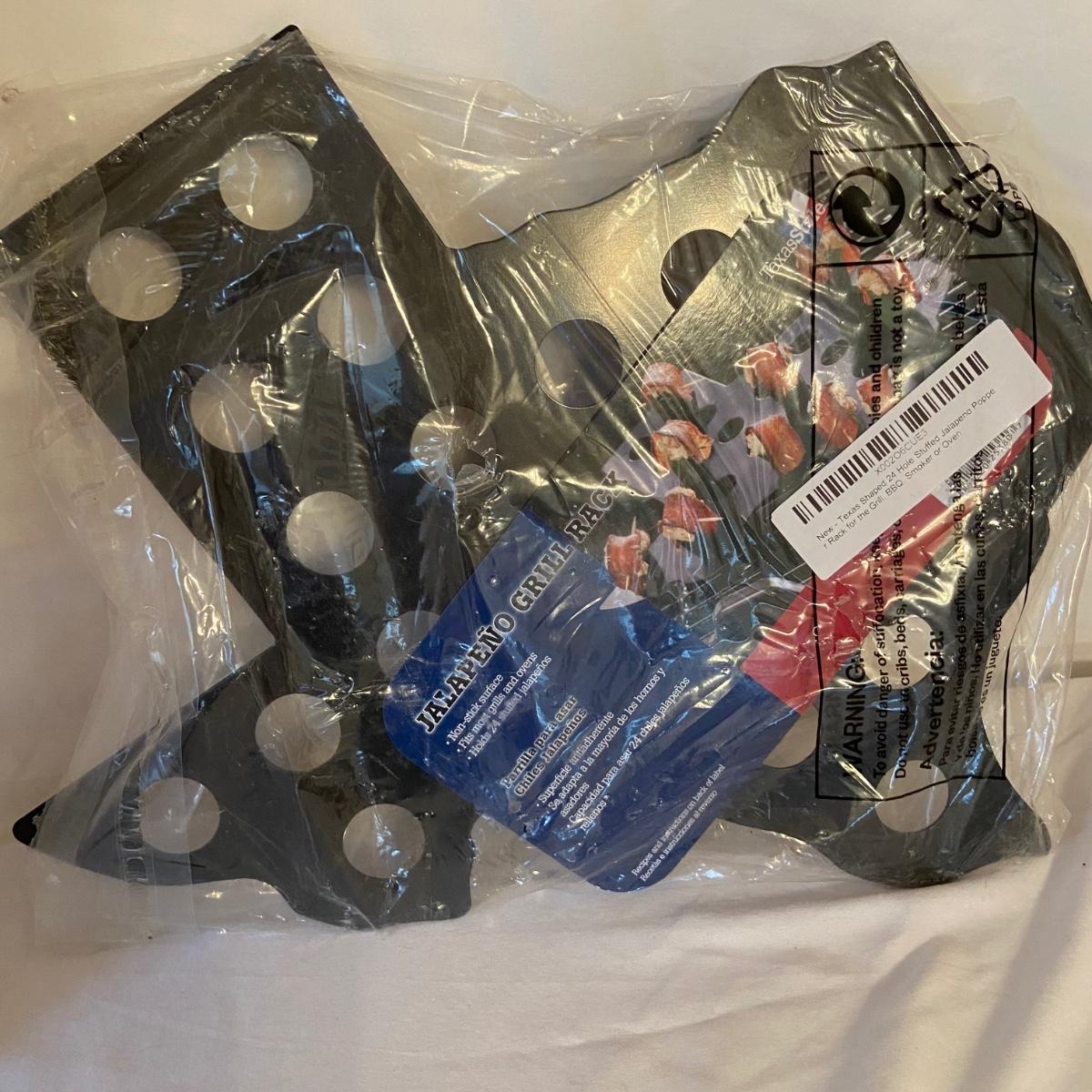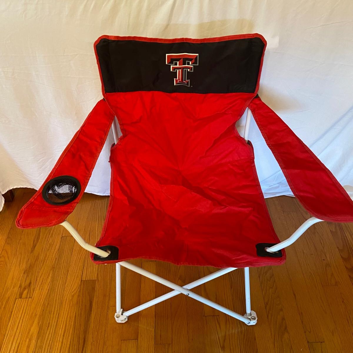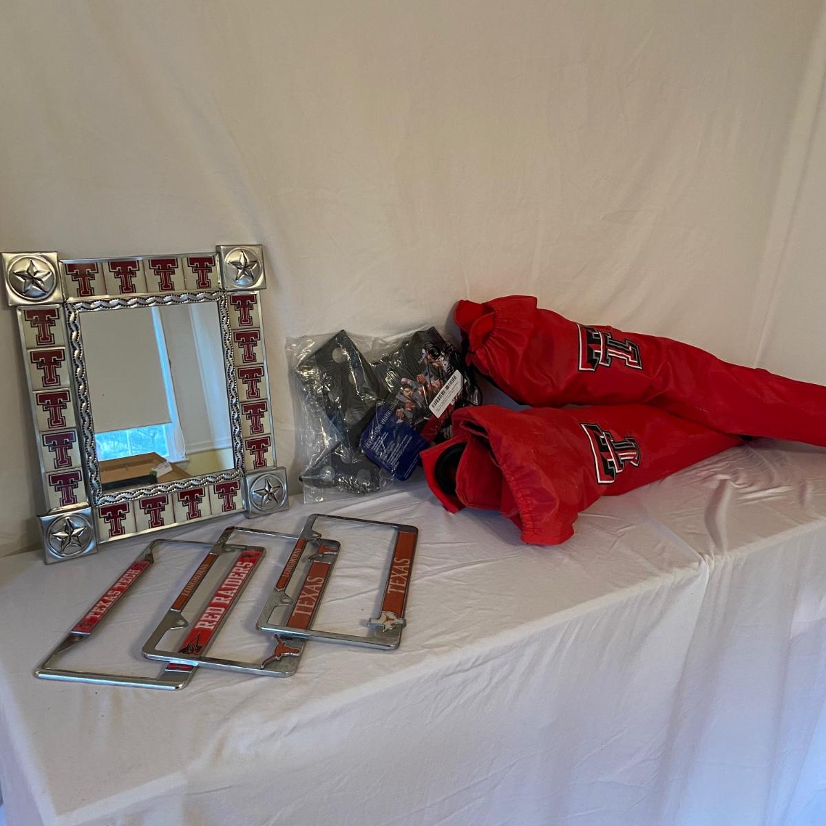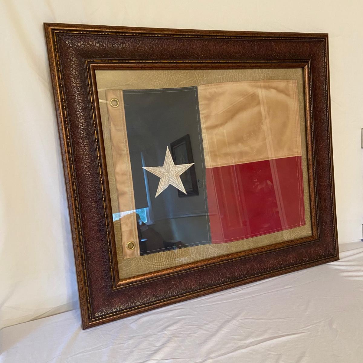Lot includes a framed Texas state flag that measures 31” x 27” the frame appears to be plastic with leather appearance. Also included are three metal Texas license plate frames, a Texas shaped jalapeño grill rack, a small Texas mirror that measured 12.5” x 15.75” and two cloth Texas folding lawn chairs. Shipping available.