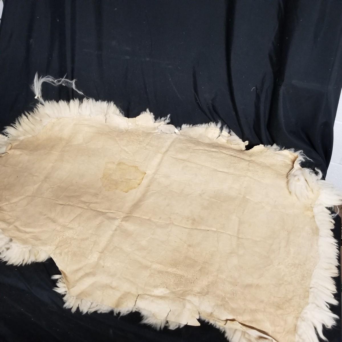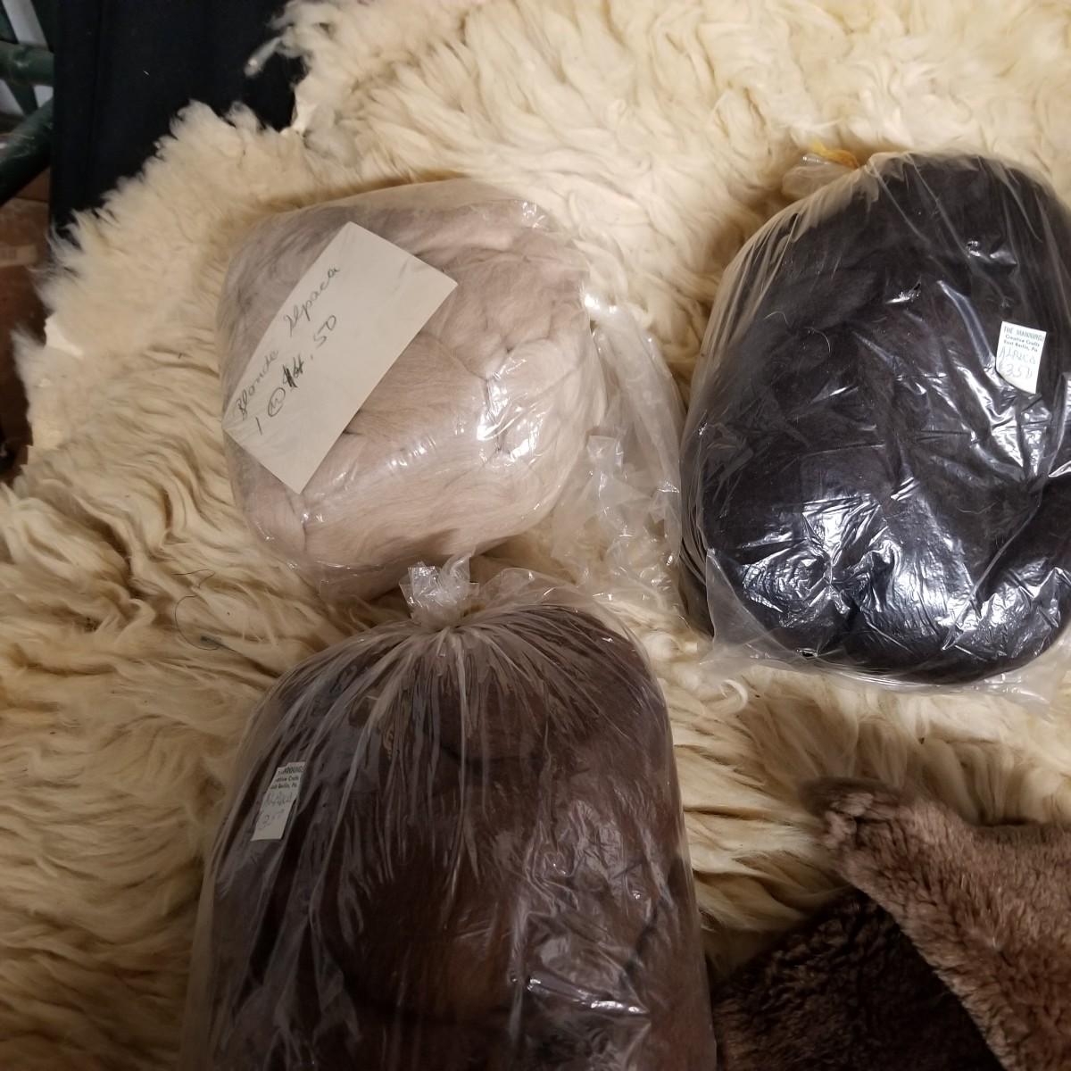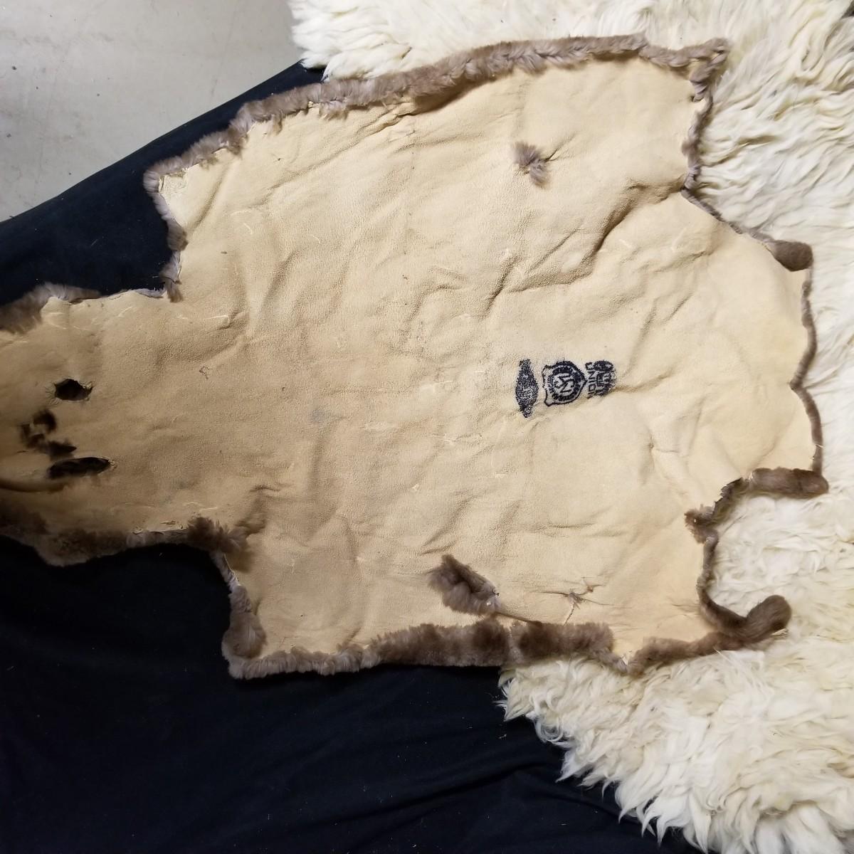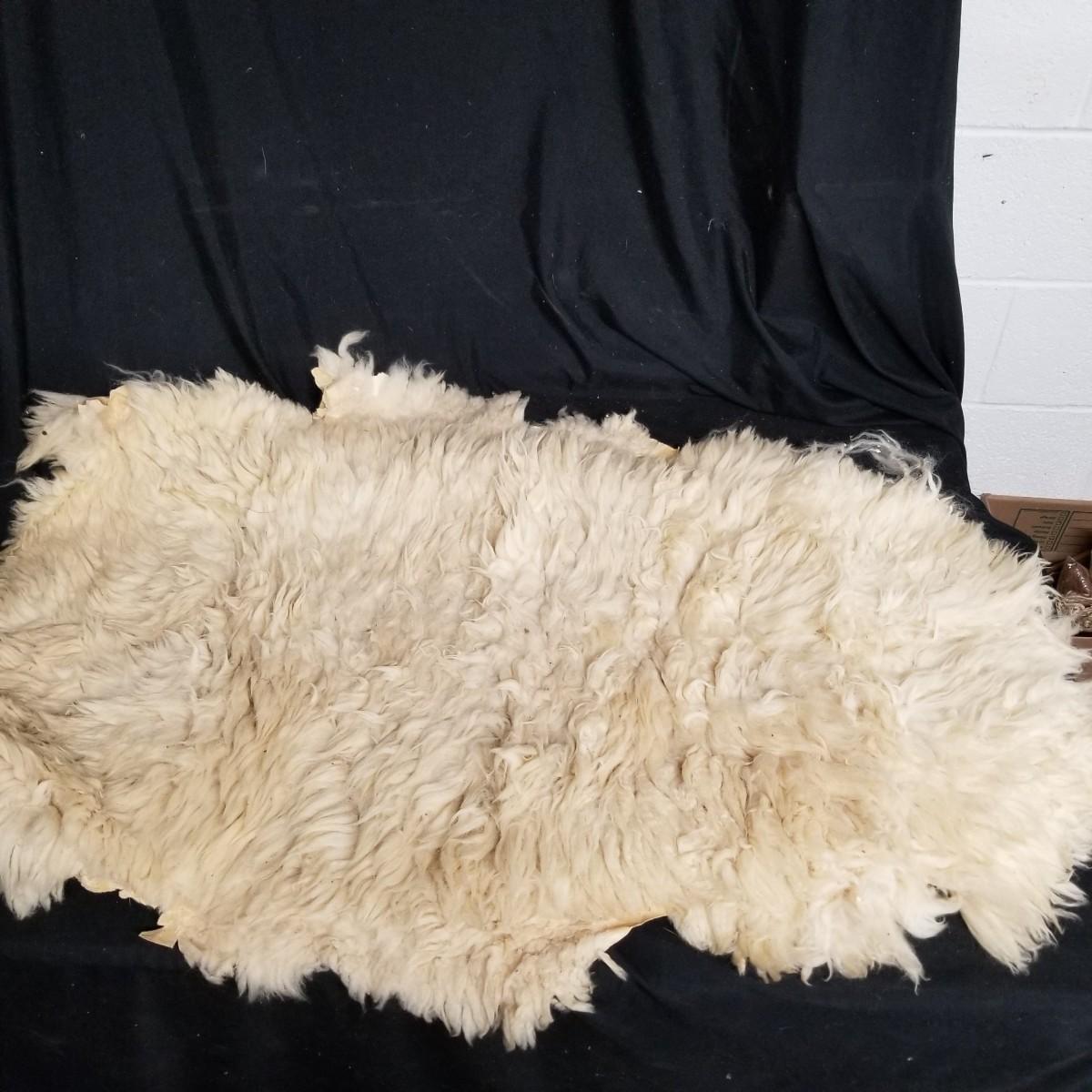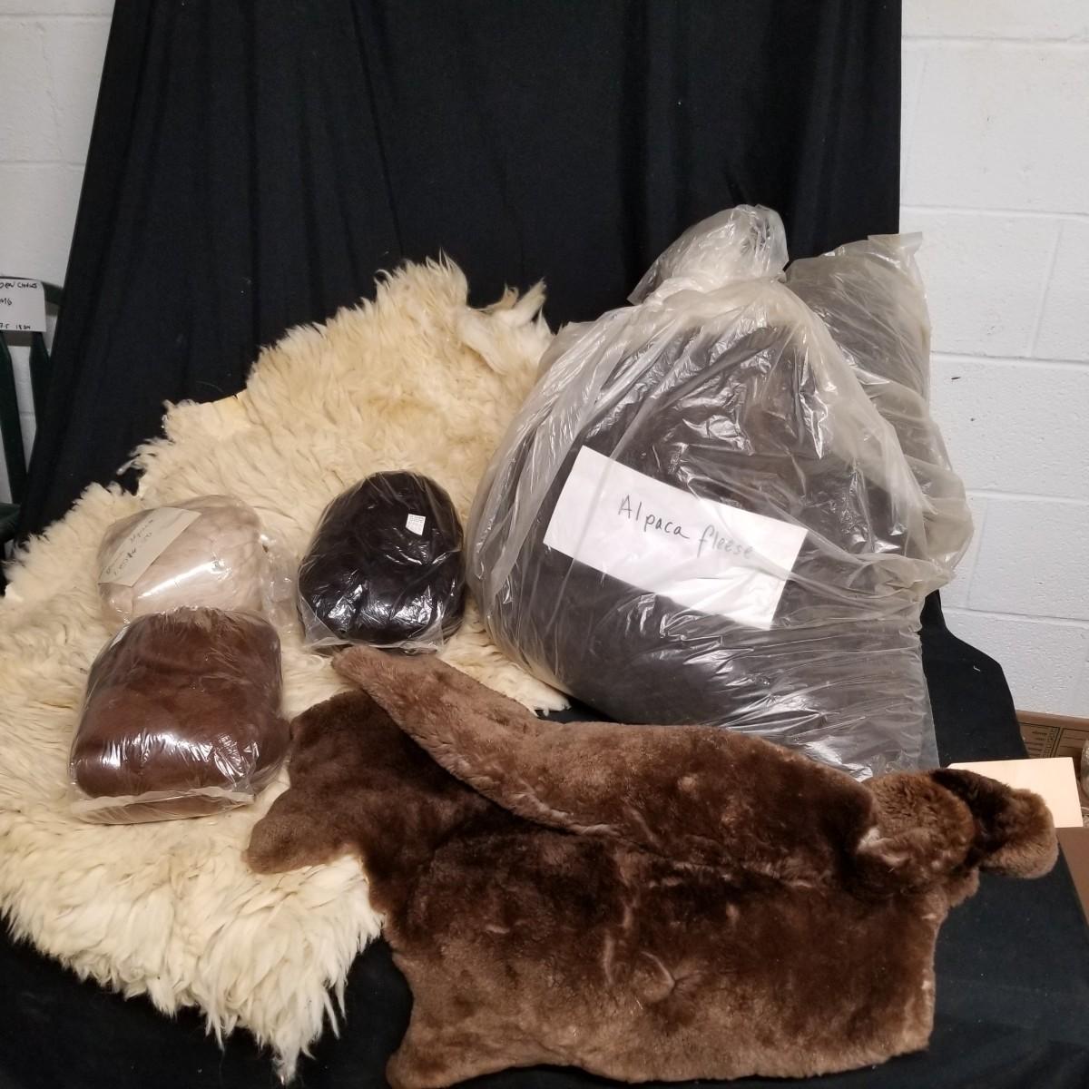 A mixture of textile items.  One full raw alpaca fleece, @ 5-7lb, one sheepskin rug, measures 43"x28". Three bags of alpaca yarn, @ one pound each, and one item that is marked as a beaver pelt which is 32"x23". See photos for details. Local pick up only