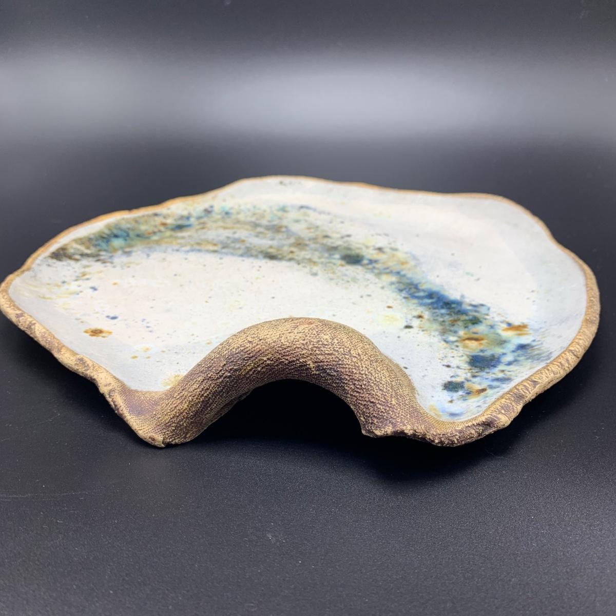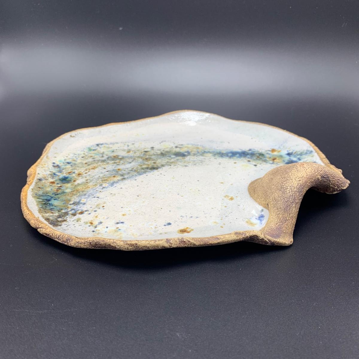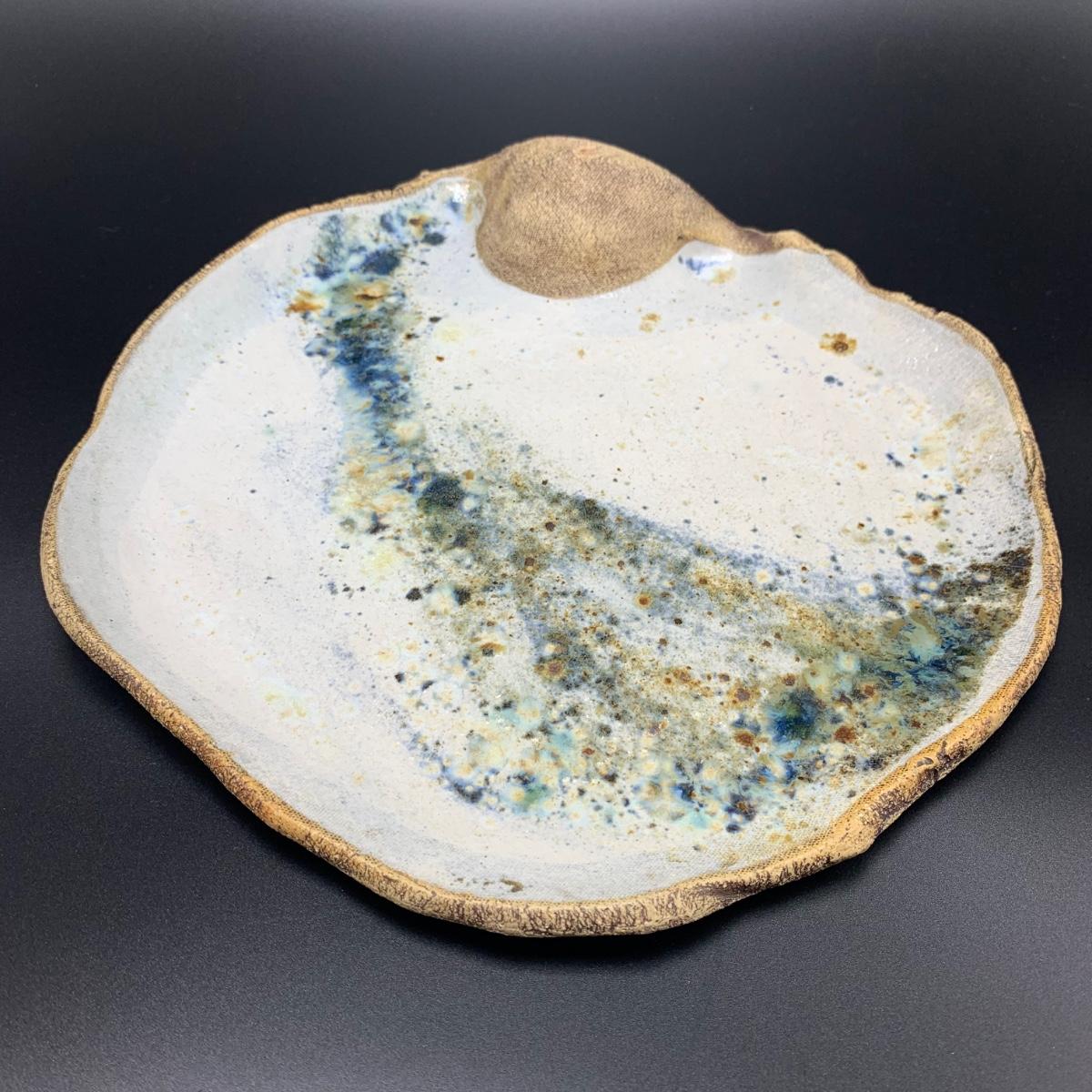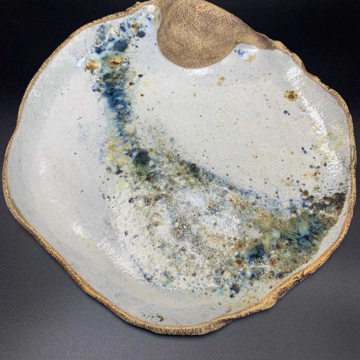 This lovely platter has earthy greens, blues, and browns, speckled within its ivory colored glaze. It has textured and has uneven edges. It is signed on the back and dated 2016. It measures about 11.25” x 10.5”. It appears to be in excellent condition. Shipping available.