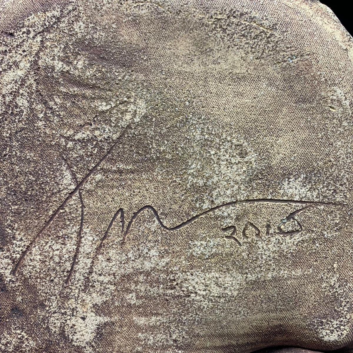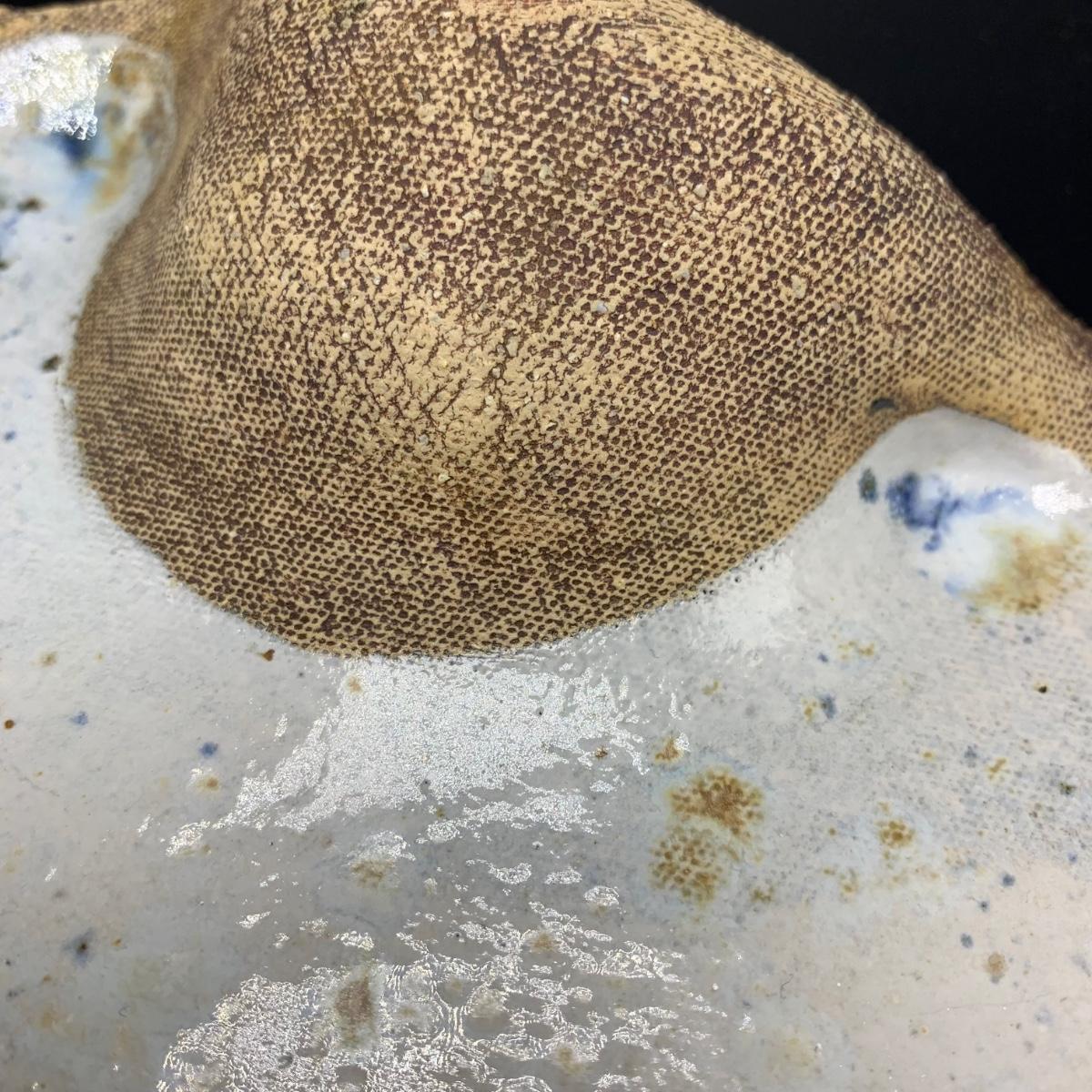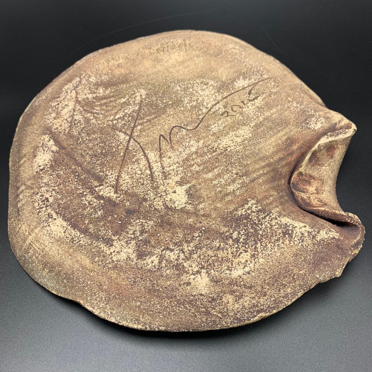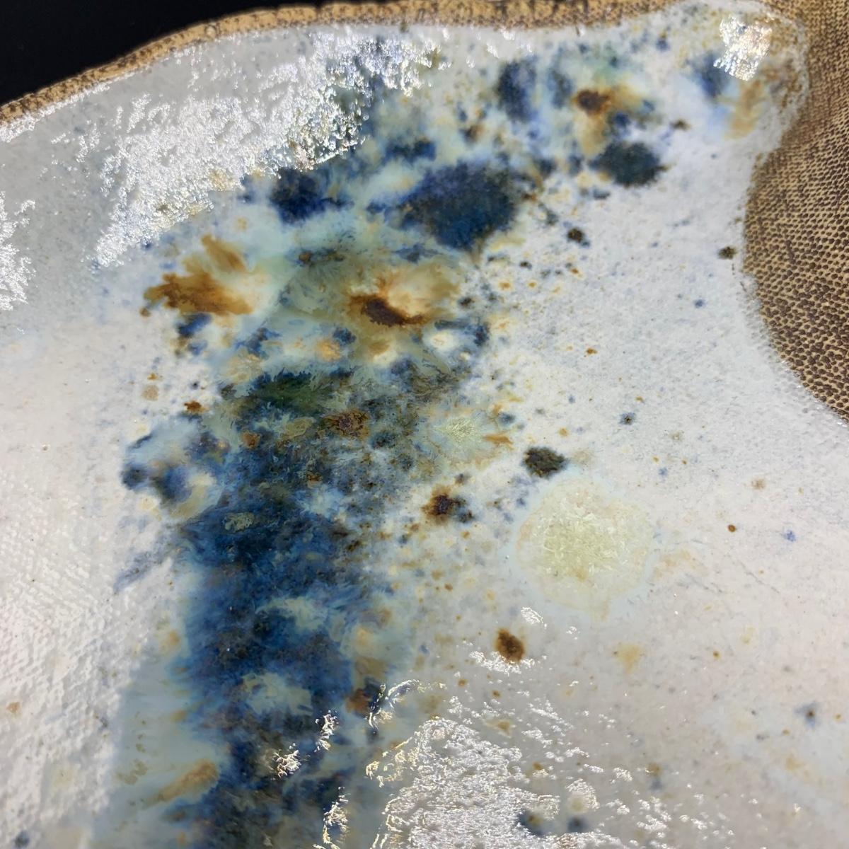 This lovely platter has earthy greens, blues, and browns, speckled within its ivory colored glaze. It has textured and has uneven edges. It is signed on the back and dated 2016. It measures about 11.25” x 10.5”. It appears to be in excellent condition. Shipping available.