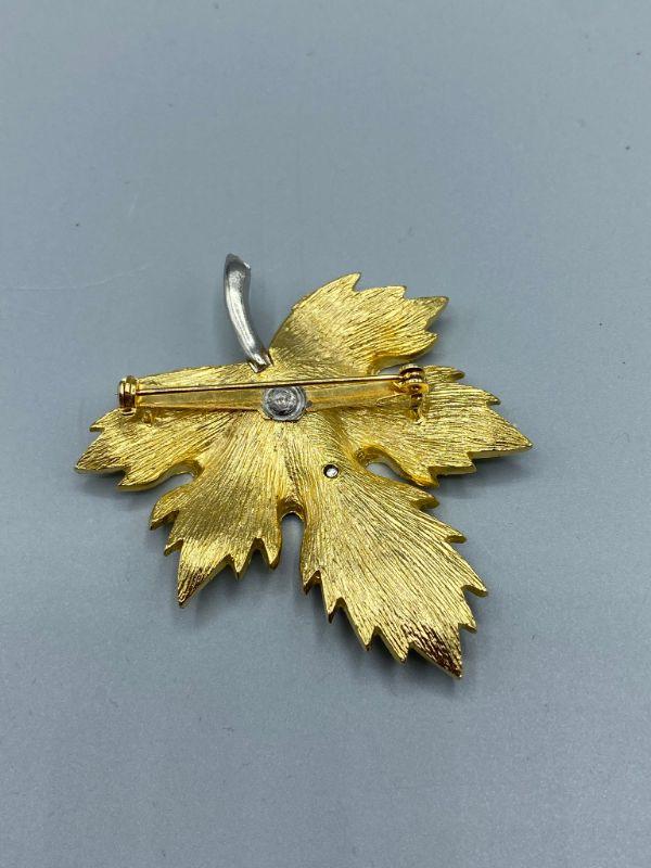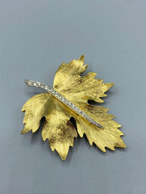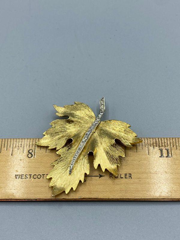 Vintage textured gold tone leaf pin. Clear rhinestone for the center and stem. No missing stones. About 2.5" size.