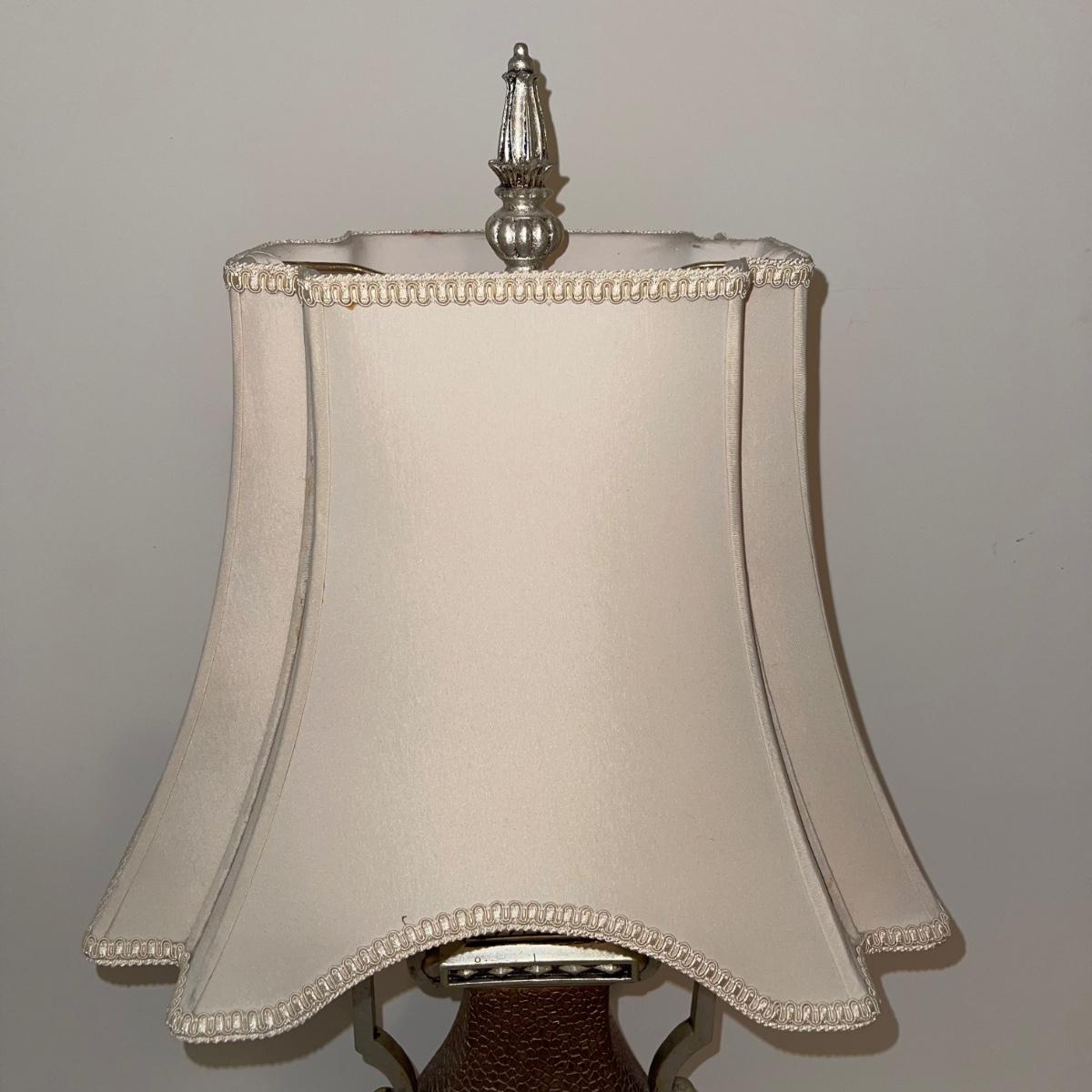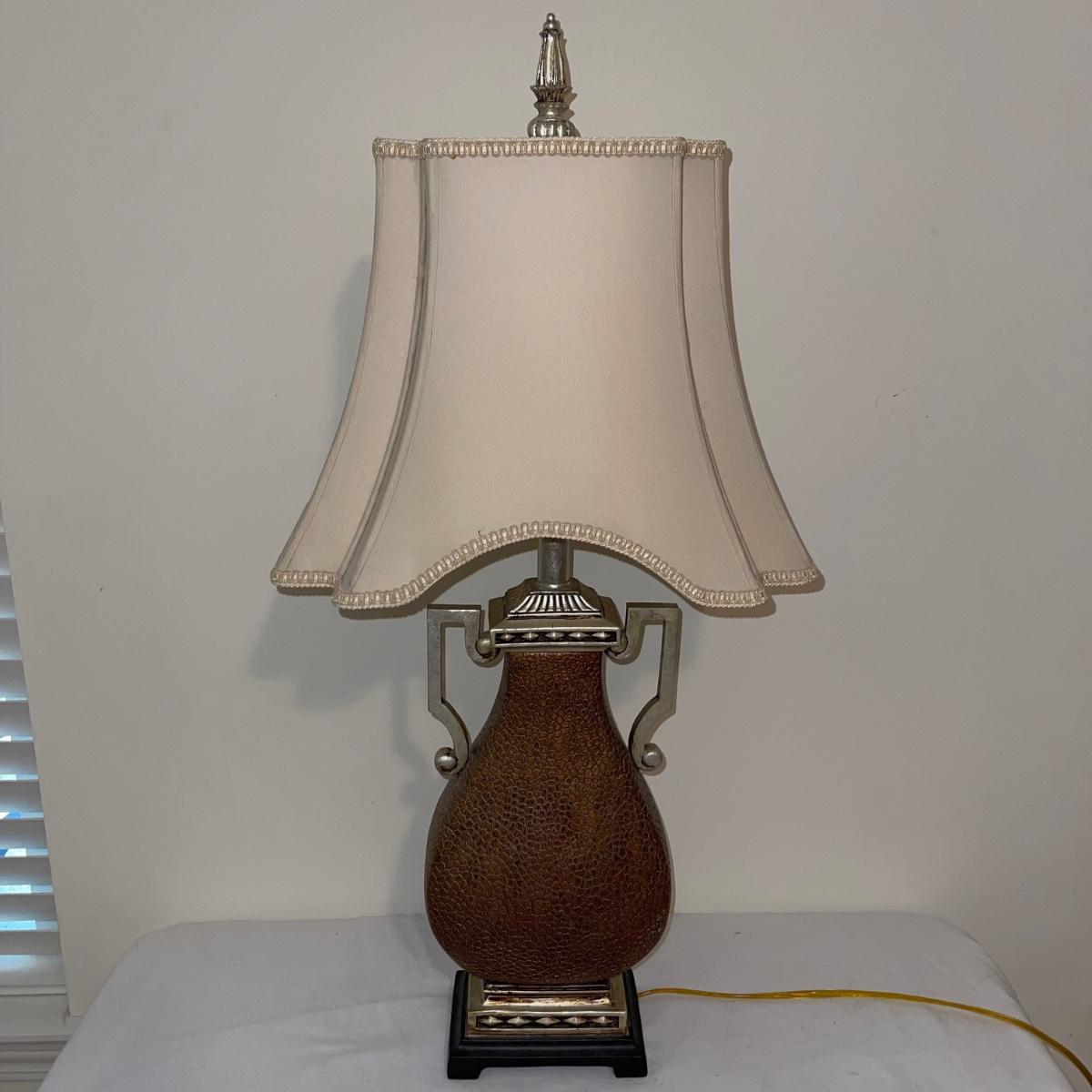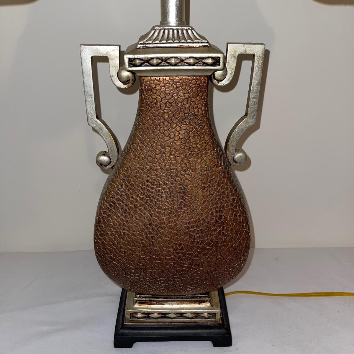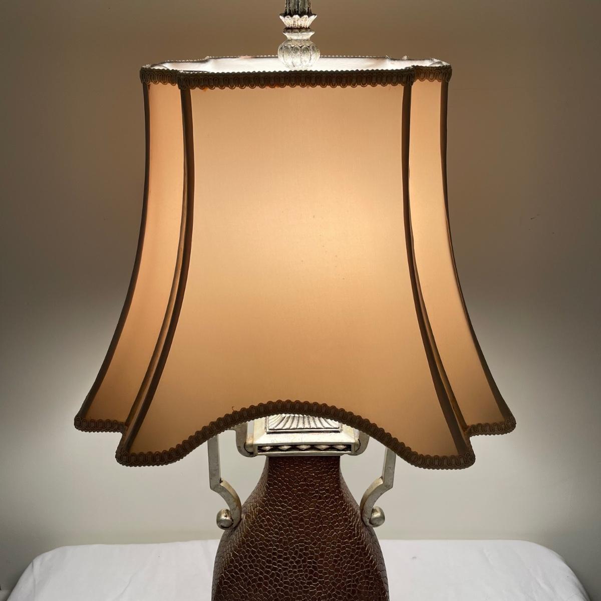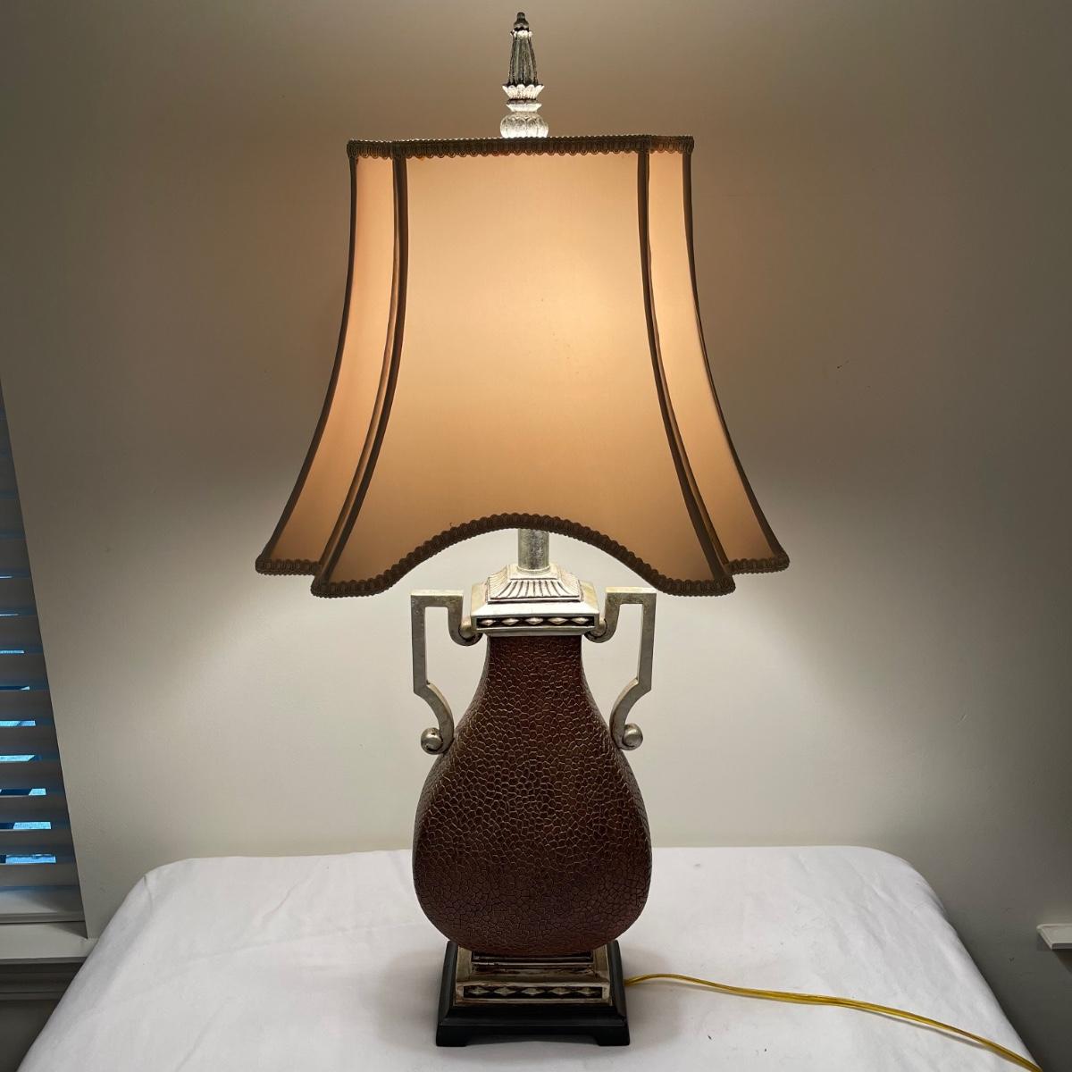 This ceramic lamp has a textured brown base with silver colored handles on either side and a beige colored rectangle lampshade with inverted corners. It is in working condition and it is 33” tall.