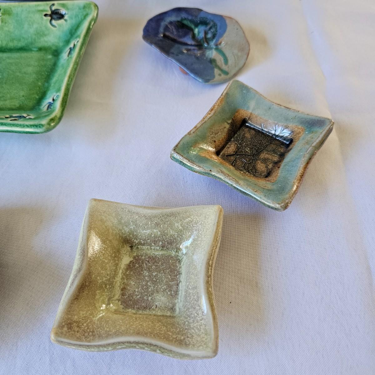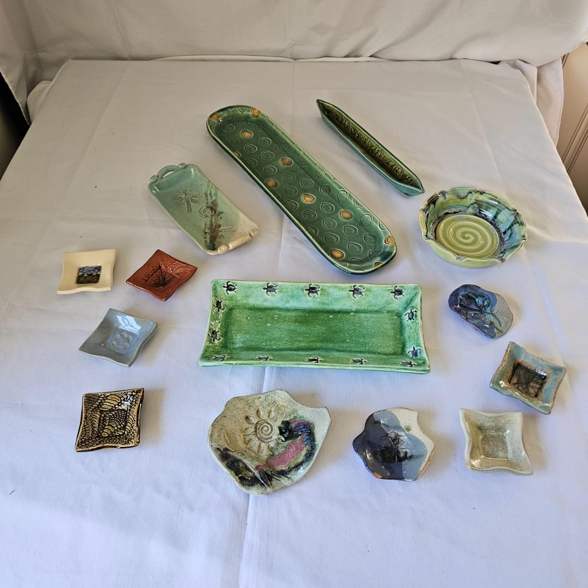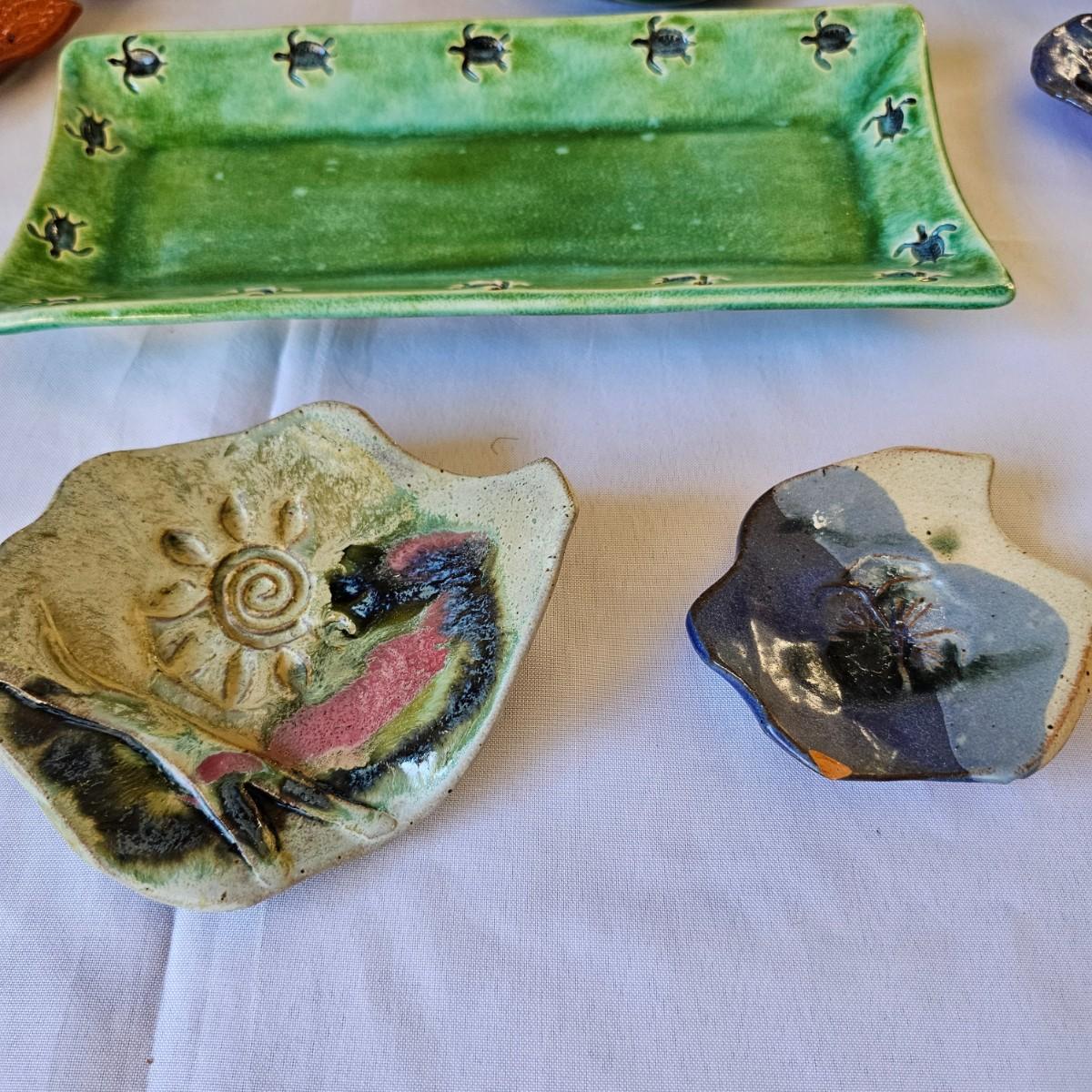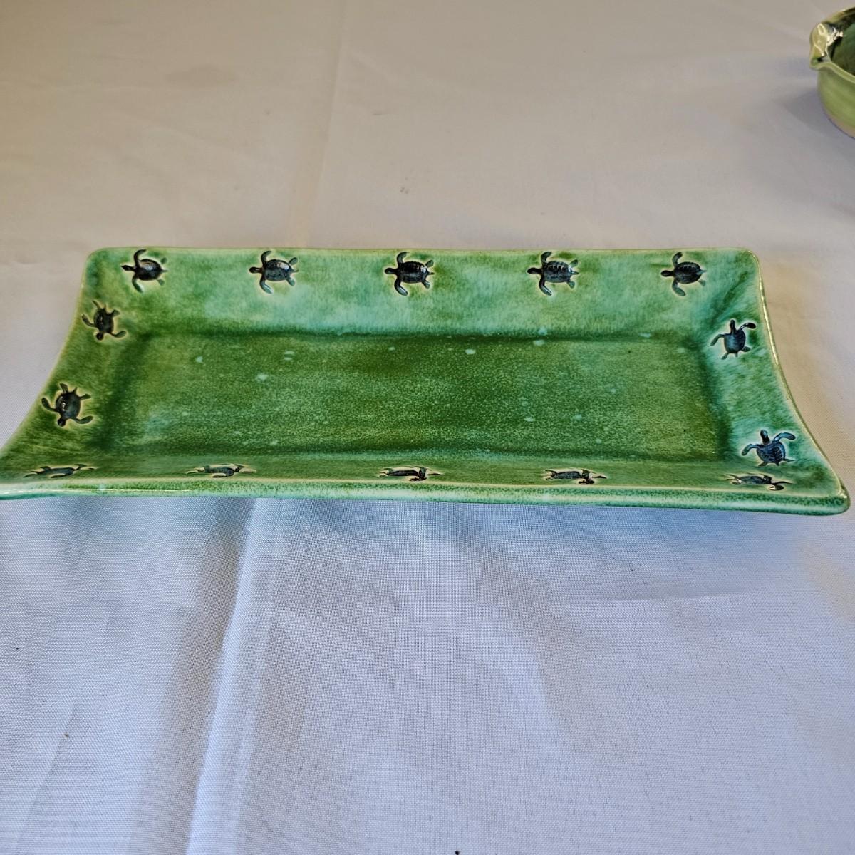 Squares, rounds, oblong. Fun, whimsical decorations and shapes to spice up your table. Longest piece is 19.5" x 5", turtle design plate is 12" x 5.5". Small squares with varying designs are 3" x 3" x 1"H. See photos for details. Shipping available.