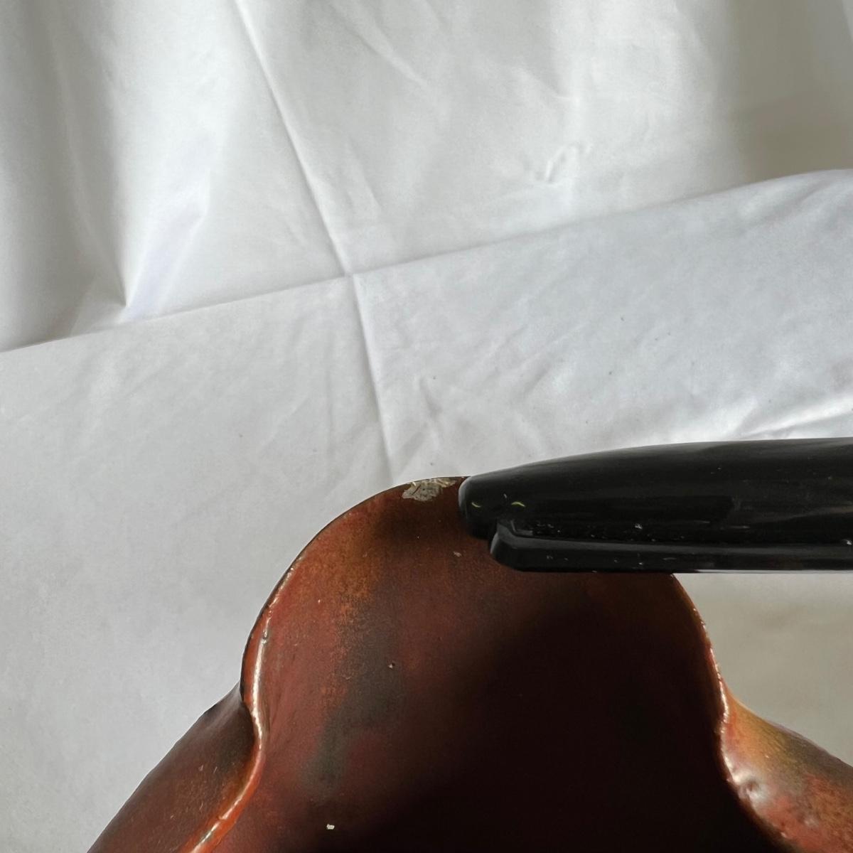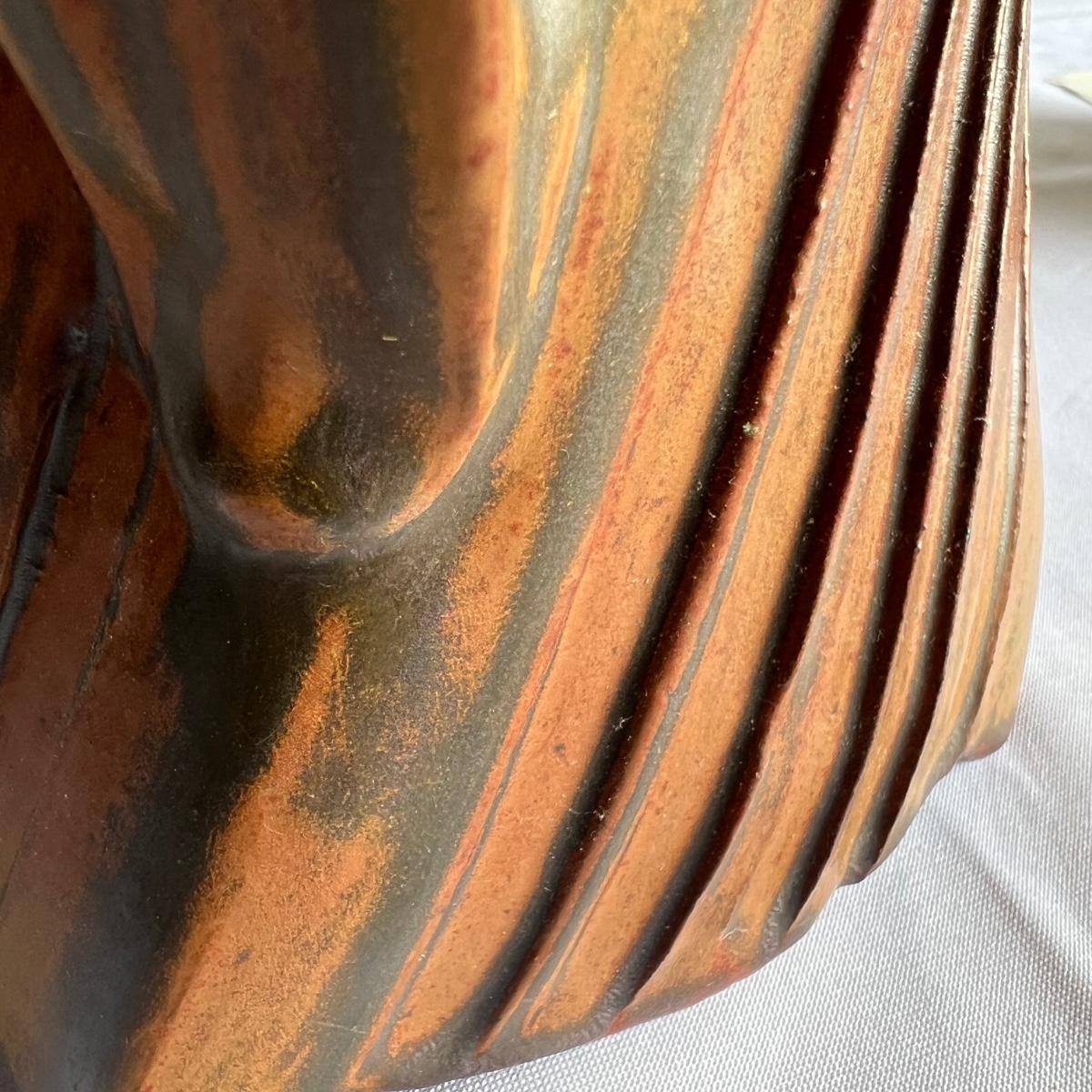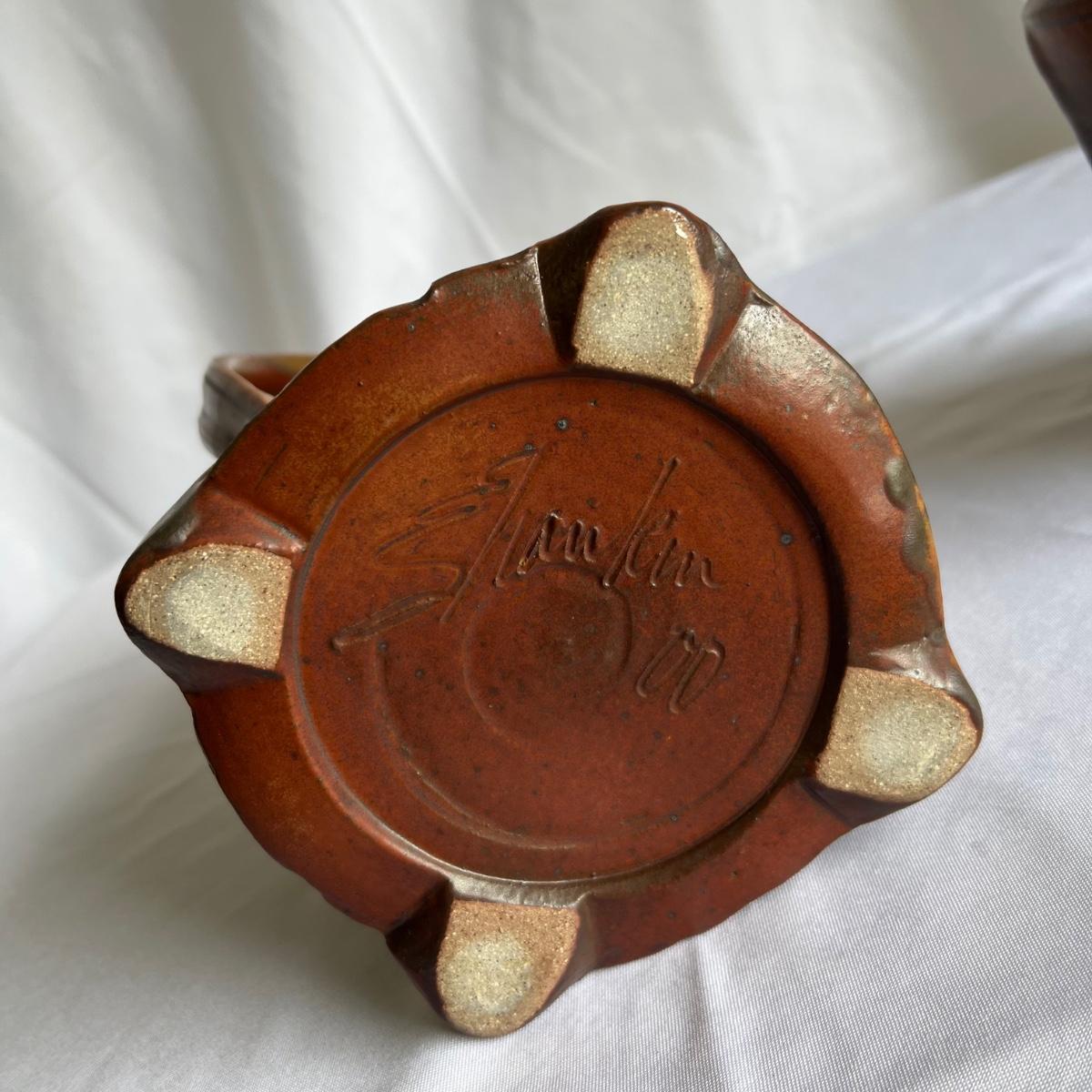 This stunning pottery pitcher has a signature that appears to read Shankin. Glazed with an iron red matte glaze, it measures 6” x 6” x 10”.
