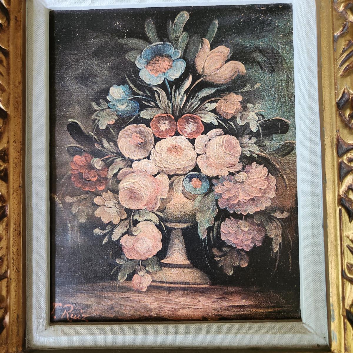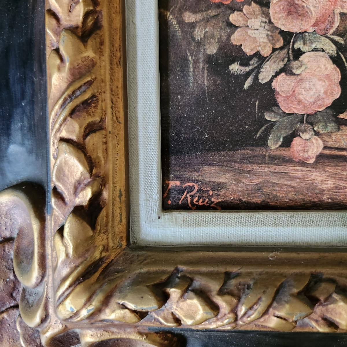 This auction lot is for a Texturized Print of Flowers on Canvas Nicely Framed . This very sweet vintage offering is nicely framed to showcase the beautiful flowers printed on canvas and mechanically texturized.. This painting is in a lightweight frame that enhances the work. The work is signed "T. Ruiz." The painting with framed measures about 16-inches square.