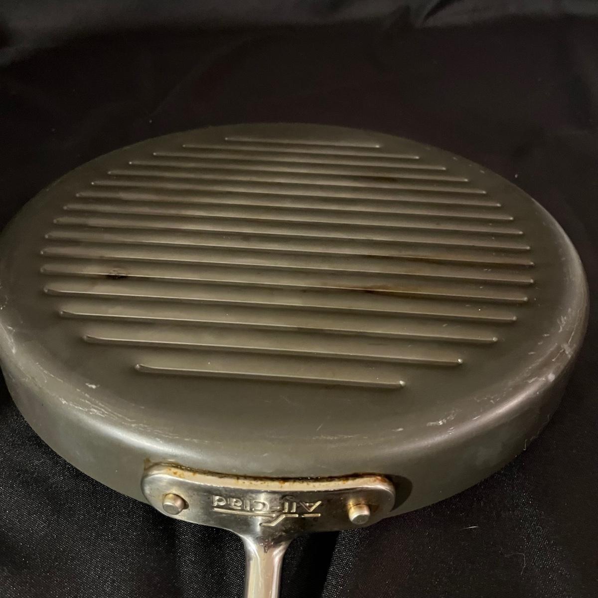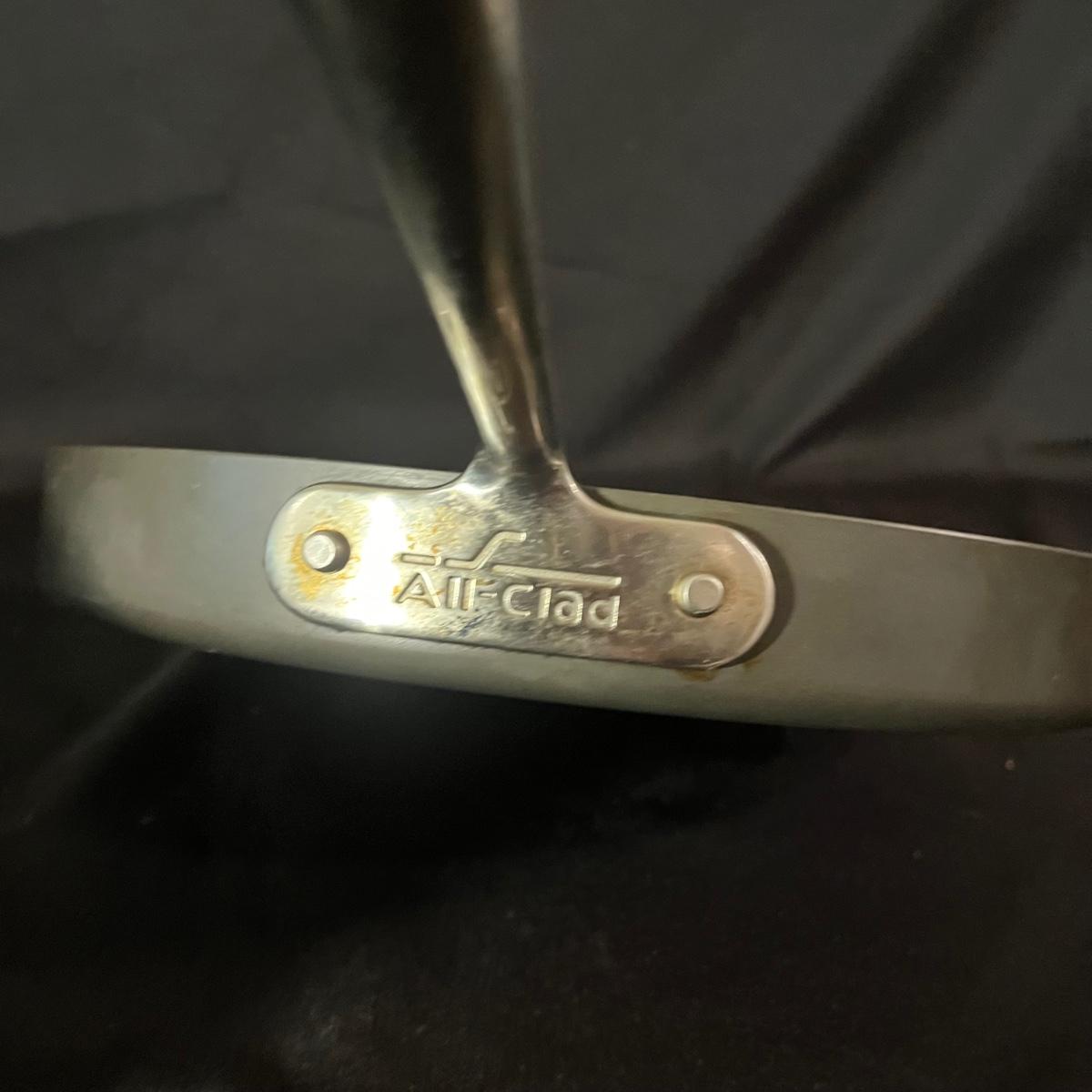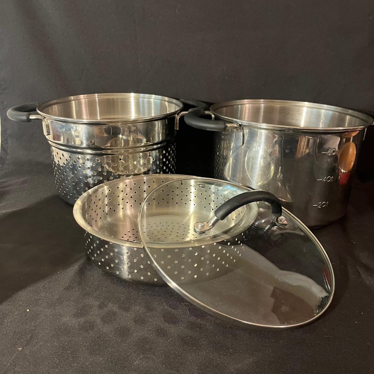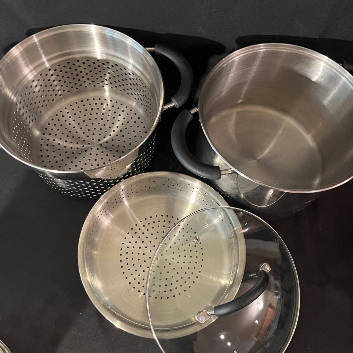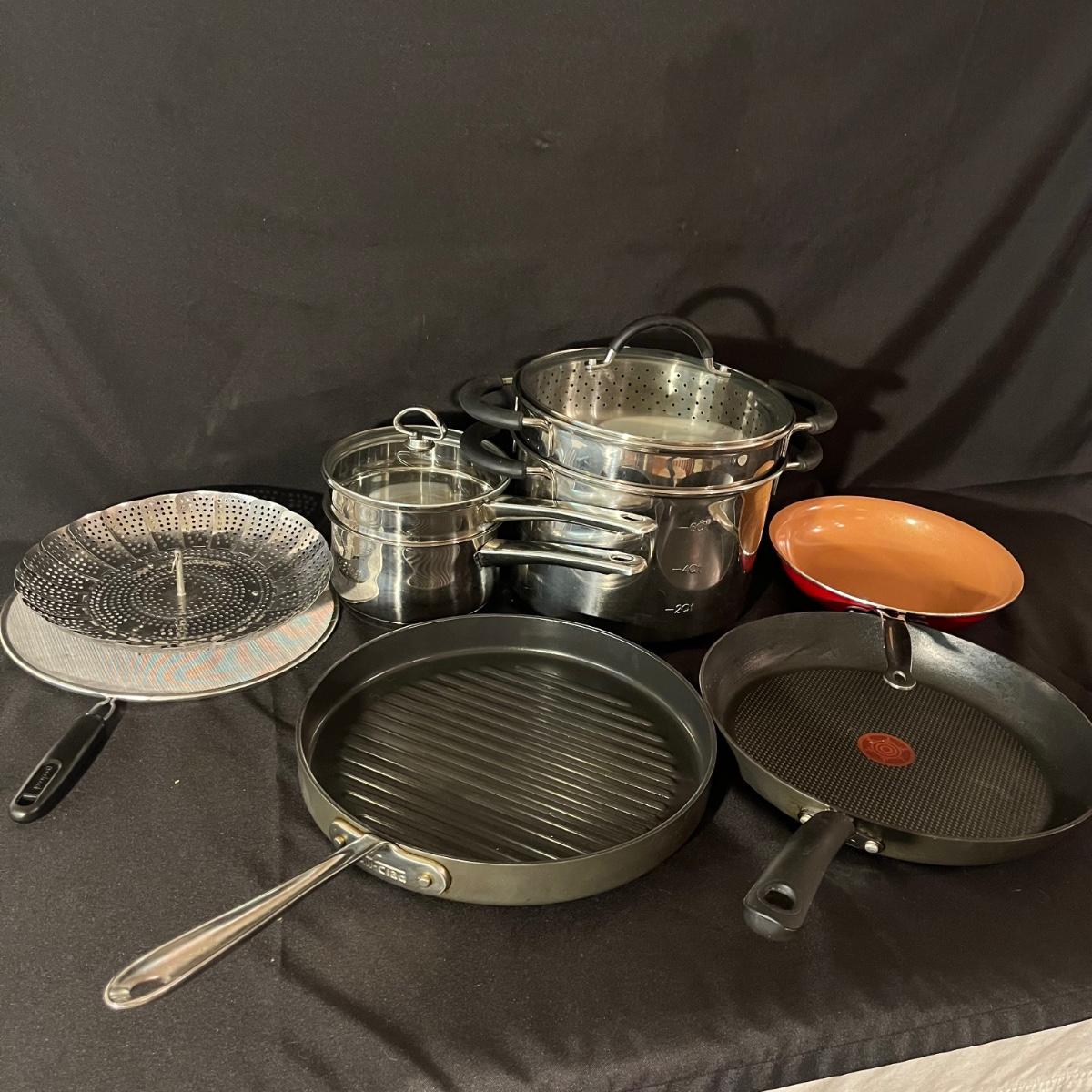 Lot includes a T-Fal, All-Clad and Bulbhead frying pans, Welco and eight quart steamer. Vegetable steamer and a grease screen. Largest pan measures 12”D x 1.5”H.