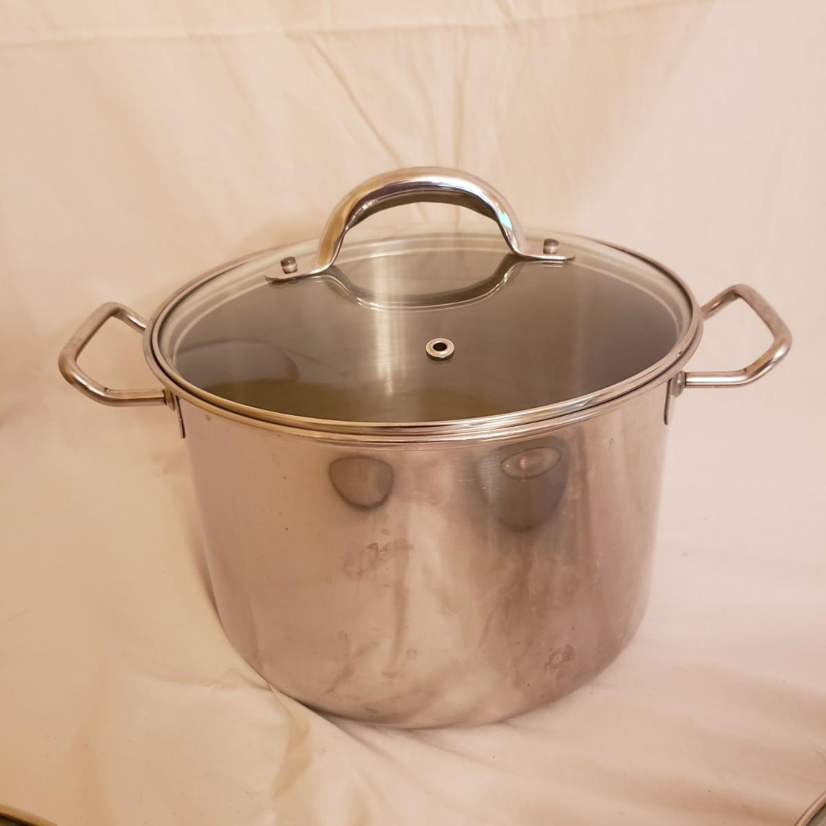 This lot has 6 T-Fal stainless steel pots all with glass lids, with the exception of the 8" saute pan, but the 3.2 quart lid fits on it. In this lot there is a 1.1 quart sauce pan, a 12" skillet, a 3.2 quart sauce pan, an 8 quart stock pot, a 2.2 quart sauce pan and an 8" saute pan.