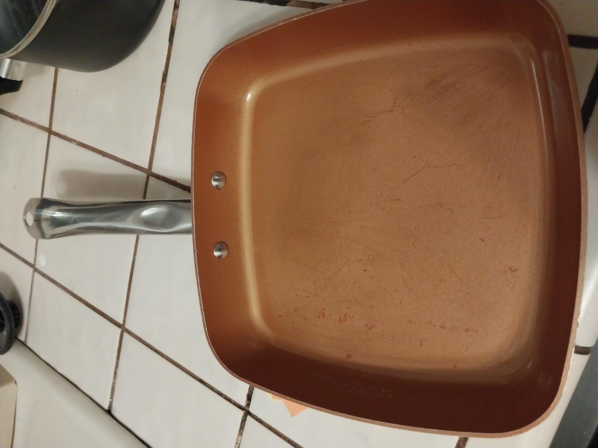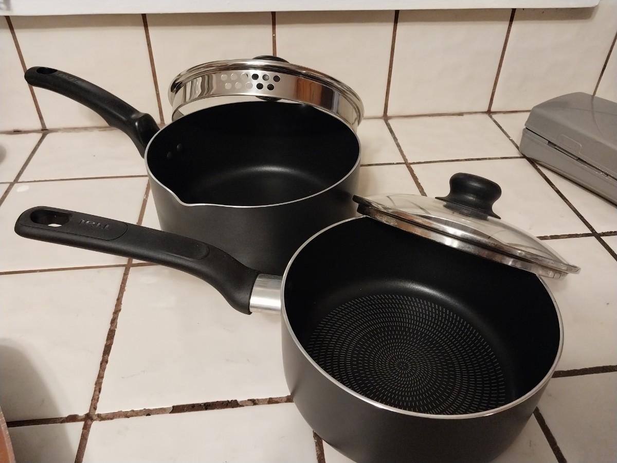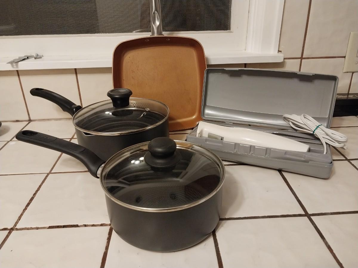 TFAL POTS WITH LIDS-COPPER PAN AND HAMILTON BEACH ELECTRIC KNIFE