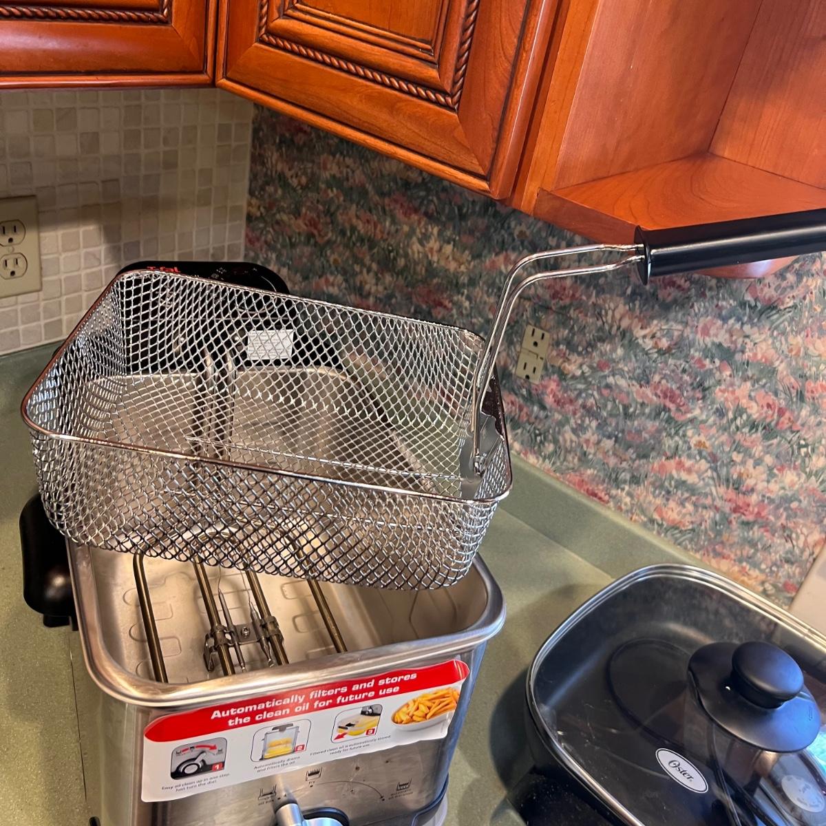 Three electrical kitchen appliances all powered on when plugged in. No signs of previous use of the T-Fal fryer, it’s very clean. It measures 9” x 17” x 13”H.